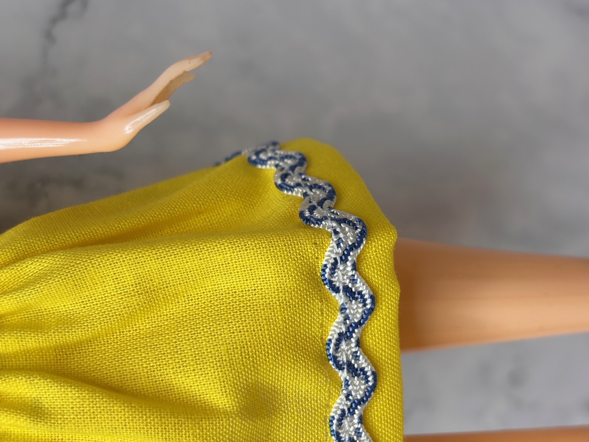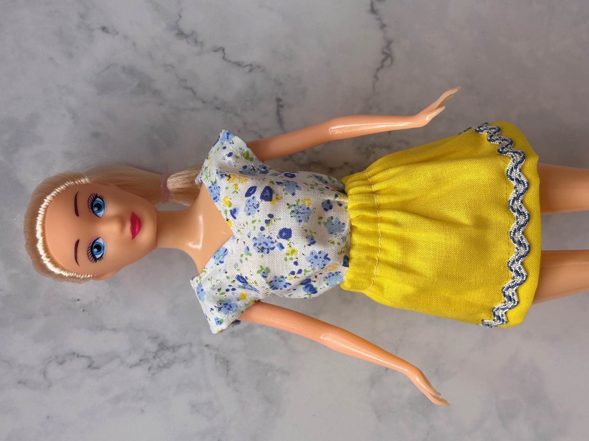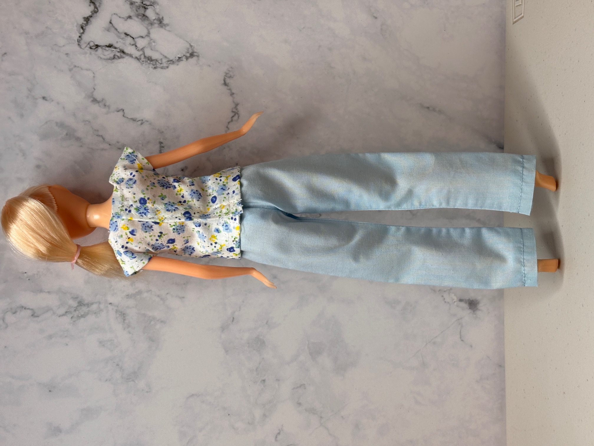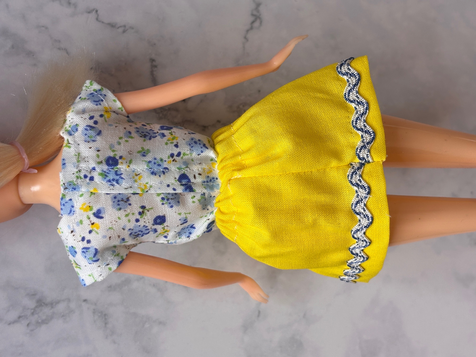 These doll clothes are made from mostly cotton fabric and sewn on a sewing machine.