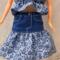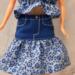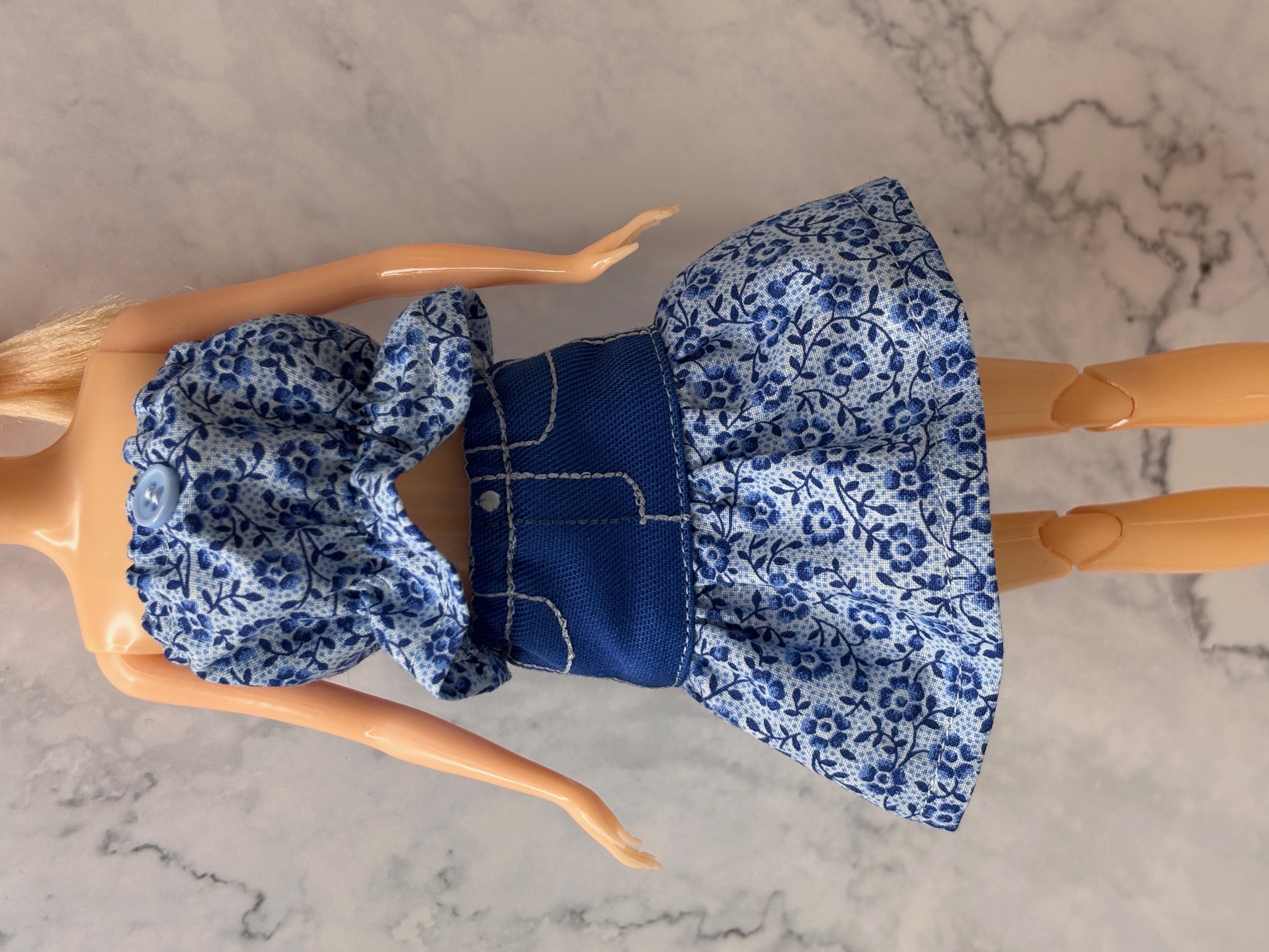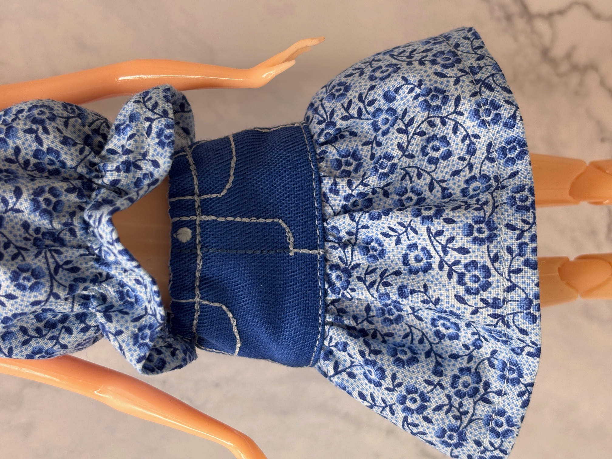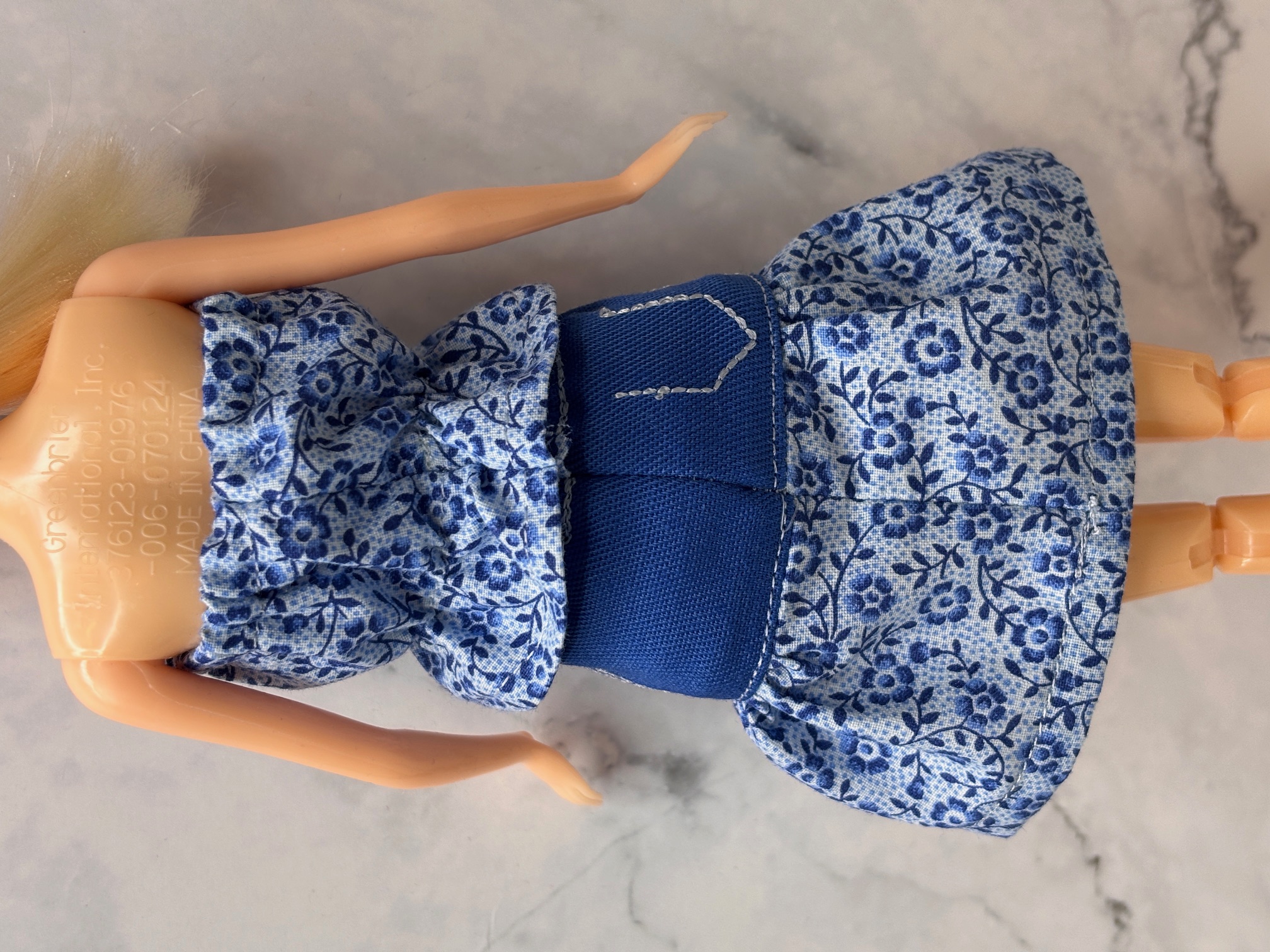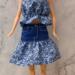 This skirt and top are so cute. Blue skirt with light blue thread trim sewn on with care. Blue floral print attached skirt with matching top.