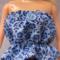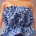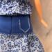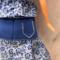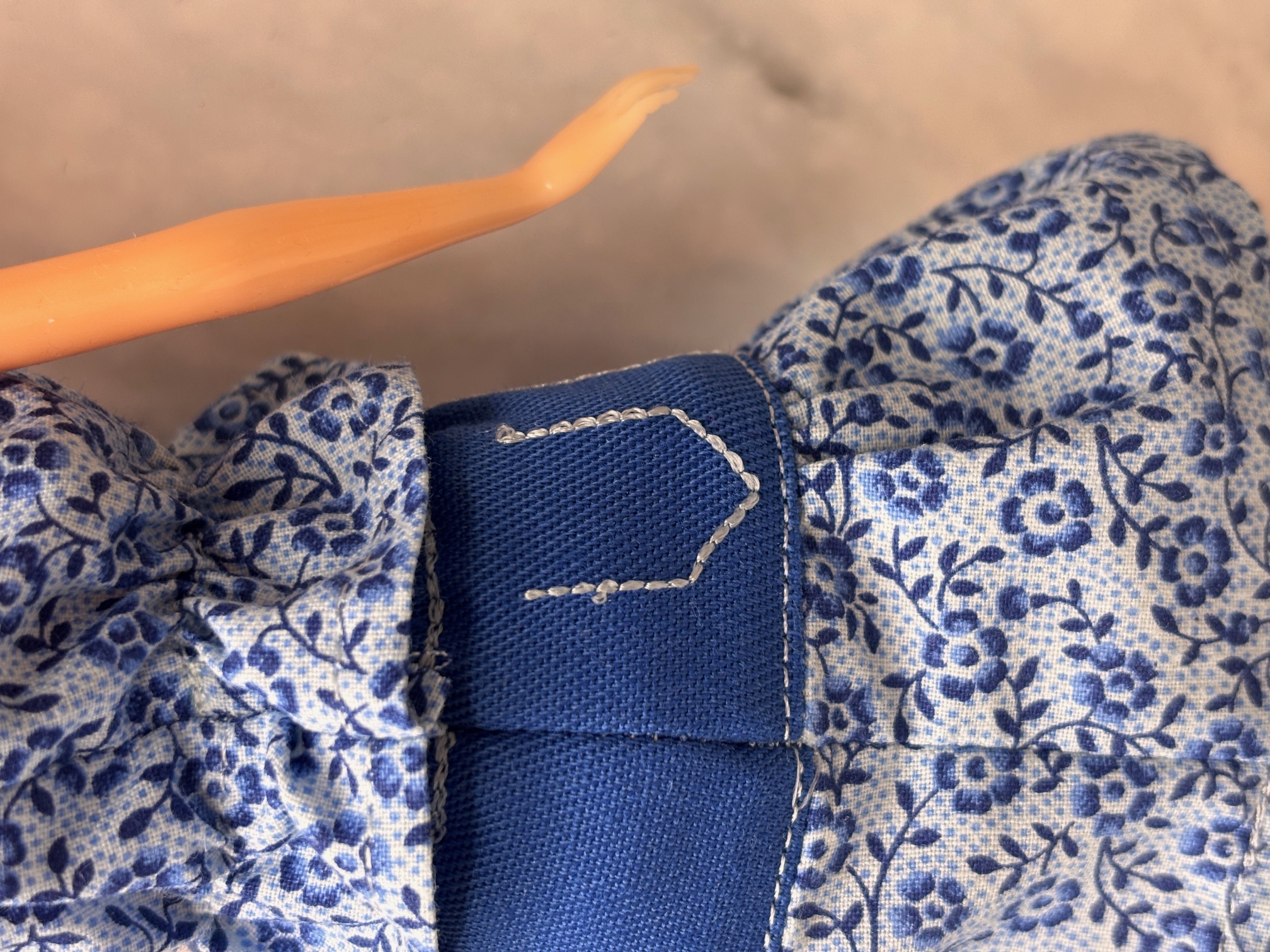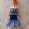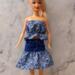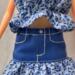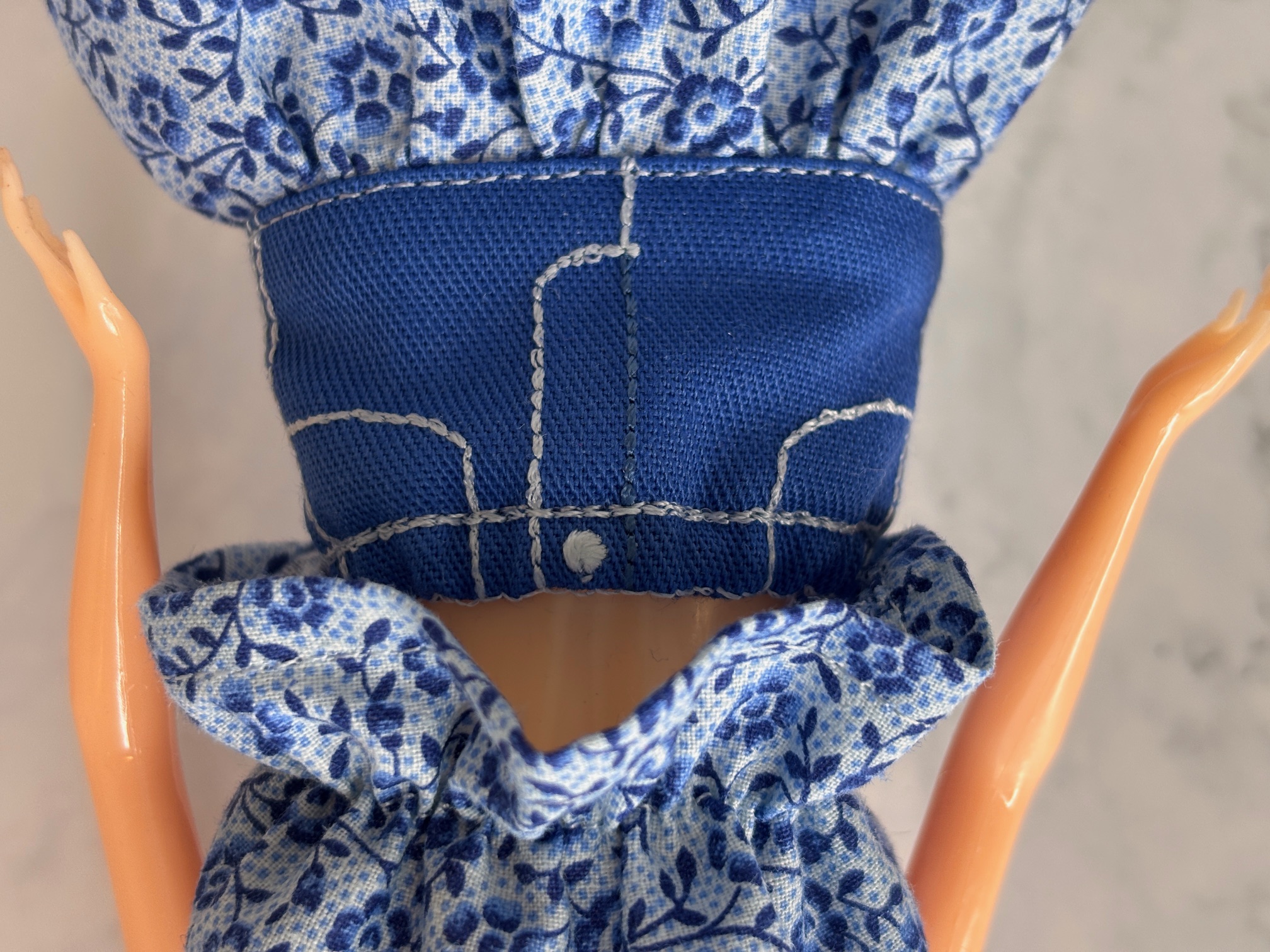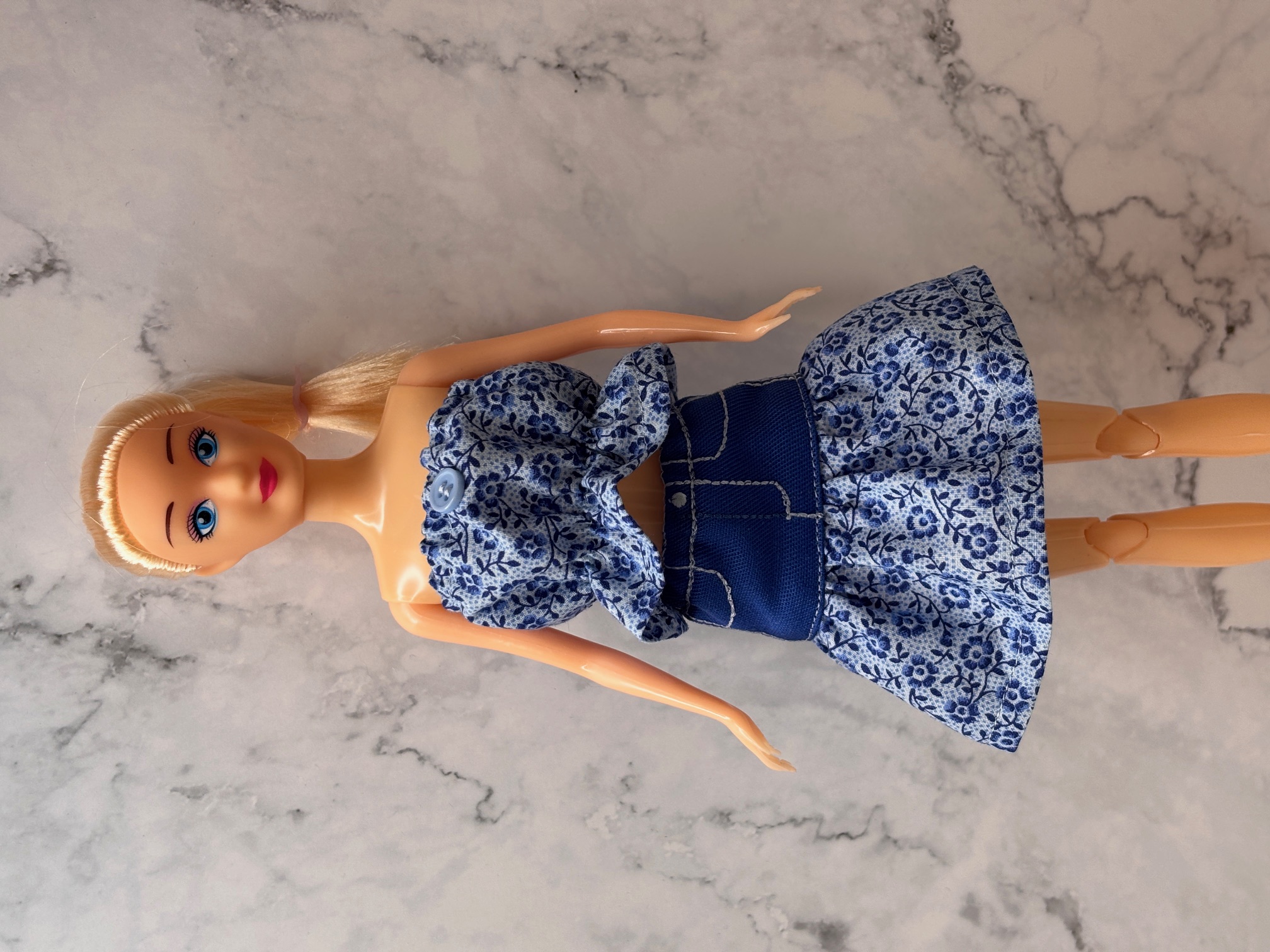 This skirt and top are so cute. Blue skirt with light blue thread trim sewn on with care. Blue floral print attached skirt with matching top.