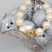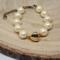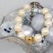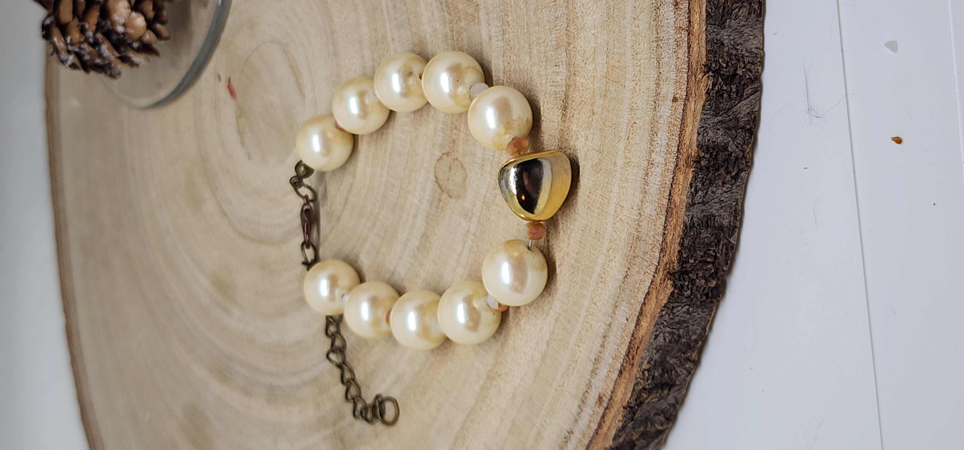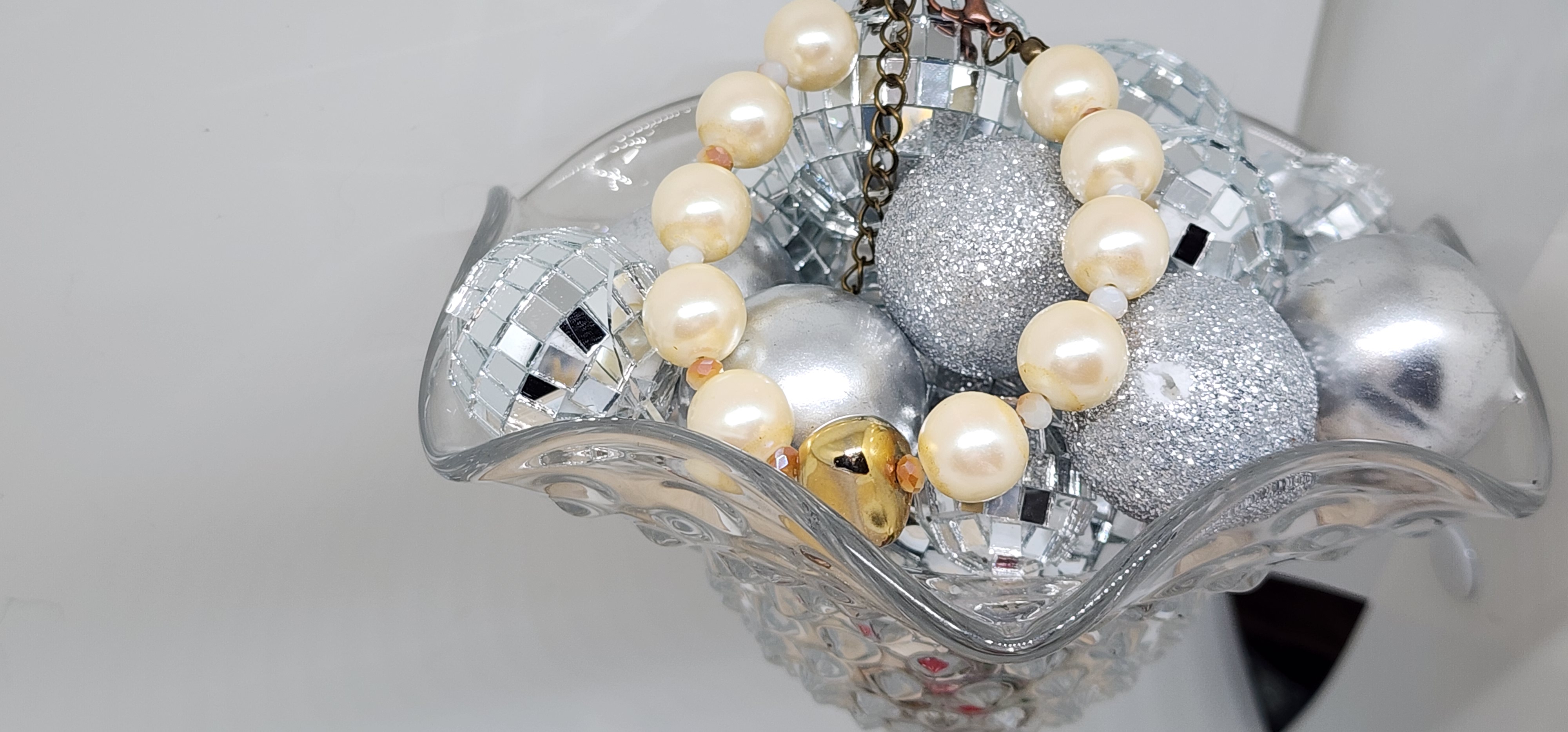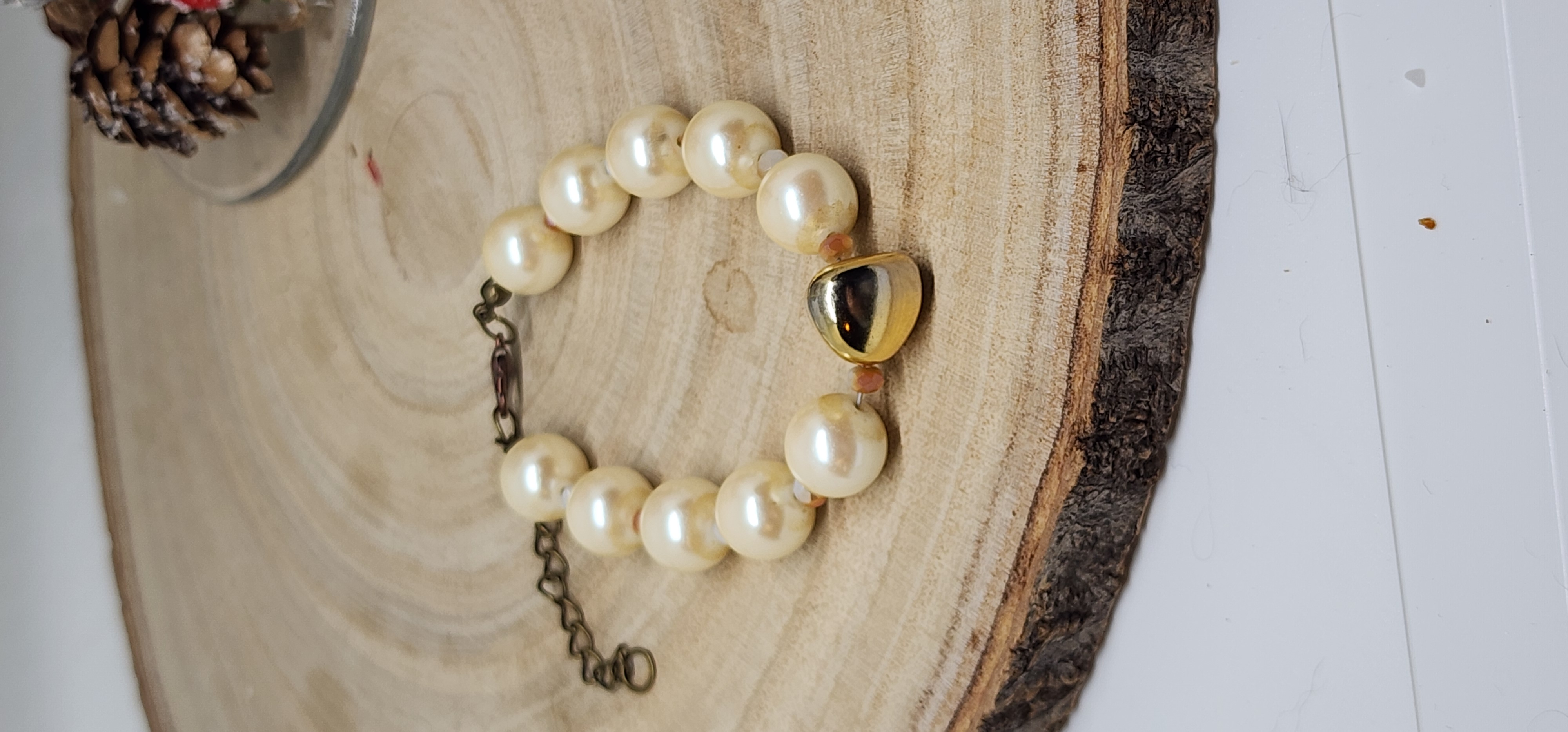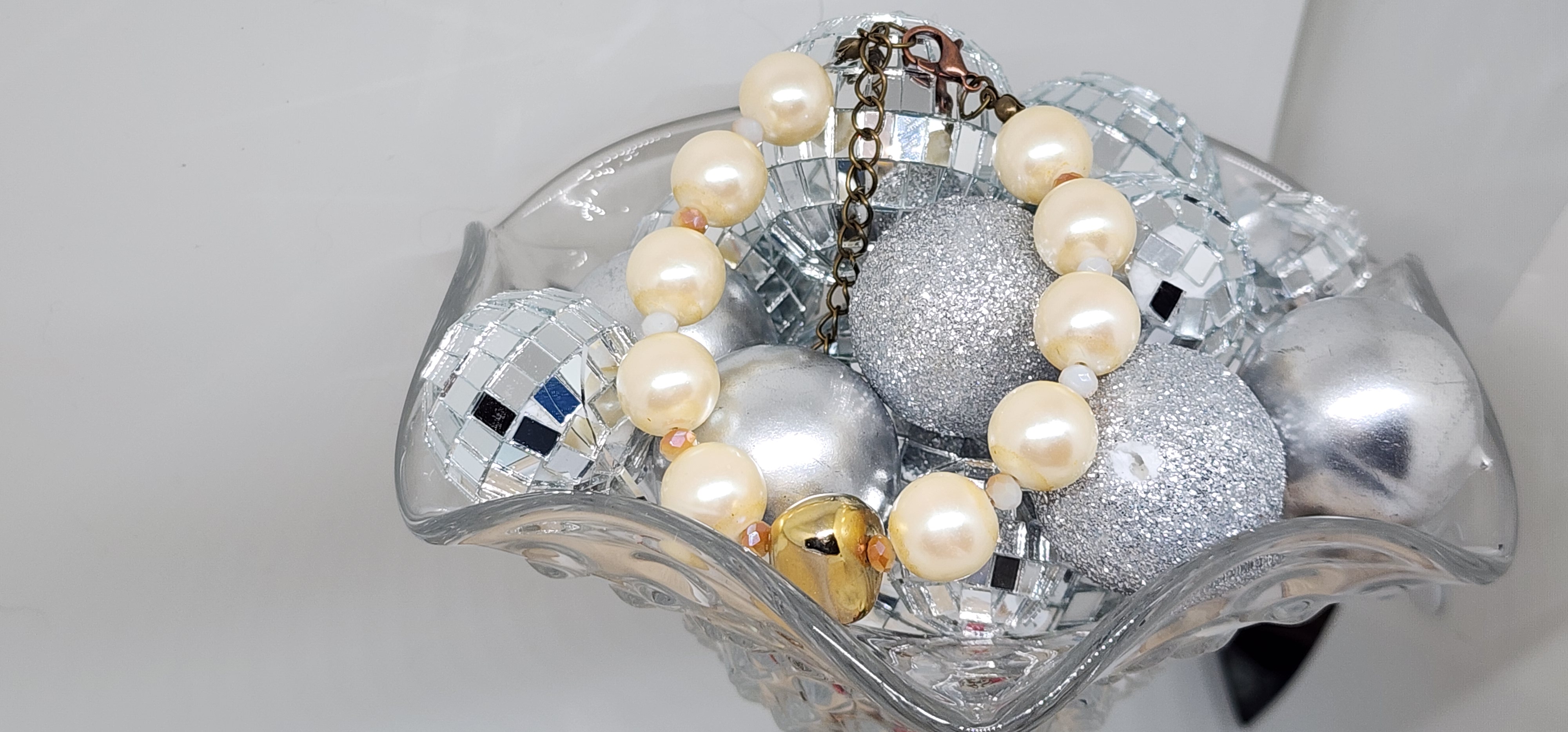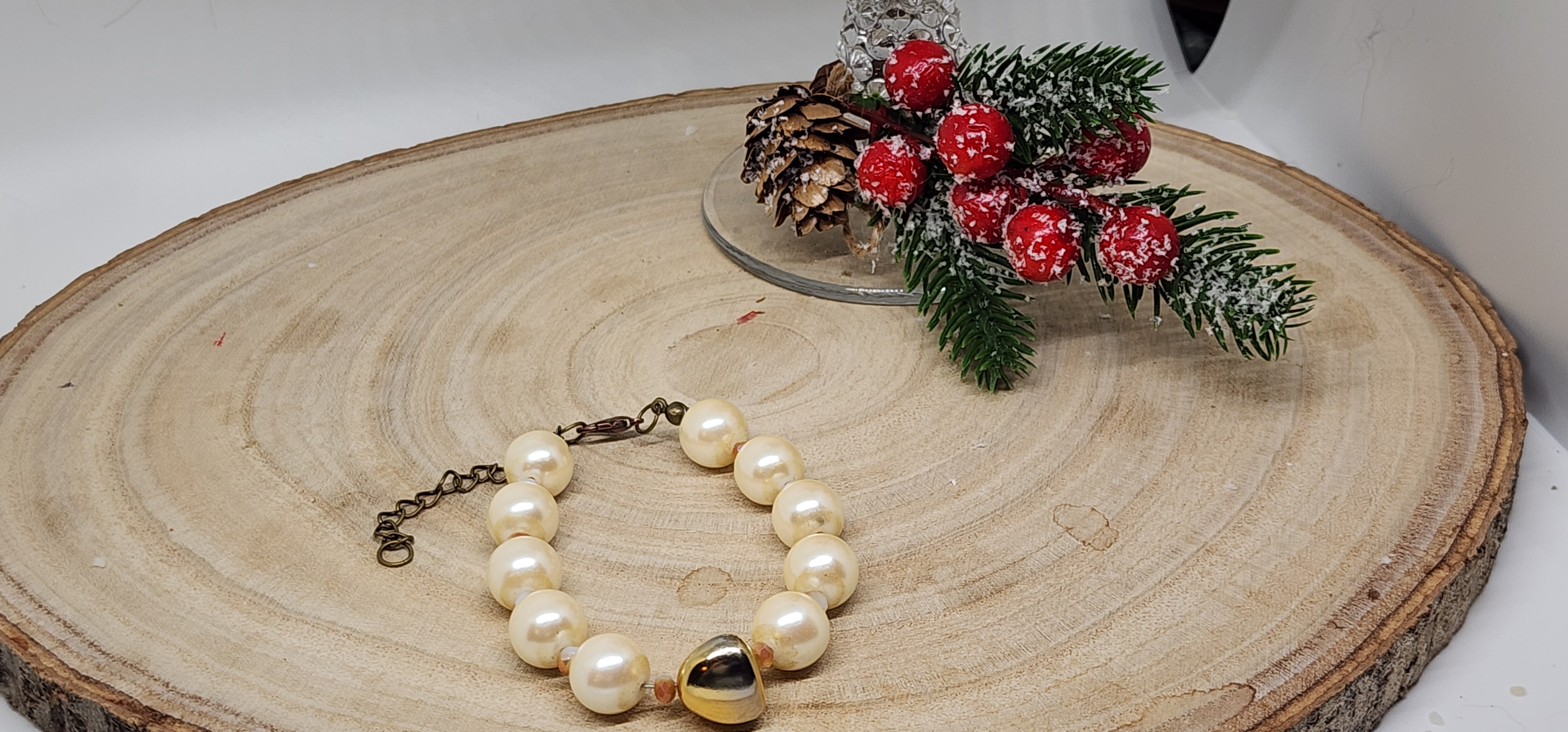 Celebrate the magic of the season with this handcrafted Pearl Bracelet, a cozy blend of charm and festive sparkle. Featuring large, glossy cream-colored pearls and a shimmering gold-silver centerpiece, this bracelet evokes the warmth of snowy pine forests and twinkling holiday lights. The antique-style chain and clasp add a vintage touch, making it perfect for winter gatherings, holiday gifting, or adding a little seasonal joy to your everyday look.