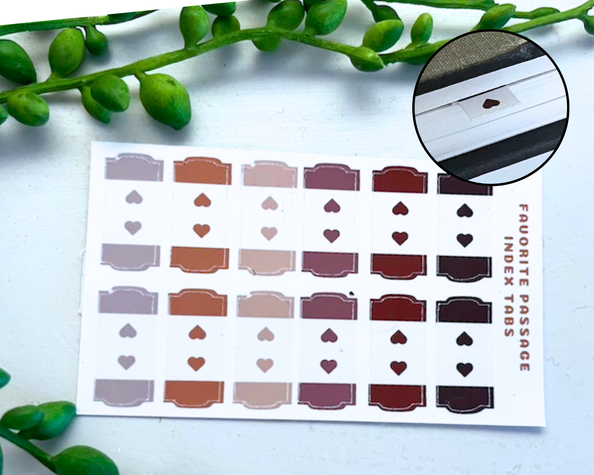 The Favorite Passage Heart Tabs in the Coffee Girl palette include 24 self-adhesive index stickers in warm, earthy tones.