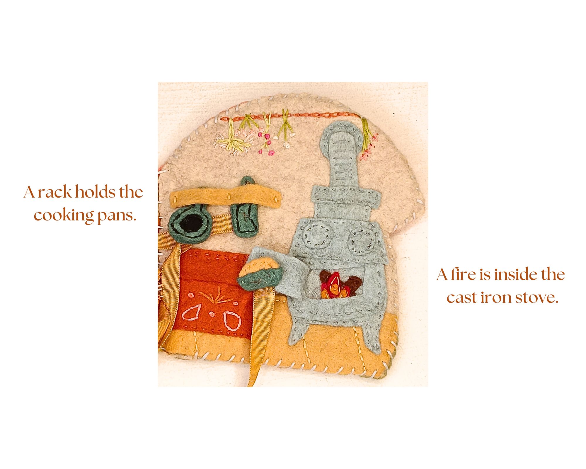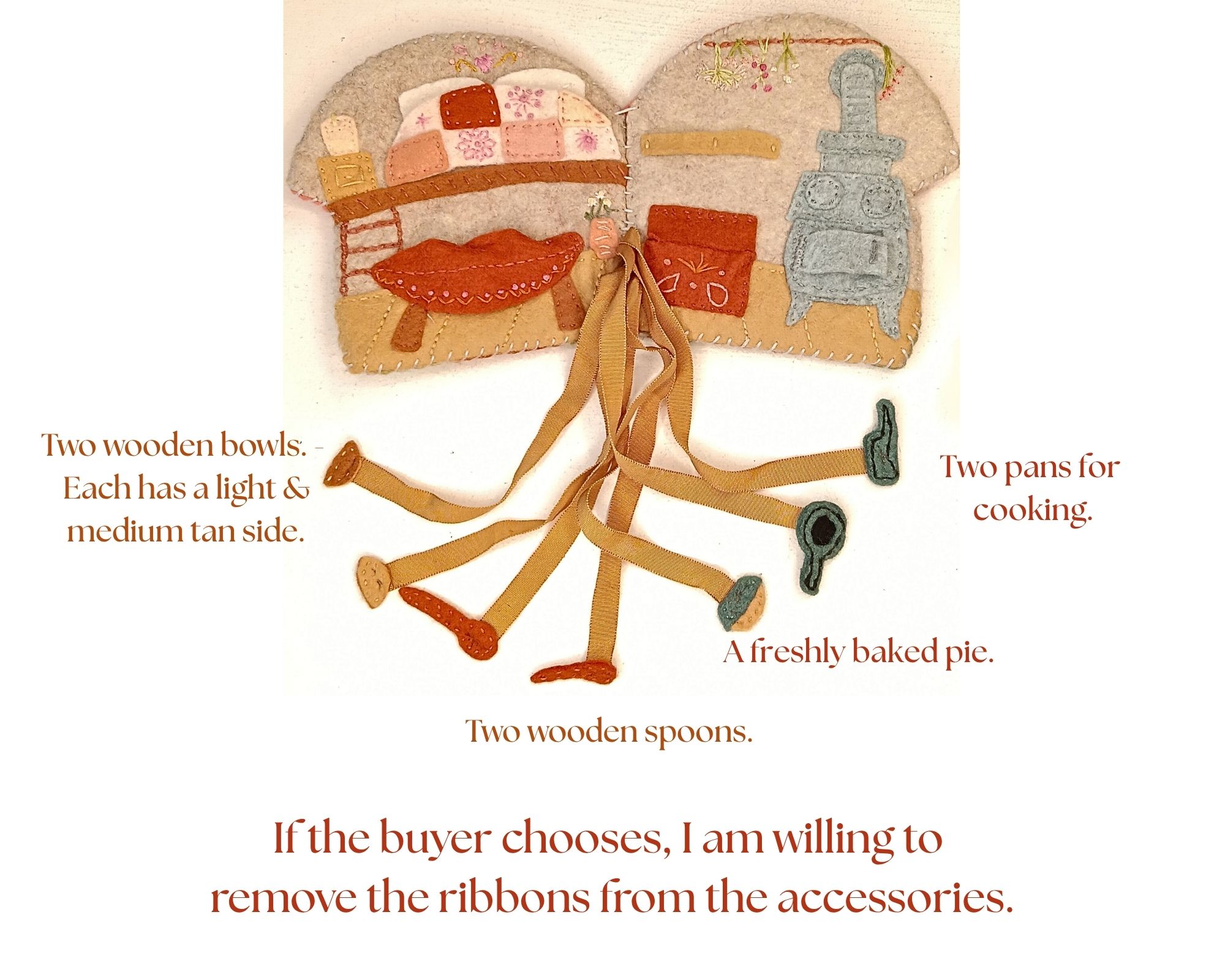 The scent of fresh pie fills the kitchen, just out of the oven and ready to share at the table. Tiny kitchen utensils — each one sewn securely onto its own ribbon — hang neatly in place, adding charm and dimension.