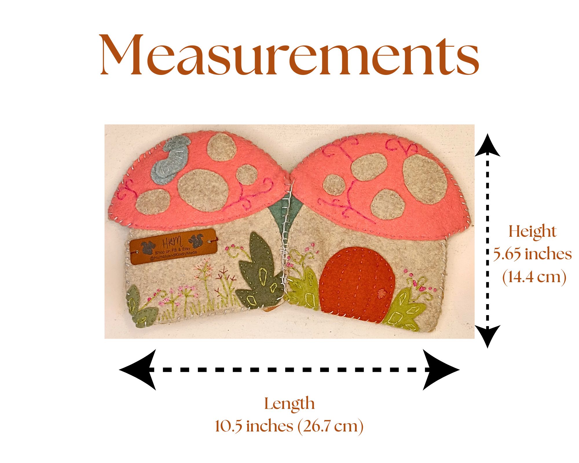 Handmade felt mushroom house quiet book with Grandma & Grandpa Gnome dolls — heirloom-quality woodland toy crafted for imaginative play.