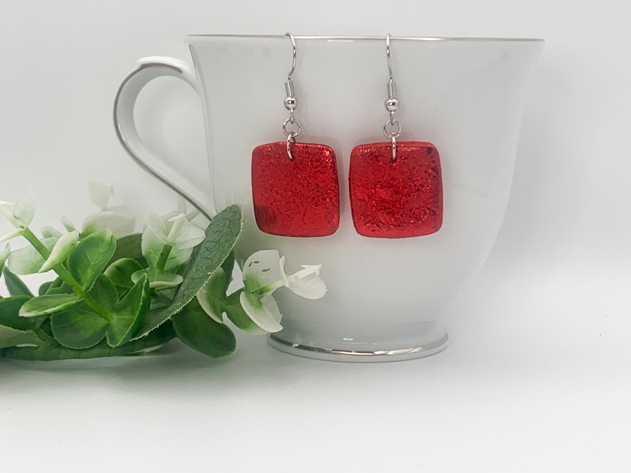 Bold, modern, and shimmer from every angle – these red foil square earrings are made to turn heads.