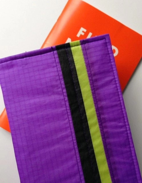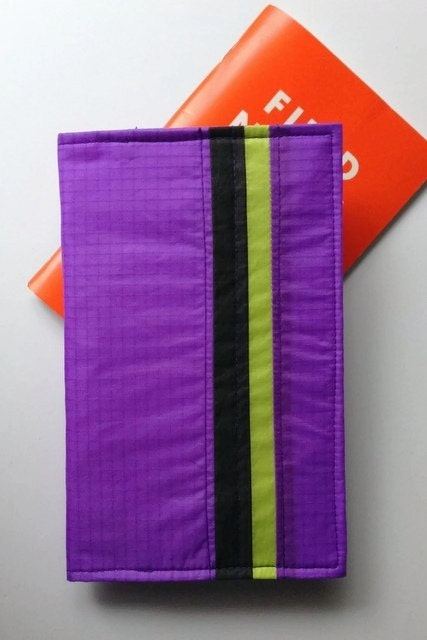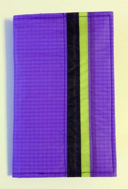 This minimalist cover for the small notebooks measures 3 and 3/4 inches wide by 6 inches high when closed. Made from interfaced ripstop nylon of recycled paragliders the simple case has two interior pockets for credit cards, cash, or ID. The case is almost weightless.