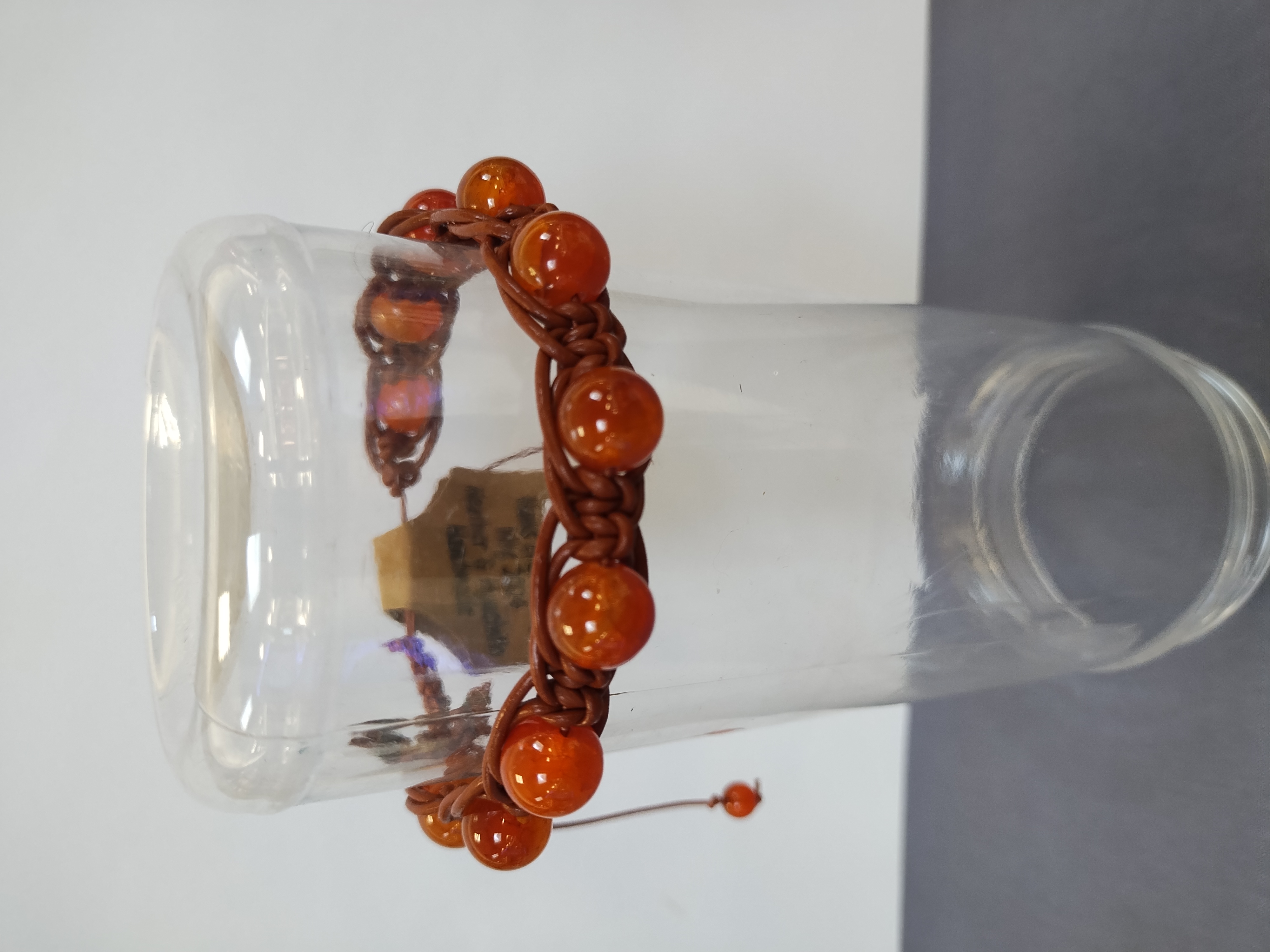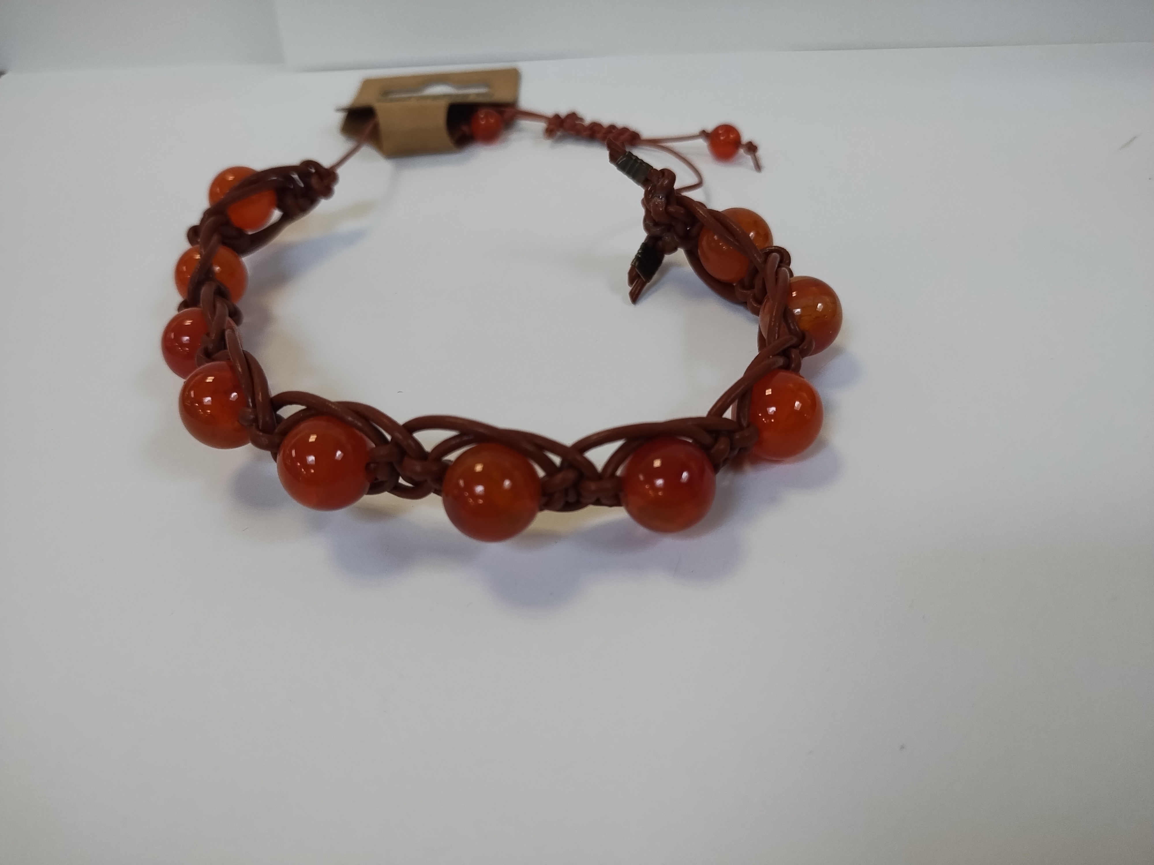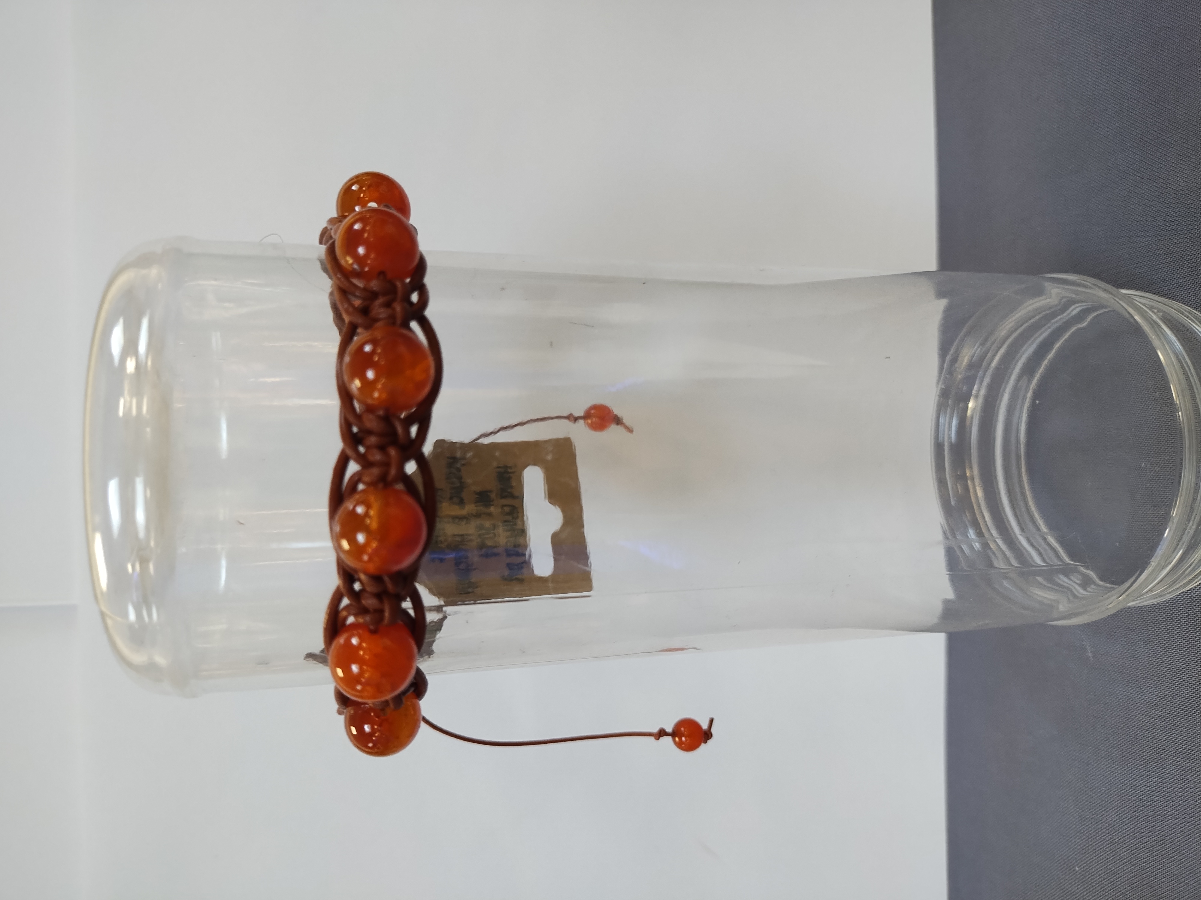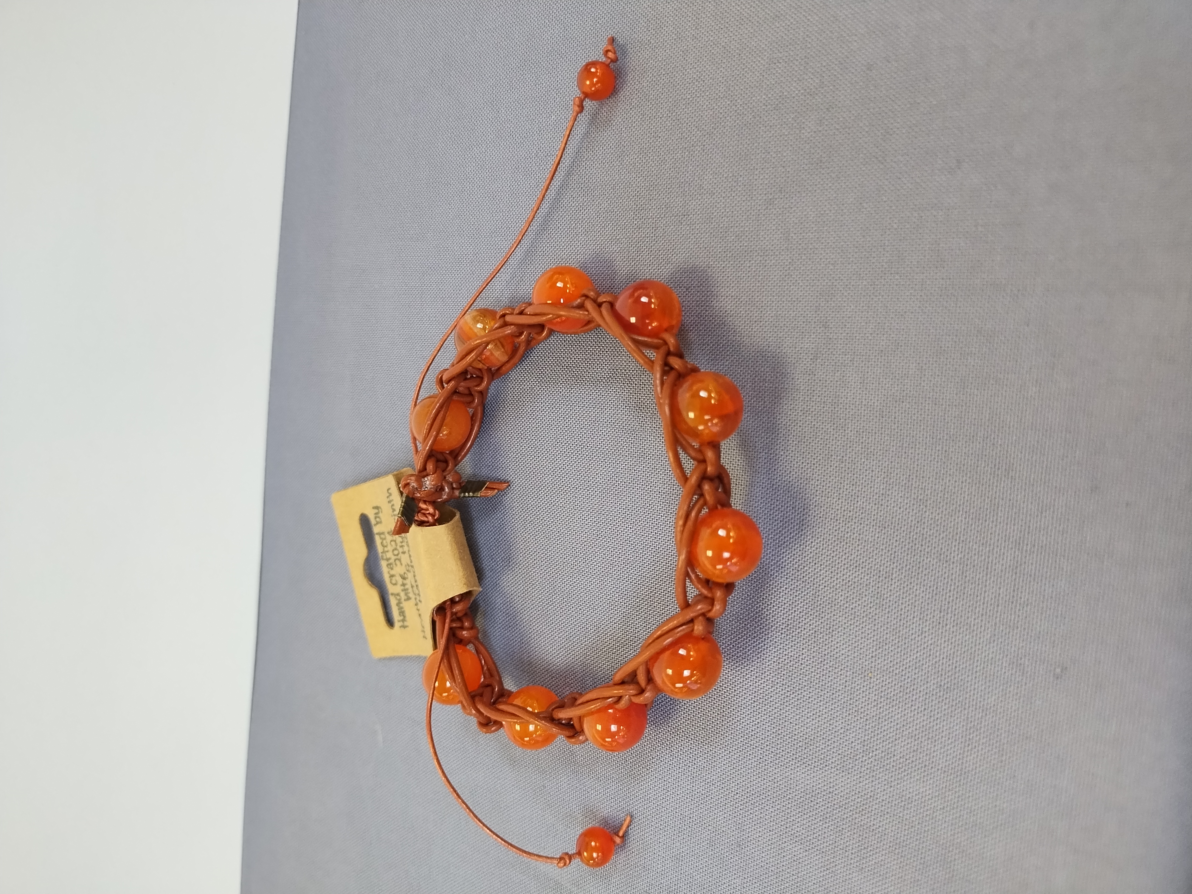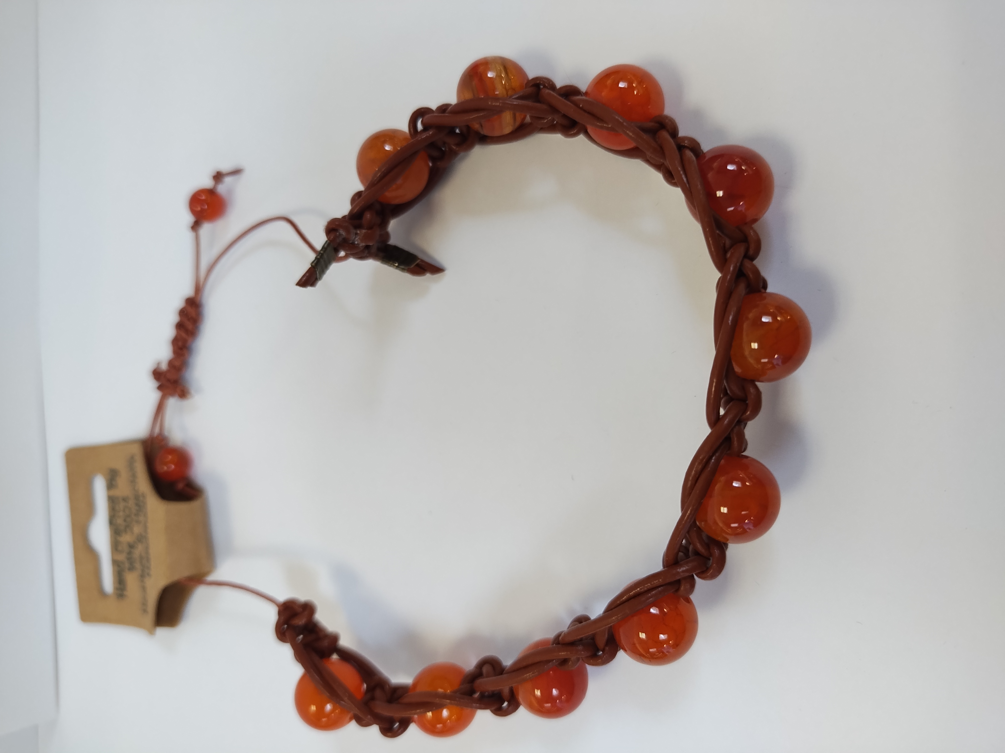 Hand knotted leather cord, adjustable knot clasp, made in my tiny house assisted by Oberon (our toy Australian shepherd) as well as Athena and Dionysus (our 2 ginger cats).