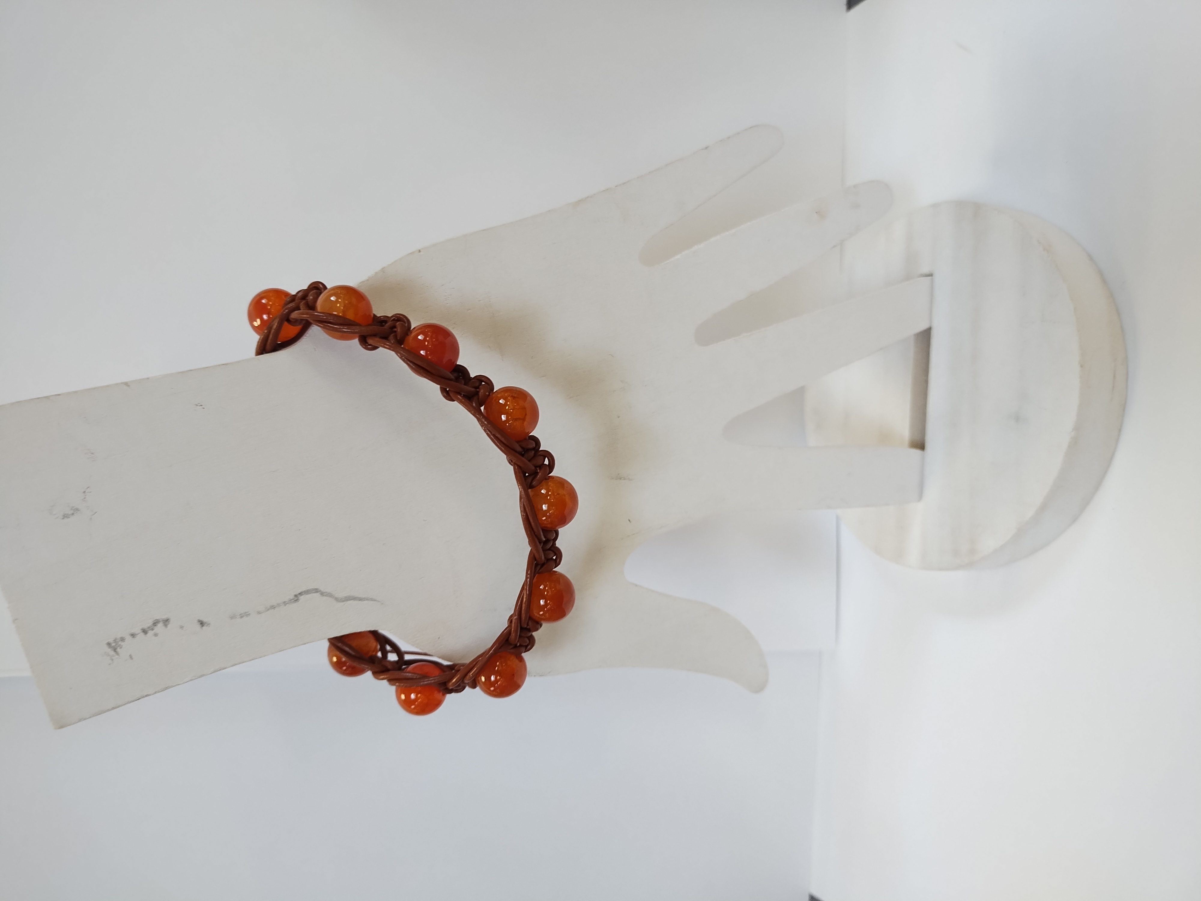 Hand knotted leather cord showcases these vibrant fire agate stones. Created with an adjustable clasp this piece will fit a variety of wrists and ankles.
