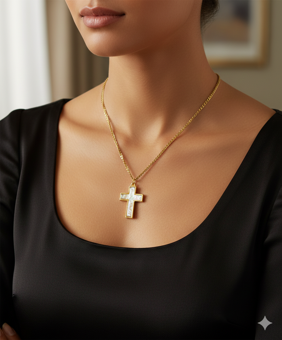 Discover faith and elegance with this stunning cross pendant necklace. The classic gold-toned setting frames a captivating iridescent dichroic inlay called Fire Pearl, which catches the light with a beautiful spectrum of soft, ethereal colors. The unique patterns within the cross make each piece distinctive and eye-catching.