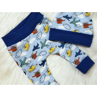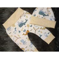 Such a fun fishing themed baby set! This 0-3 month size Cotton/spandex knit pants, and knotted baby hat set, has coordinating fabric at the waistband and legs.