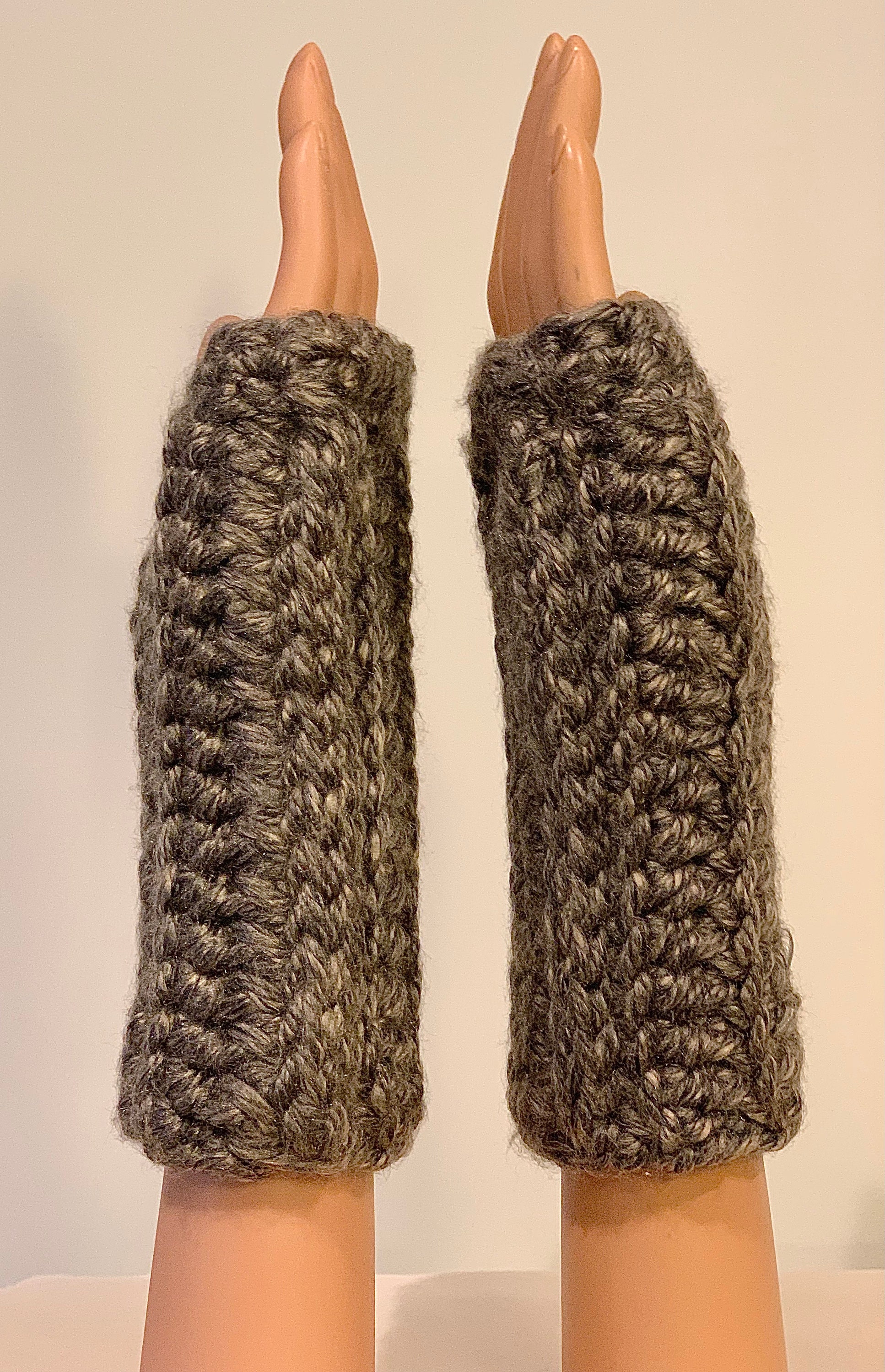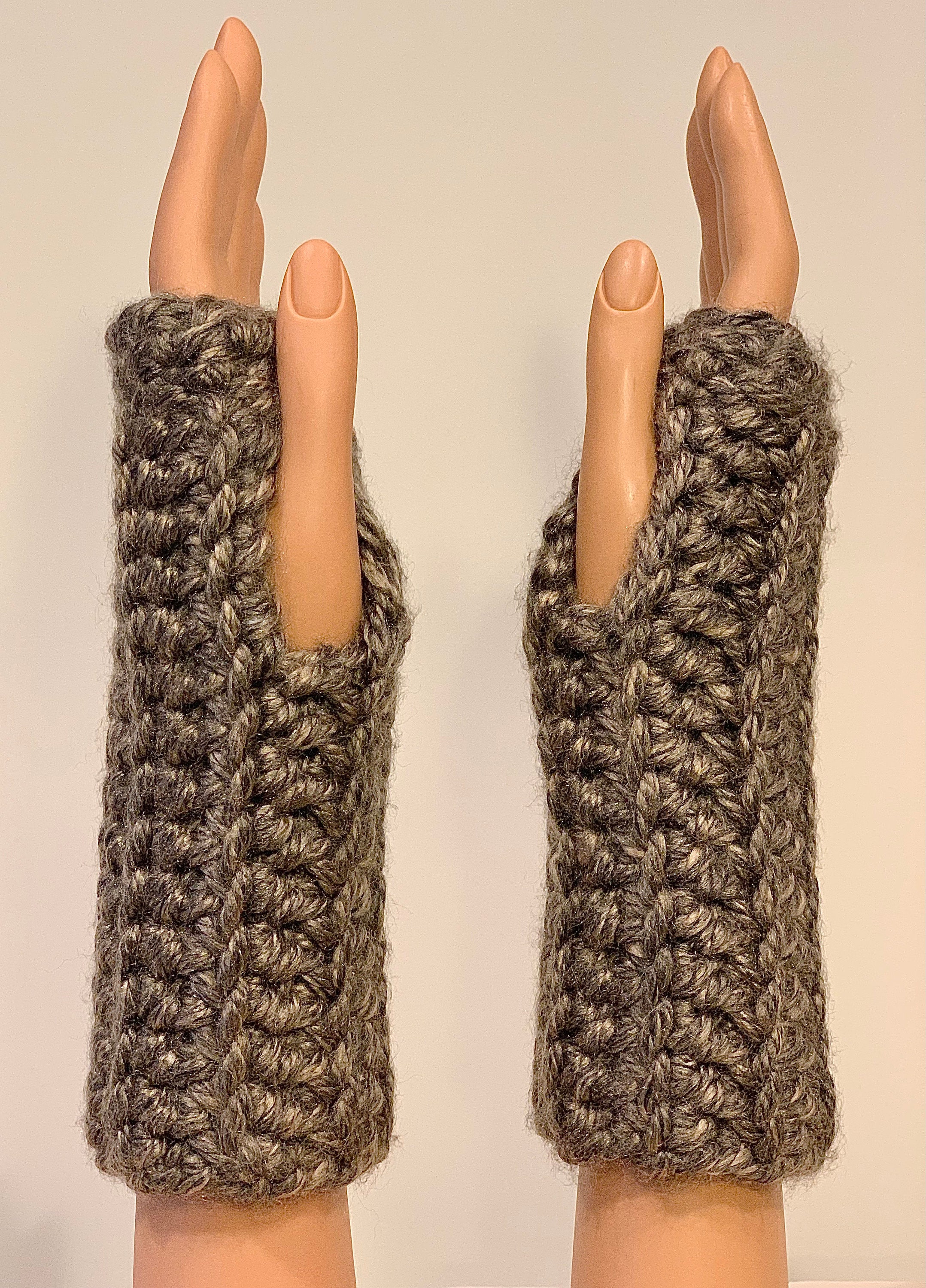 These fingerless mittens are suitable for both outdoor and indoor use. They are stylish and cozy, coordinating beautifully with my eternity scarves and other crocheted creations (hats, headbands, clip-on flowers, and more).