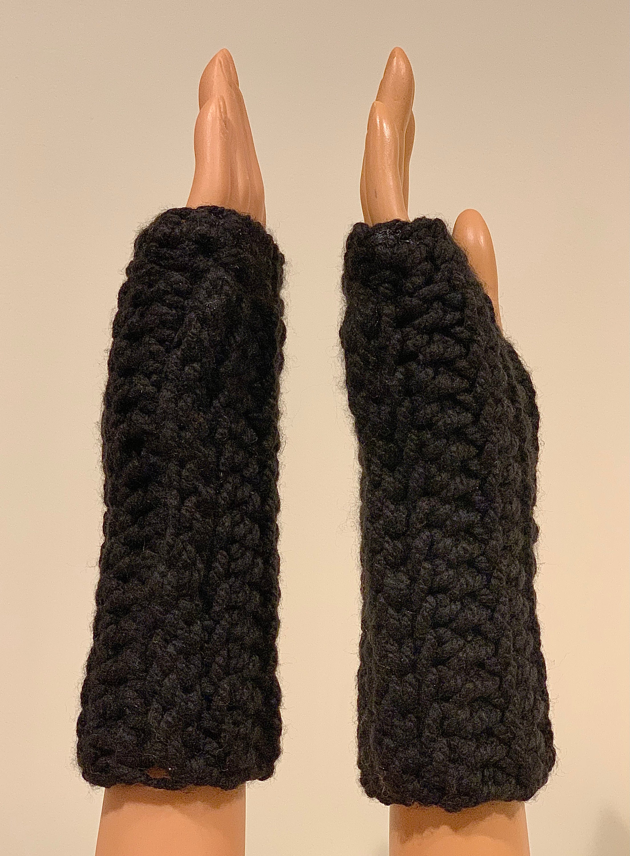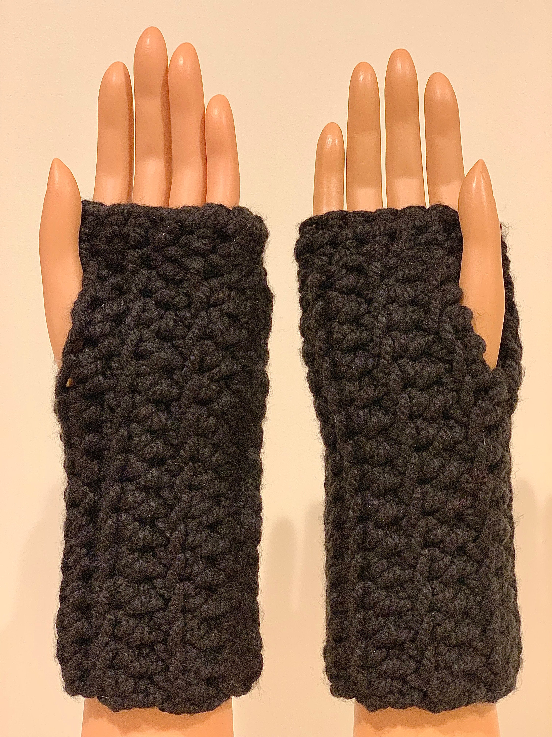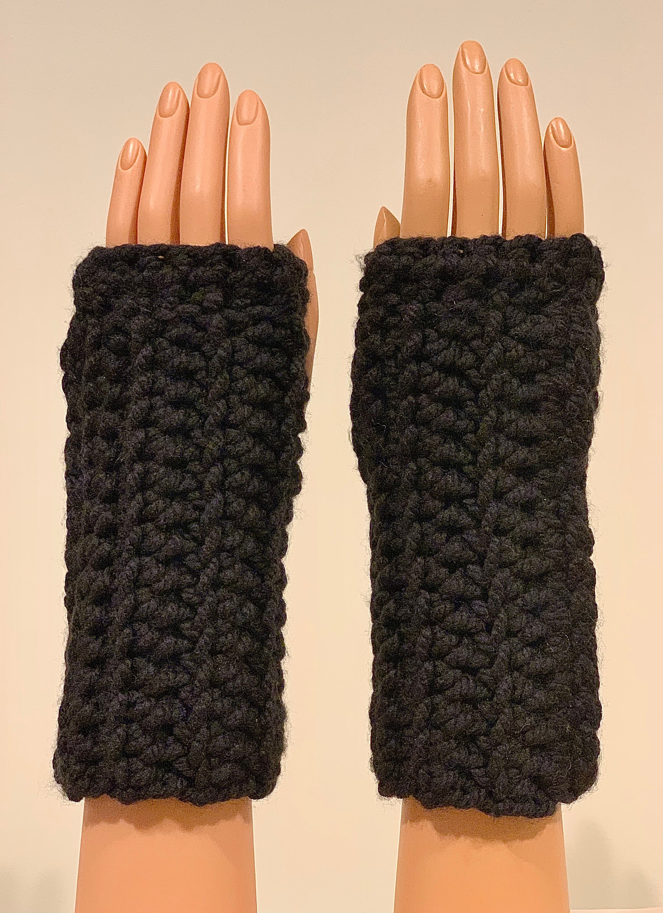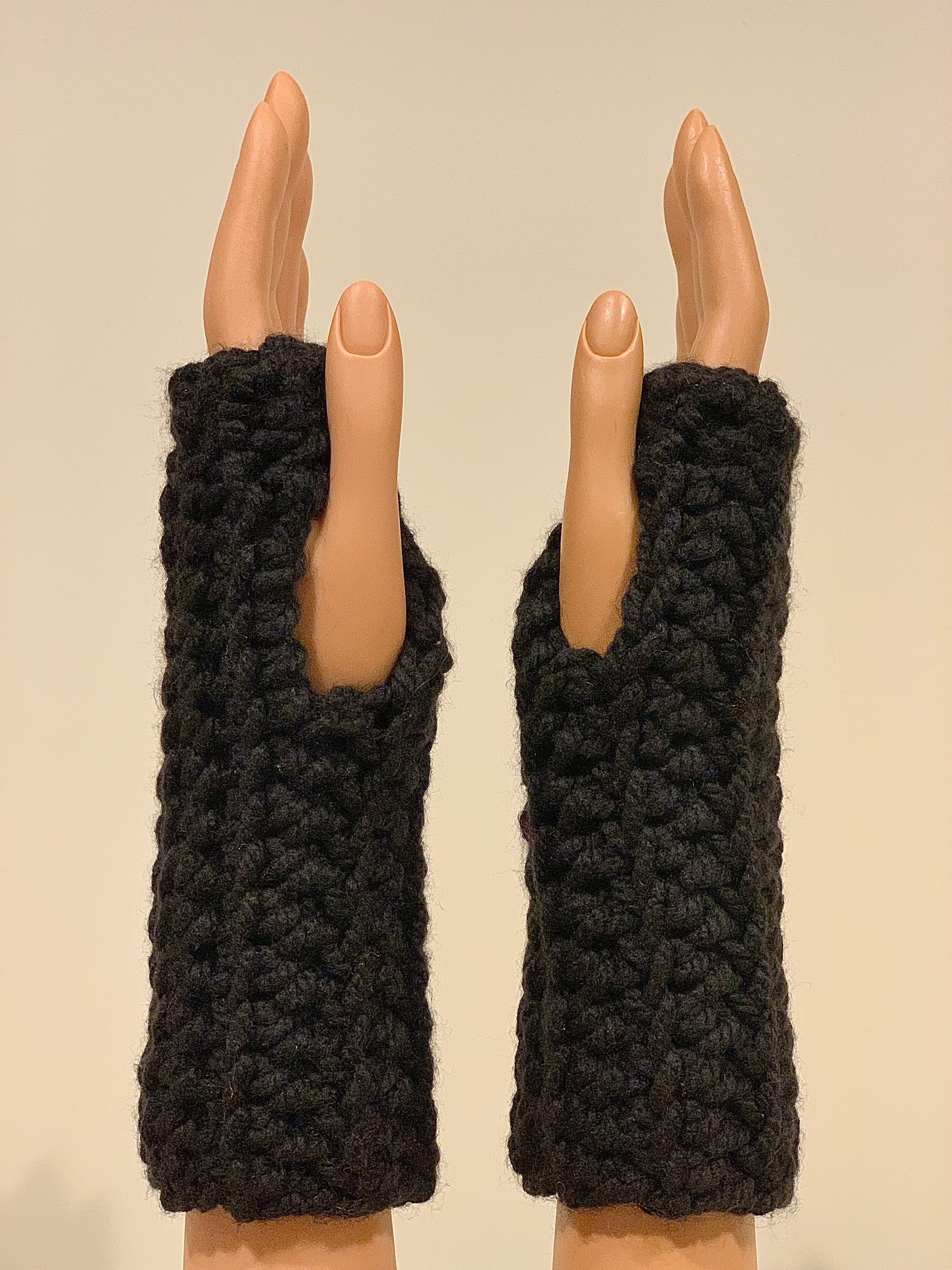 These fingerless mittens are suitable for both outdoor and indoor use. They are stylish and cozy, coordinating beautifully with my eternity scarves and other crocheted creations (hats, headbands, clip-on flowers, and more).