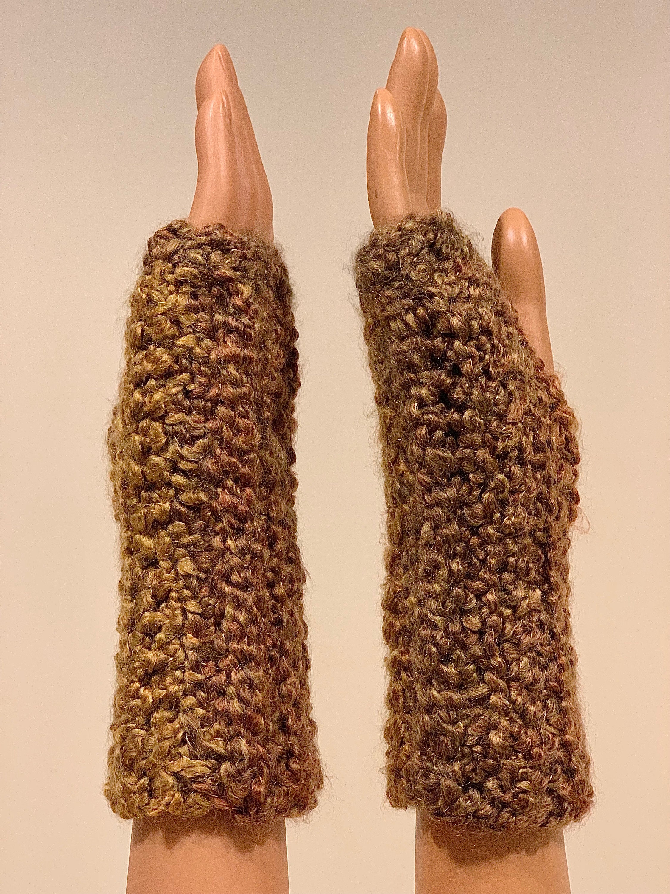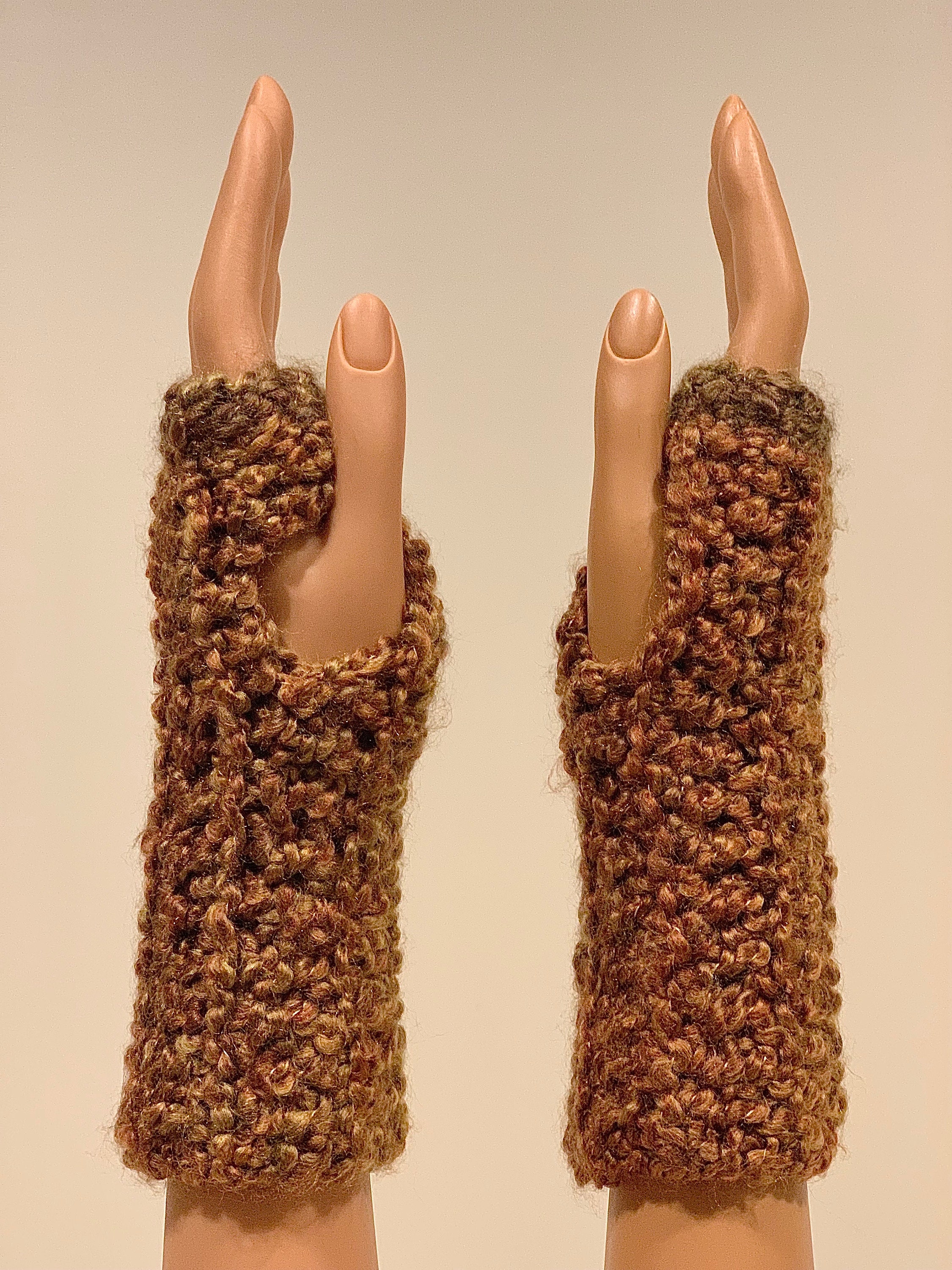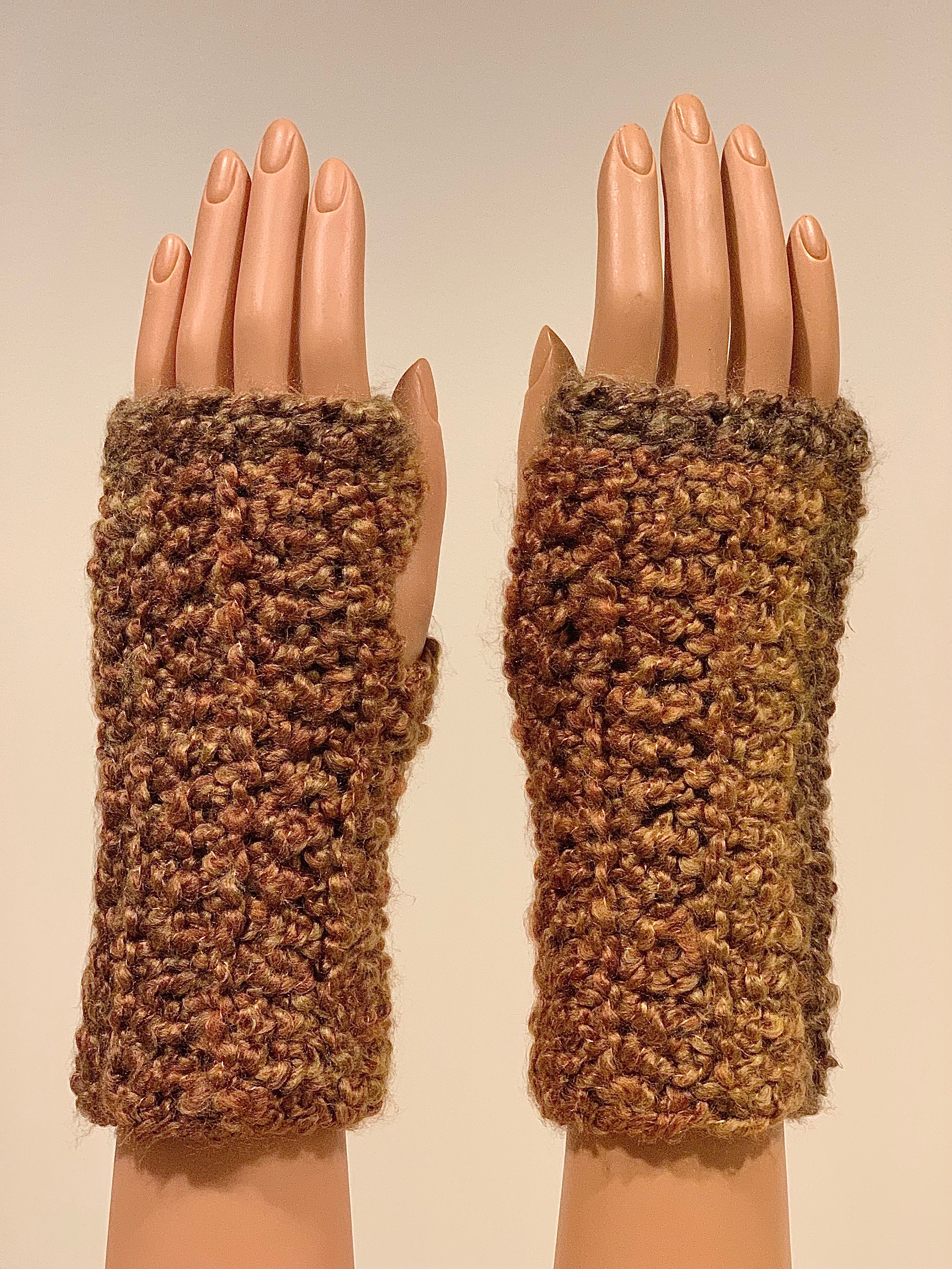 These fingerless mittens are suitable for both outdoor and indoor use. They are stylish and cozy, coordinating beautifully with my eternity scarves and other crocheted creations (hats, headbands, clip-on flowers, and more).