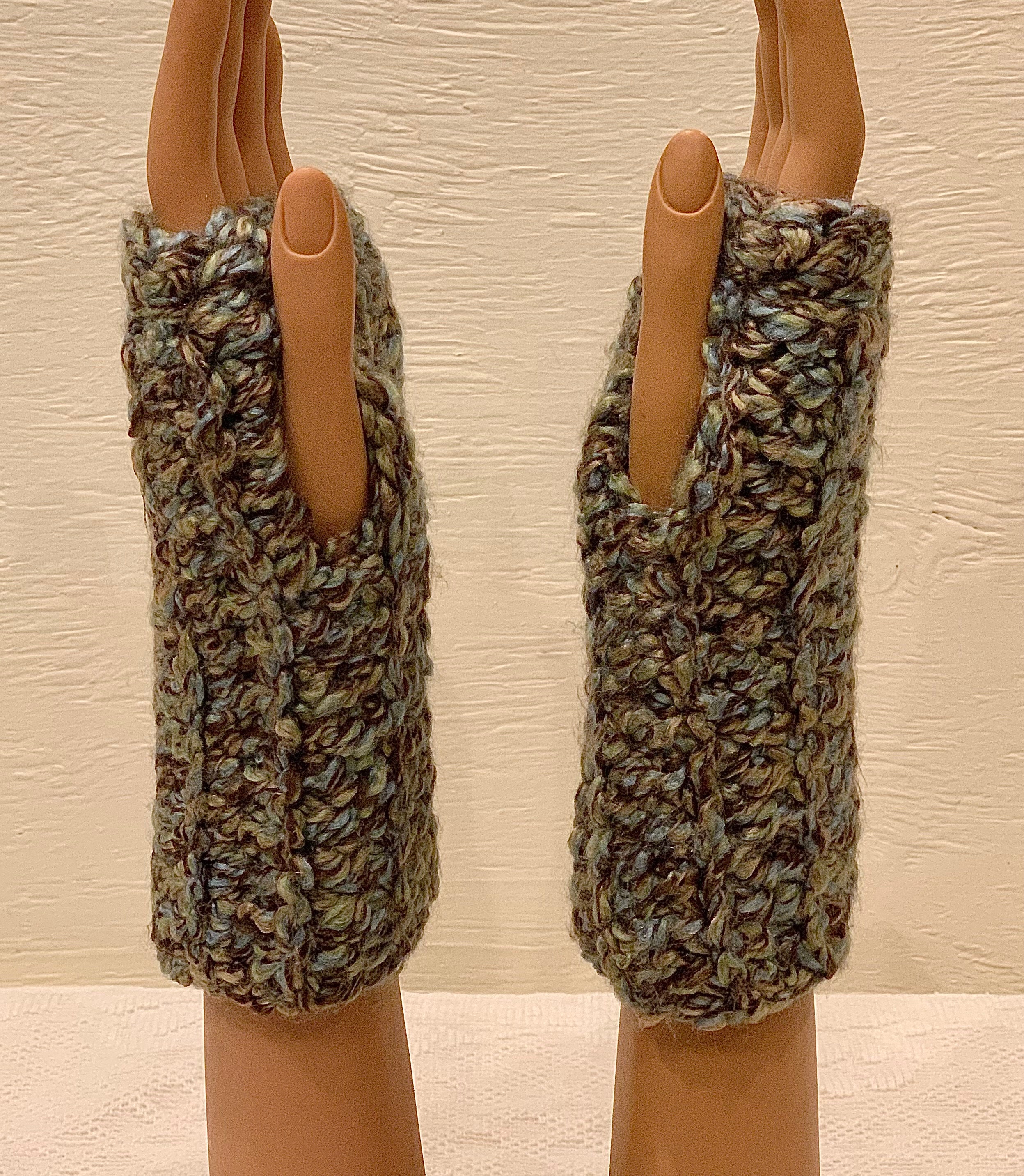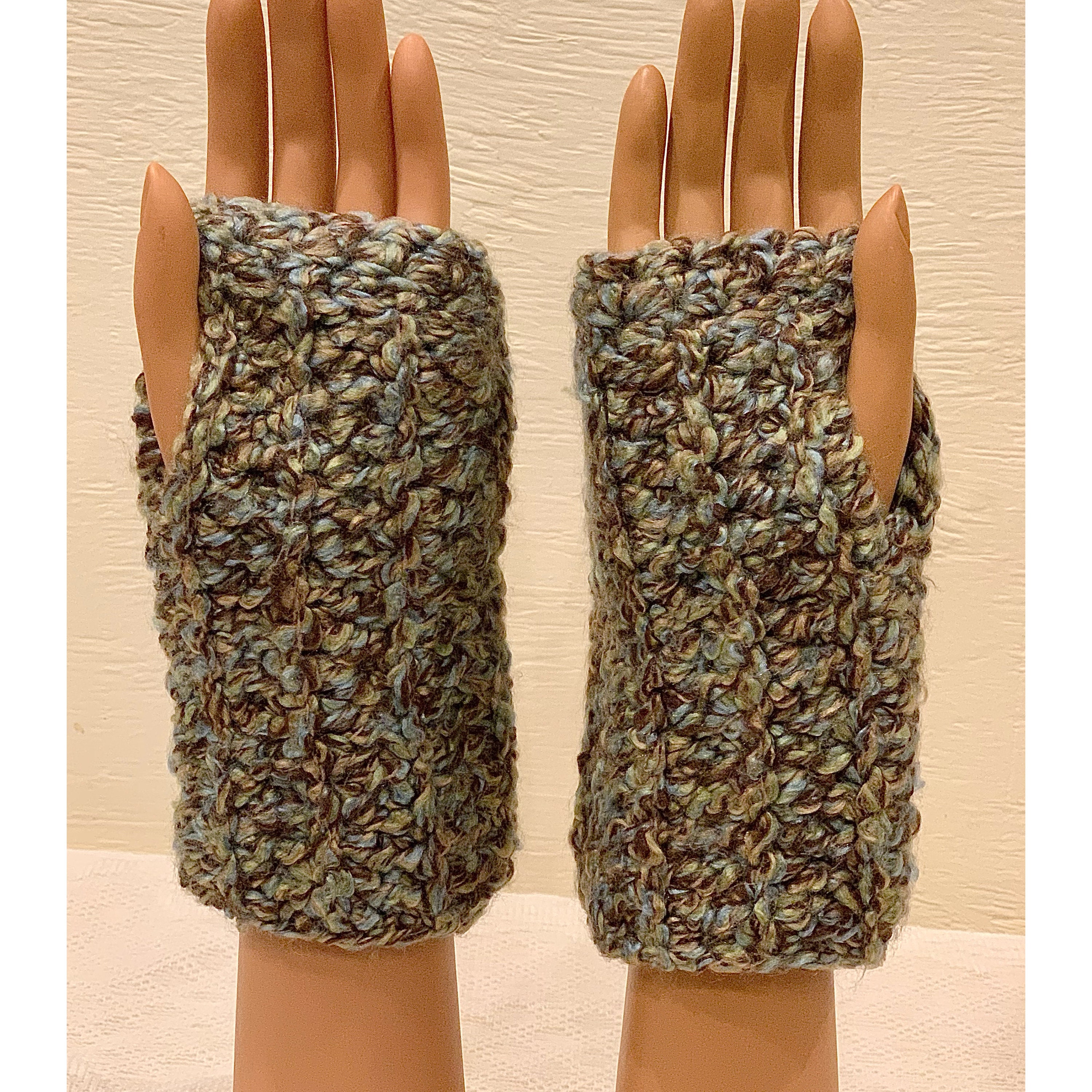 Fits Most, Green, Blue, Brown Fingerless Mittens - Chunky Handmade for Adults