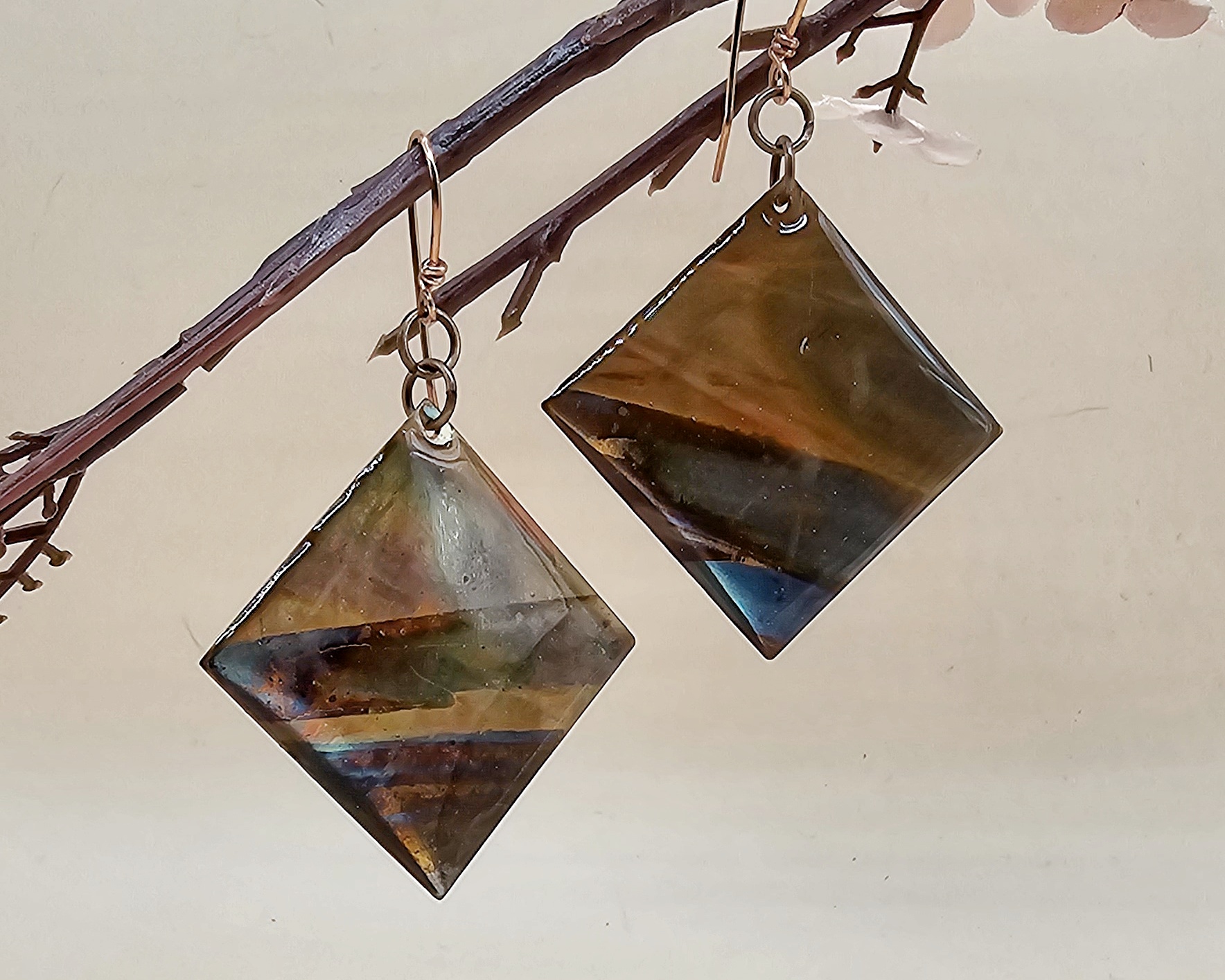 I began with 24 gauge square copper blanks that I torch fired to bring out the underlying colors. Then, I sealed using UV resin and hung on 21 gauge handcrafted earring wires.
