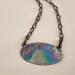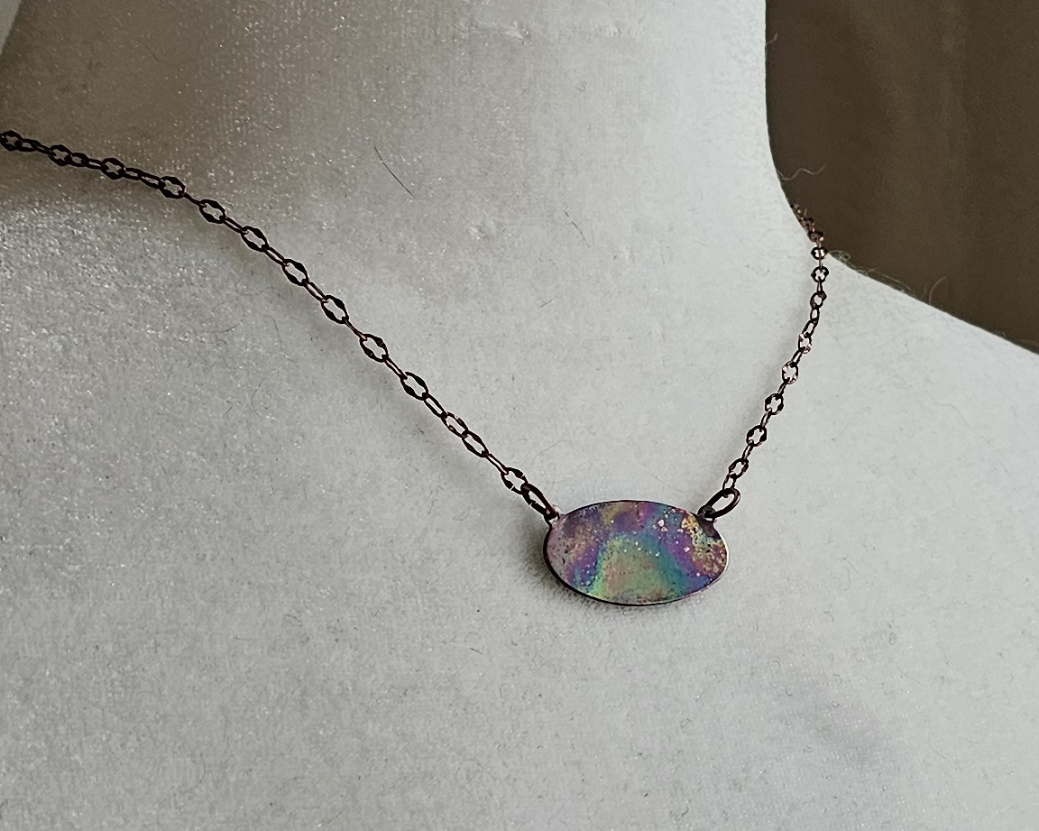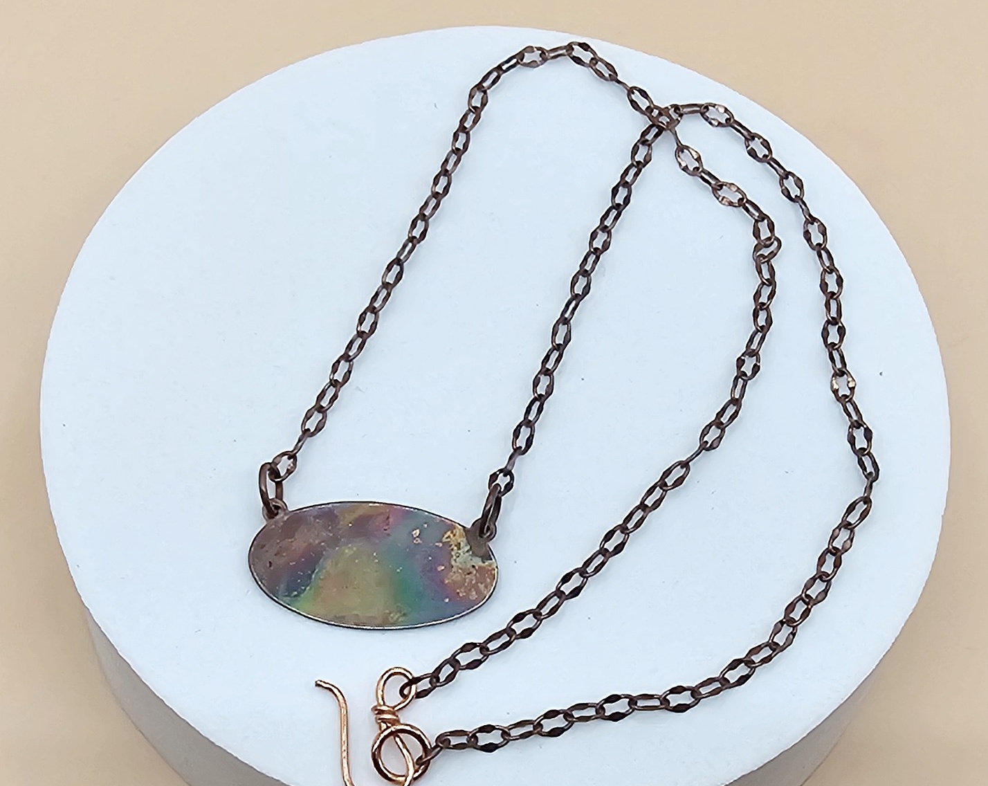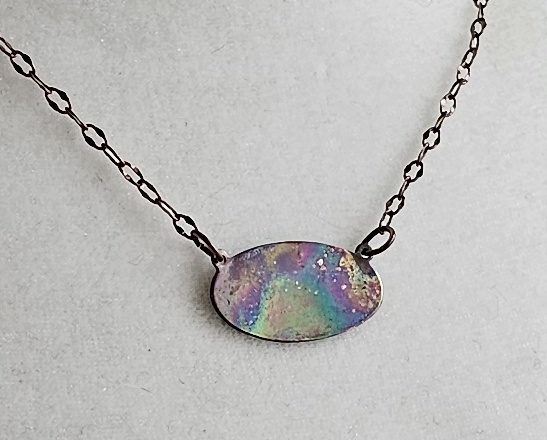 I started with a 24 gauge oval copper blank, which I then heated with a butane torch. This method brings out various colors in the copper. Once I achieved the desired colors, I coated with a spray sealant and hung on copper chain.