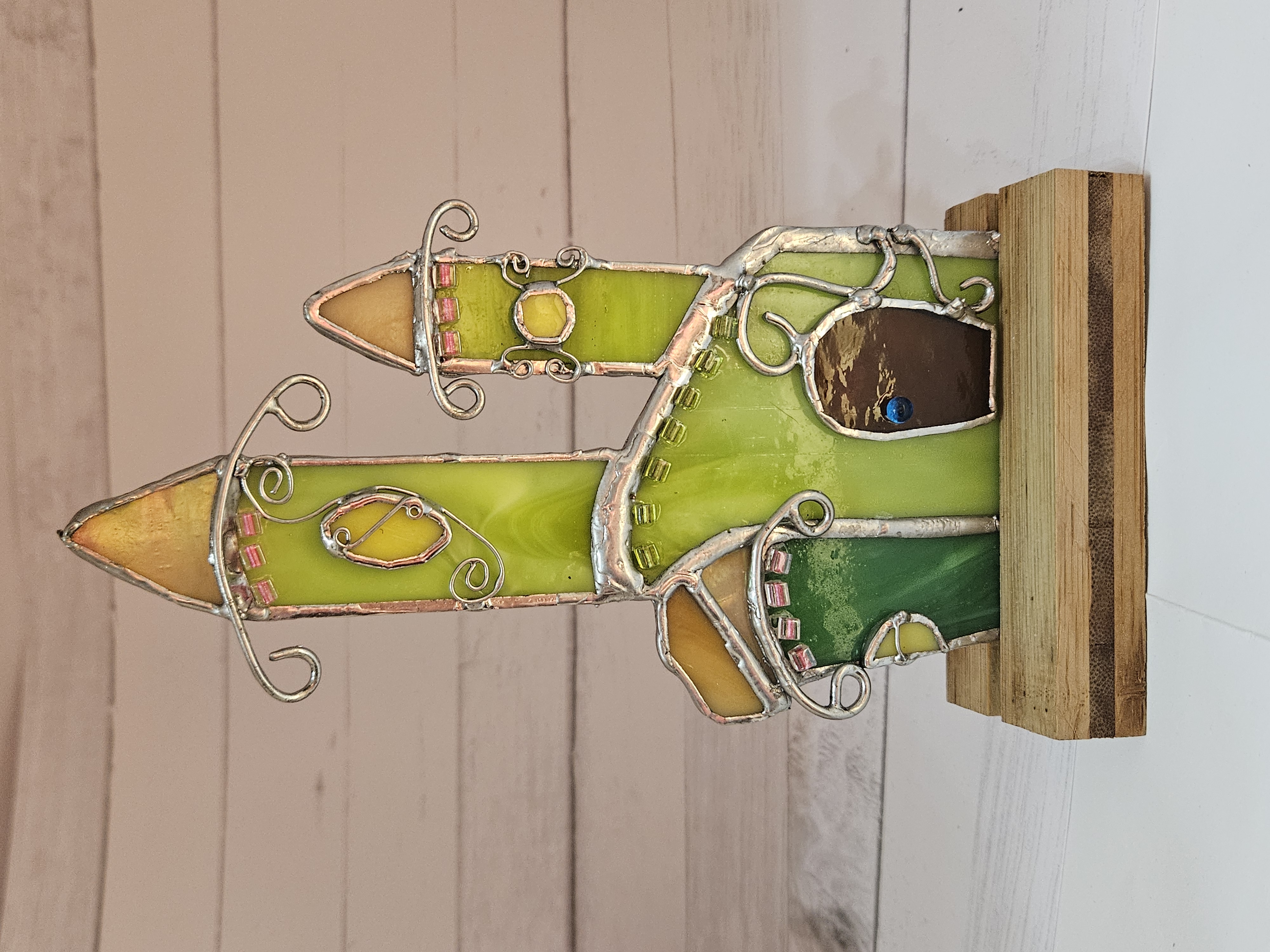 Stained glass Fairy Castle: perfect for the fairies that live in your house! The house has soothing green walls and pale pink glass beads accents below each roof. The castle is mounted in a bamboo base for stability.