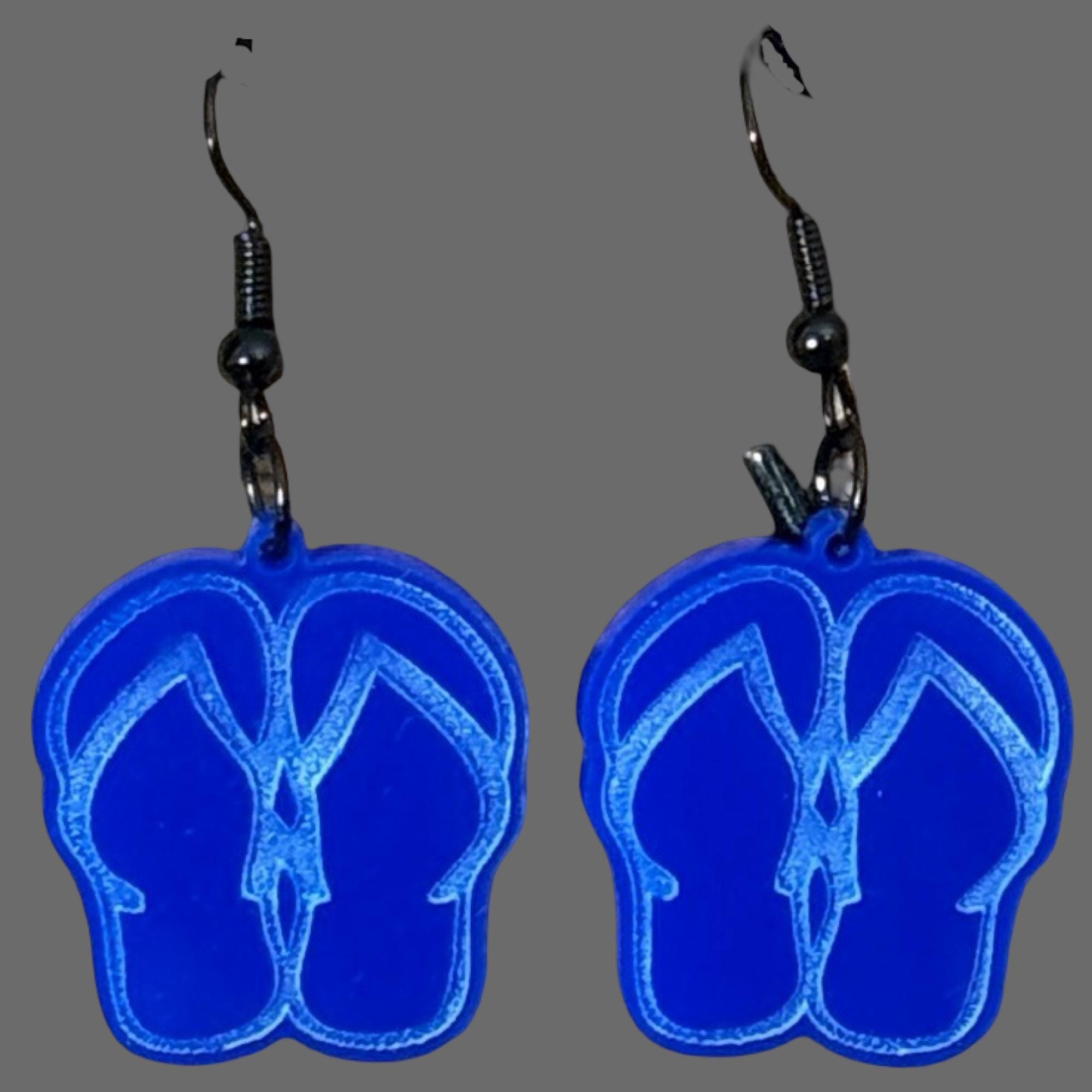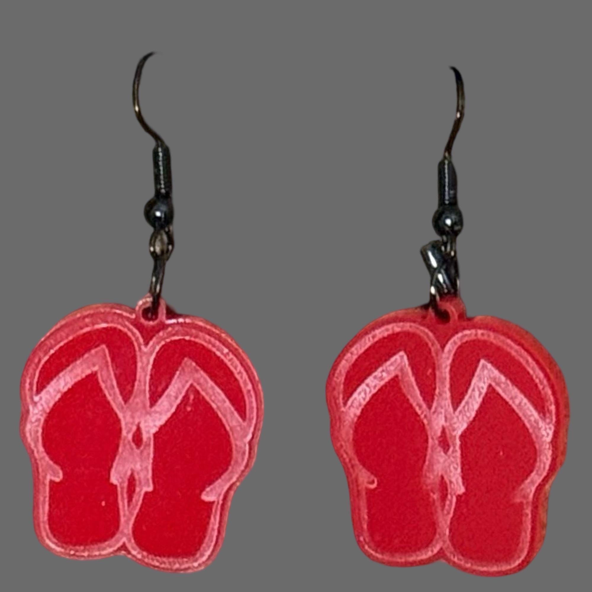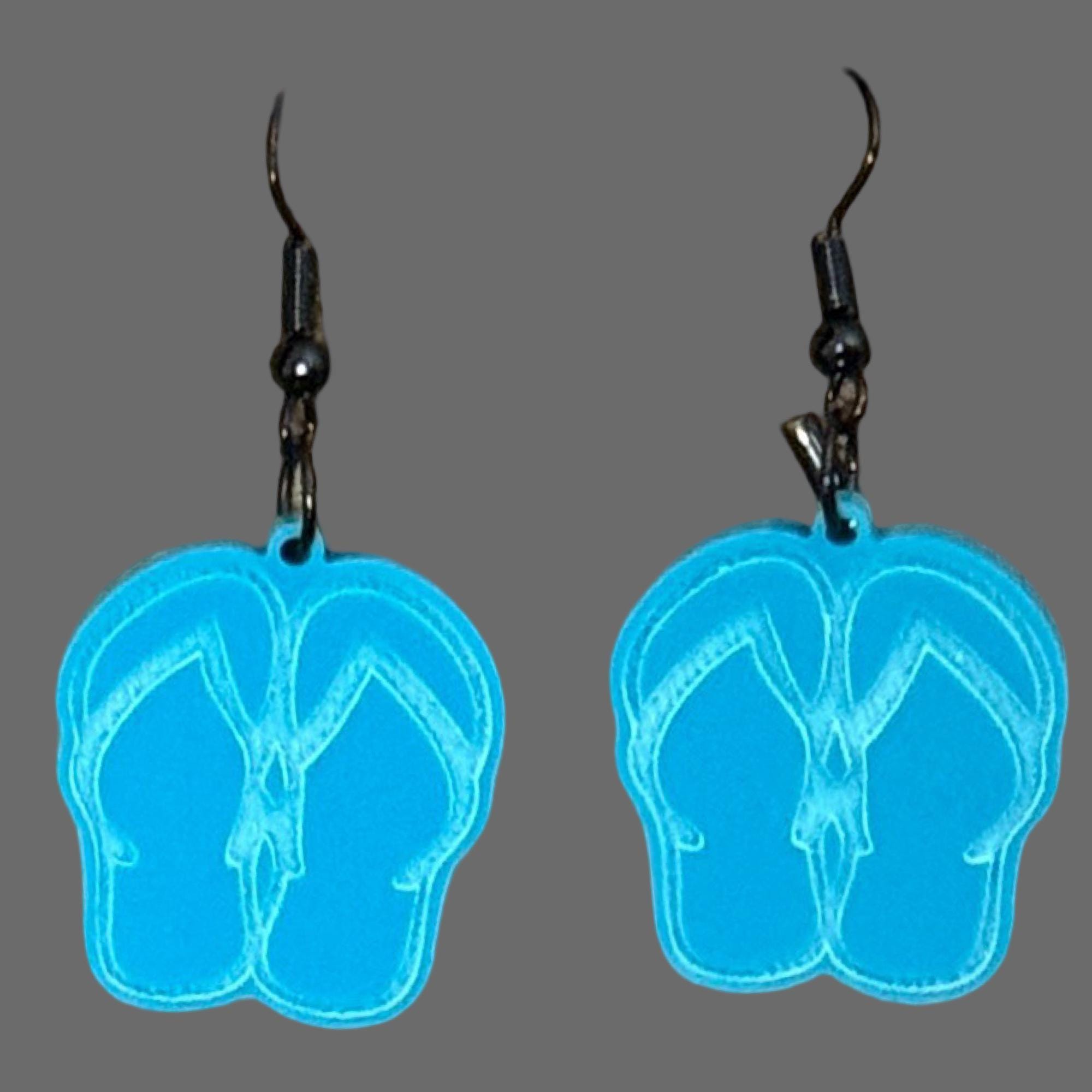 These are laser cut lightweight flip flop acrylic dangle earrings. They are made from 1/8 in thick medium acrylic. There is no design on the back. They are on ear wires. All metal components are silver, gold, or brass plated, or black alloy, nickel & lead free, and hypoallergenic. They are approx. 1" long. Backs not included but available upon request. They come in several different colors available in the drop down menu.