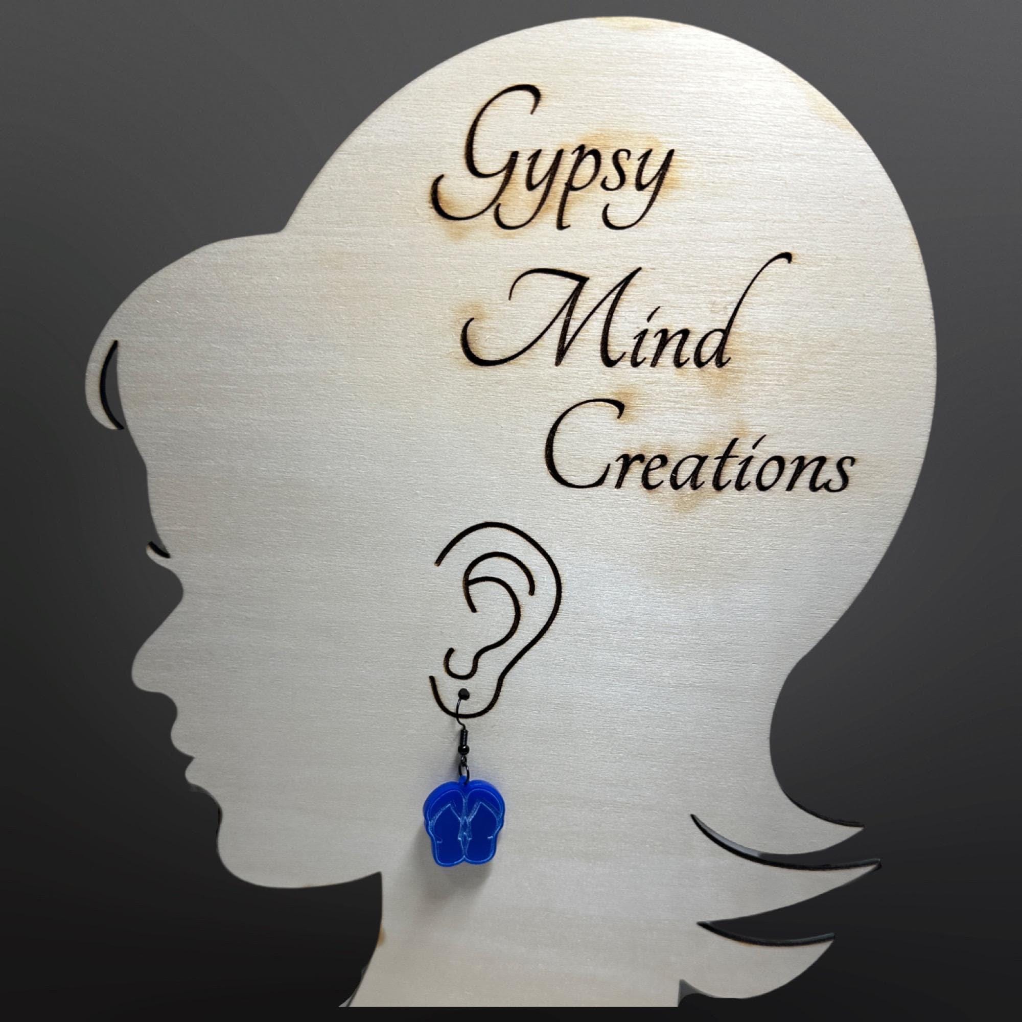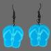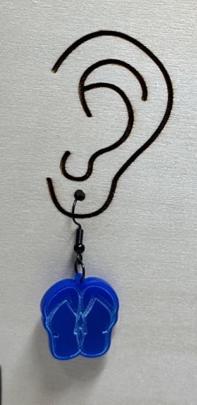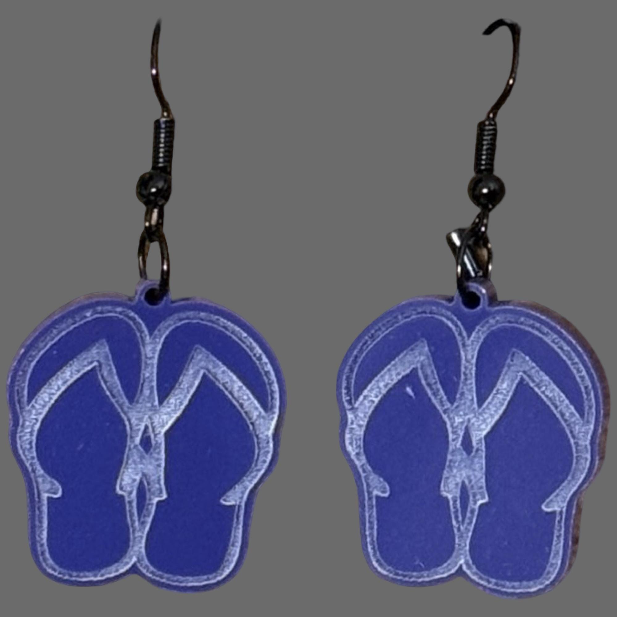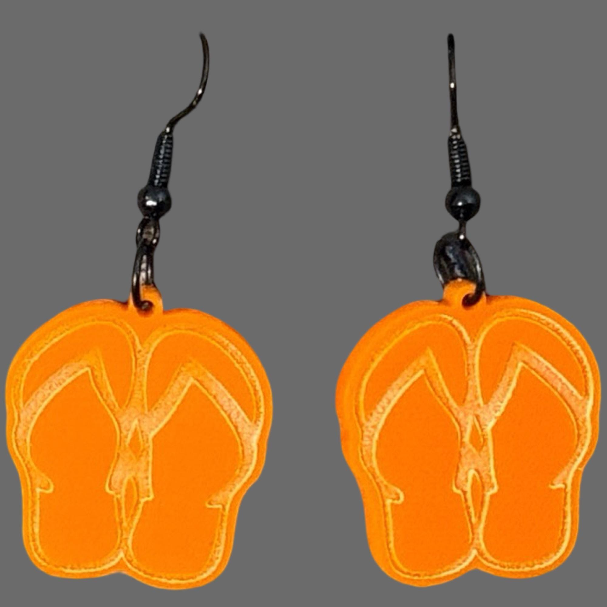 These are laser cut lightweight flip flop acrylic dangle earrings. They are made from 1/8 in thick medium acrylic. There is no design on the back. They are on ear wires. All metal components are silver, gold, or brass plated, or black alloy, nickel & lead free, and hypoallergenic. They are approx. 1" long. Backs not included but available upon request. They come in several different colors available in the drop down menu.