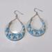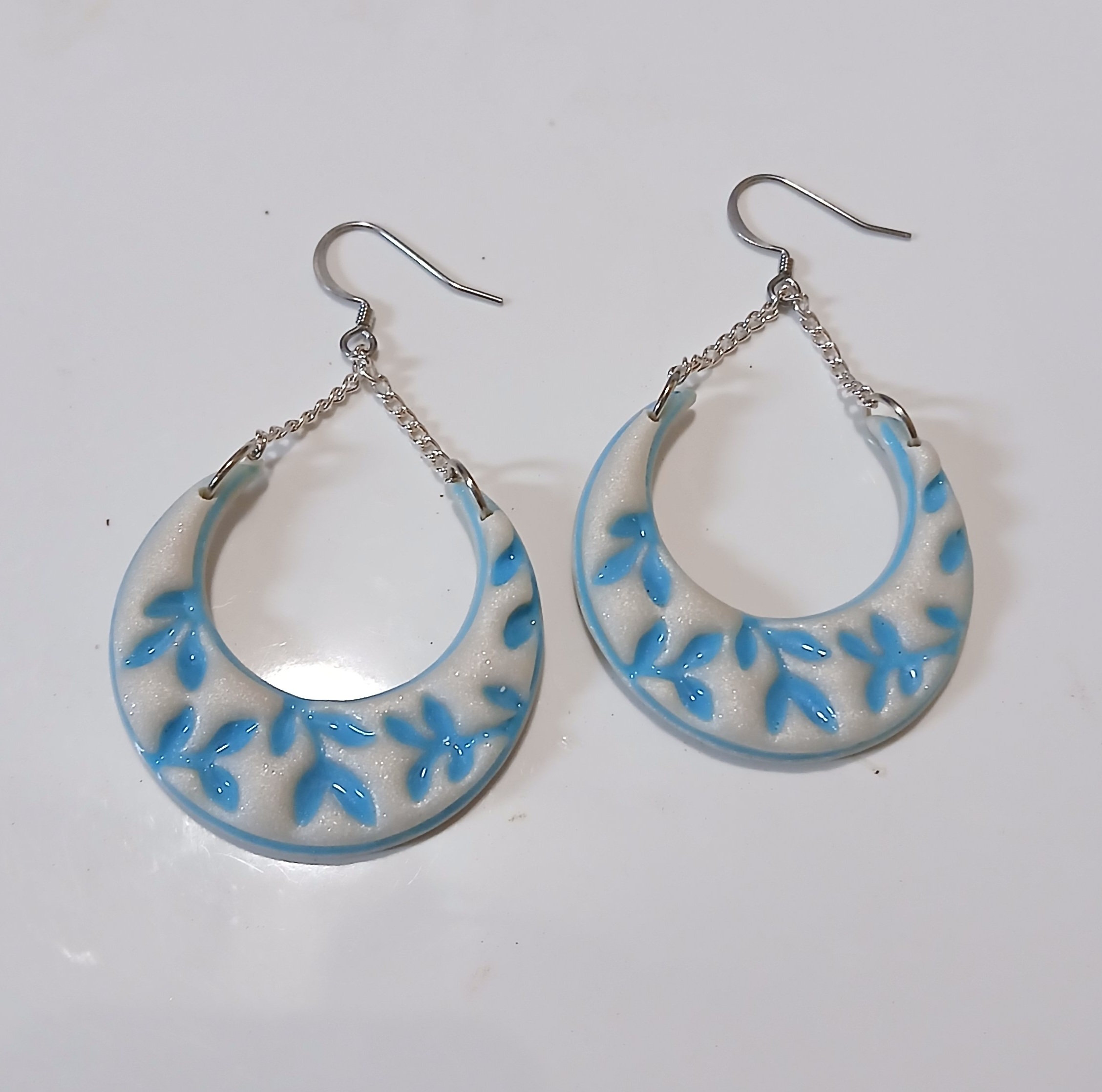 White pearl clay crescents with an embossed floral pattern filled in with sky blue UV resin. Hung from chain on surgical steel french hooks. 2.5 inches (60mm) from top of hook, and just under 1.5 inches (35mm) wide.