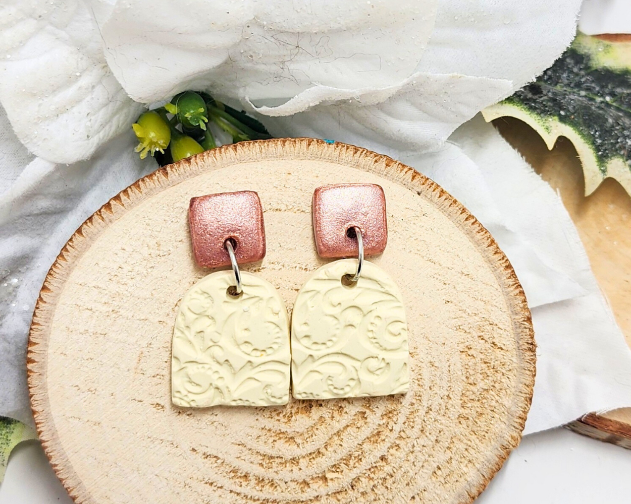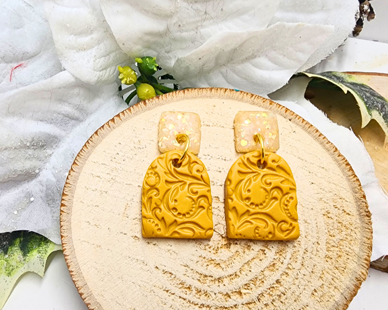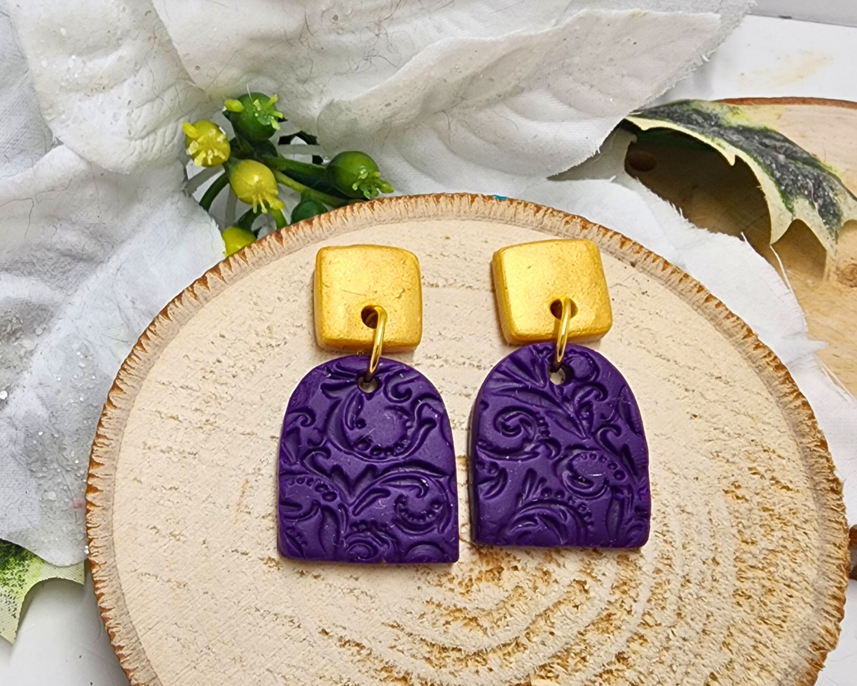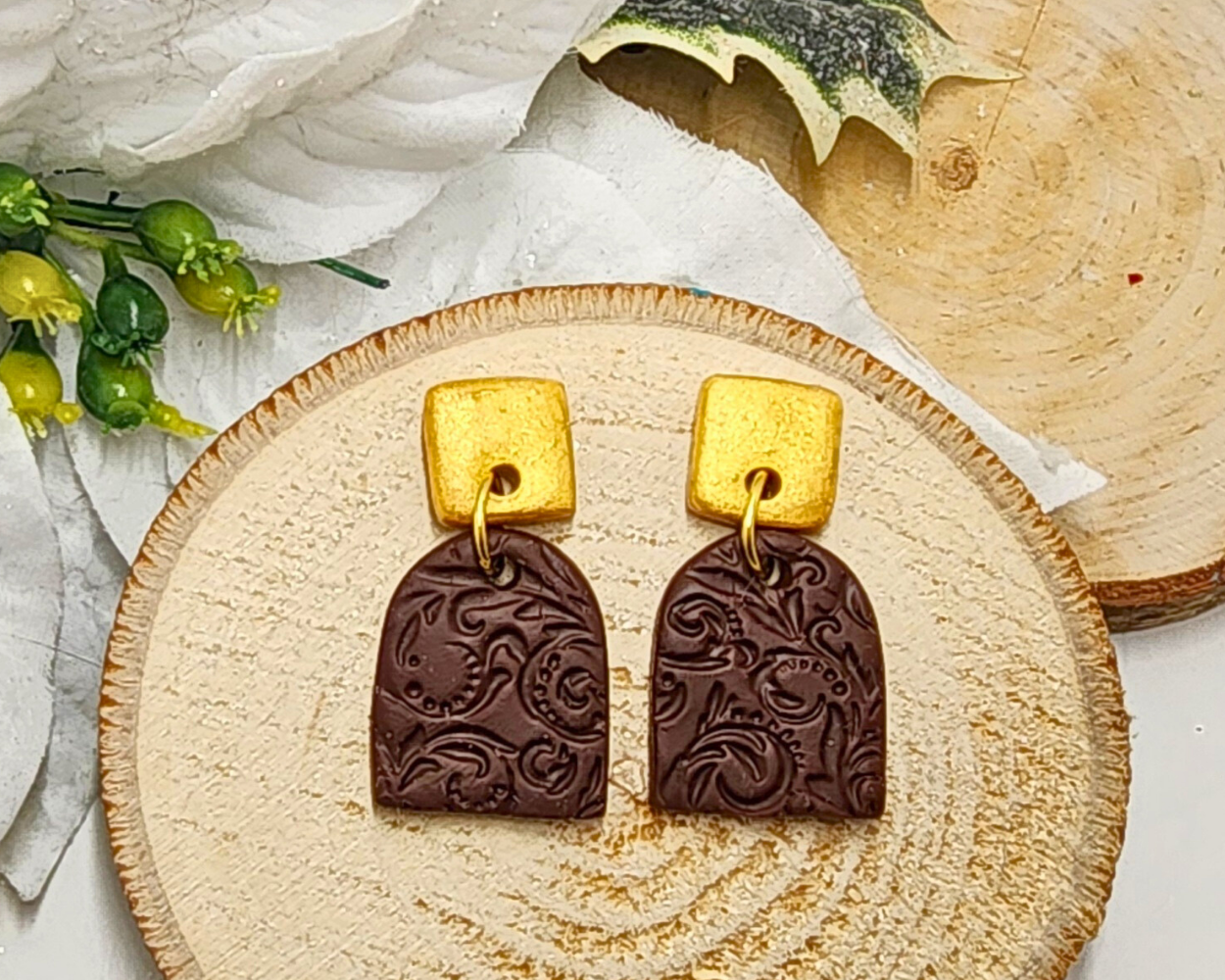 Bring a touch of artisan charm to your outfit with these handcrafted, floral embossed arch earrings. Each pair is made from high-quality polymer clay, featuring an arch design with an intricate floral texture that’s both elegant and unique. The metallic shimmer square tops add the perfect modern touch, creating a beautiful balance of texture and shine.