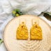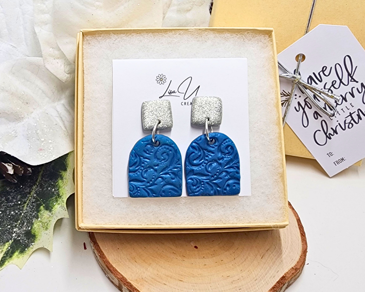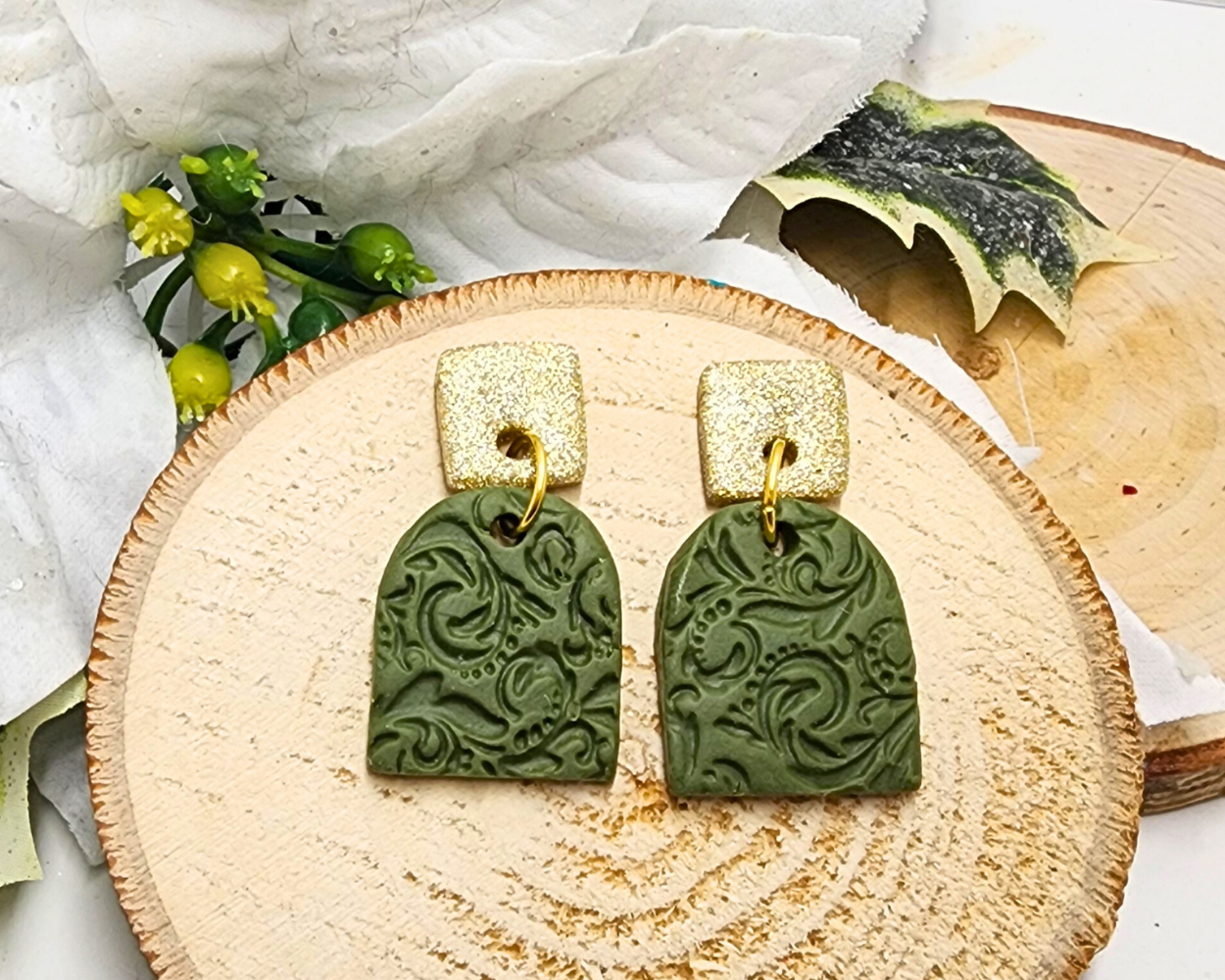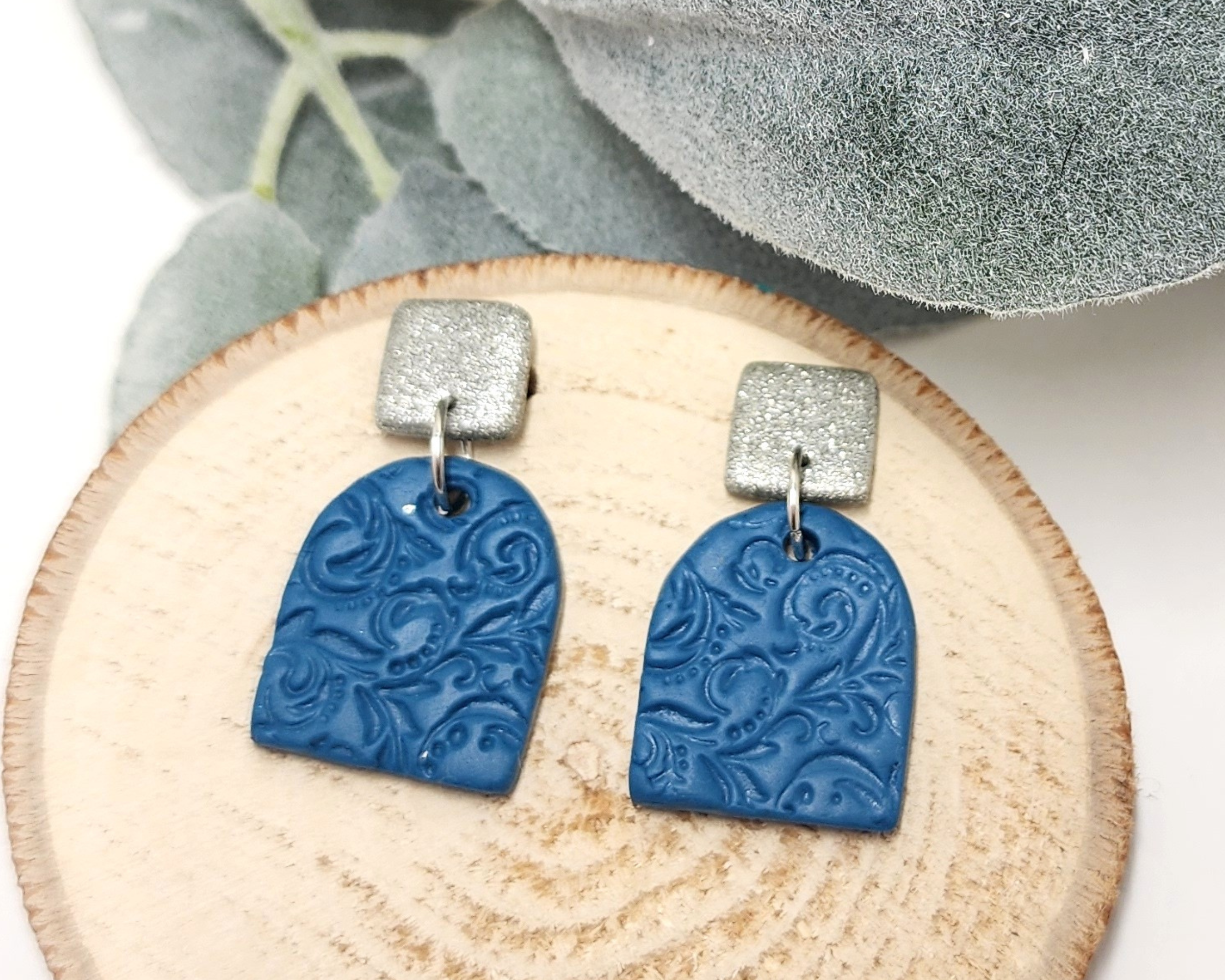 Bring a touch of artisan charm to your outfit with these handcrafted, floral embossed arch earrings. Each pair is made from high-quality polymer clay, featuring an arch design with an intricate floral texture that’s both elegant and unique. The metallic shimmer square tops add the perfect modern touch, creating a beautiful balance of texture and shine.