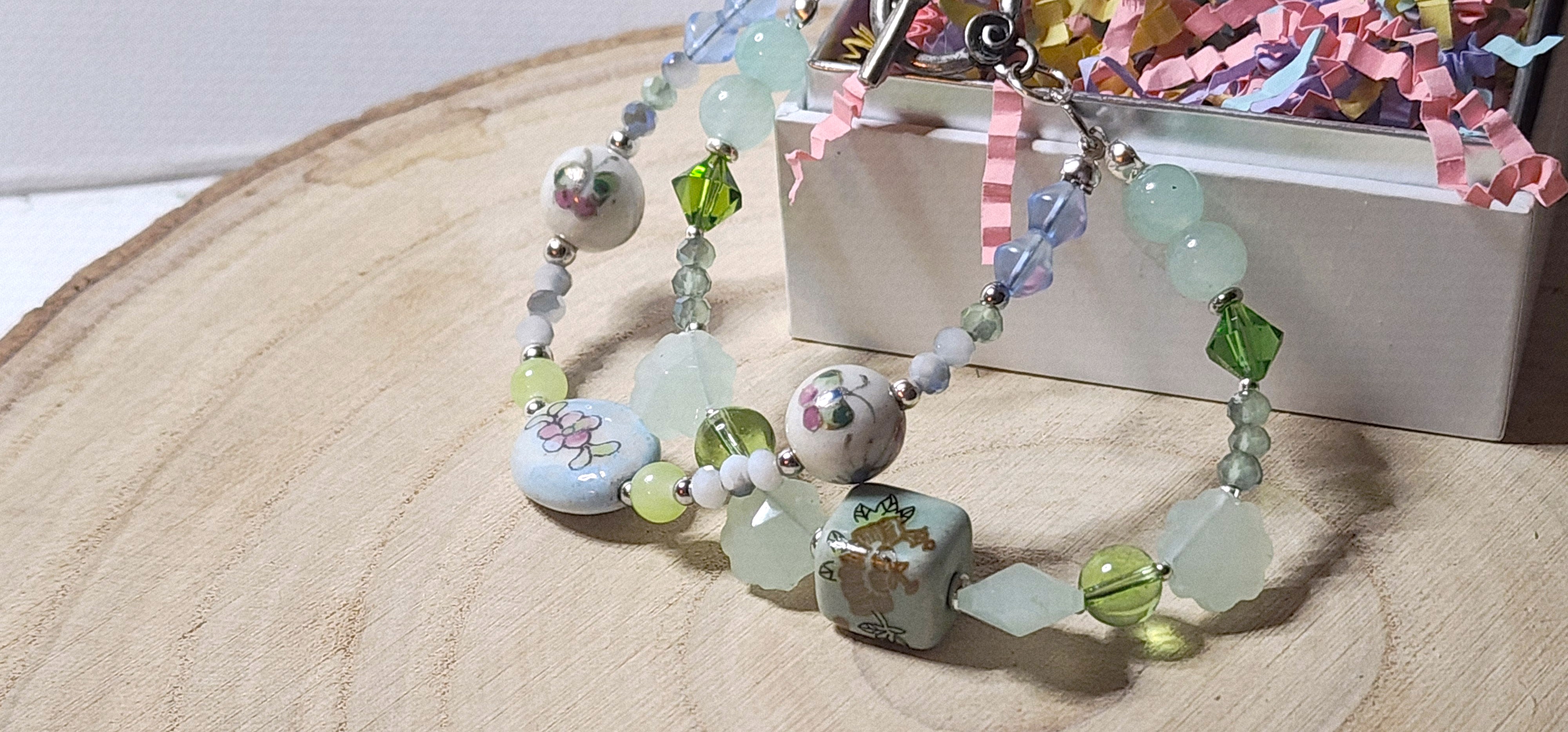 Handmade with floral porcelain beads, crystal and glass beads strung onto heavy duty beading wire. This is a double strand bracelet in colors of blue and green tones. I used jump rings to connect the strands together and use a toggle clasp for a closure