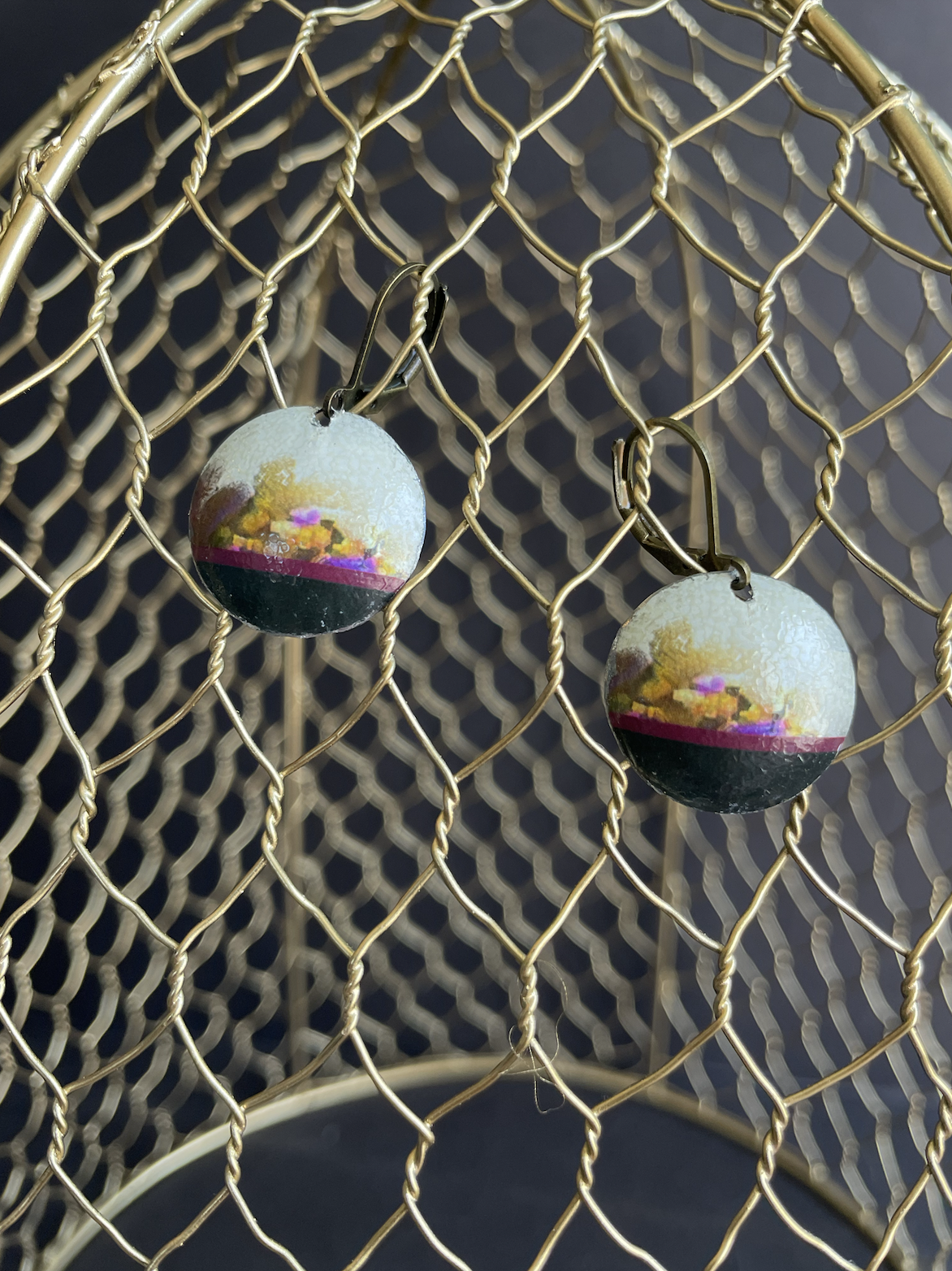 This collection came from a tin with a painting of a lake scene. This is part of the floral lakebank. The earrings are antiqued brass with no nickel, and come with rubber stoppers so they won't fall out of your ears.