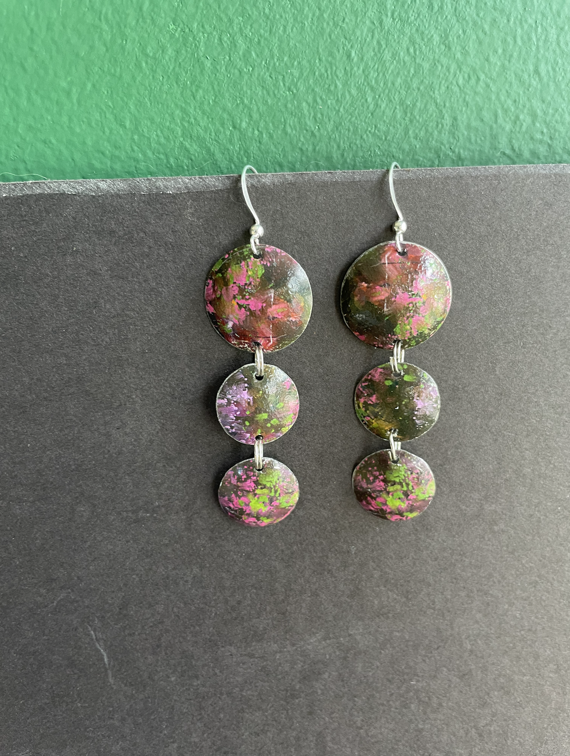 Tins are very light making them ideal for earrings as they don't weigh down your ears as the day goes on. Did you know the proper term for working with tin is "tinkering"? That made me really happy. I literally tinker in my art studio! I use old cookie tins, tea tins, and the like, break them down, and hand cut them into shapes and hand-hammer them into the 3-D shape I want them to be, finish and polish them, before putting them together like any other jewelry.