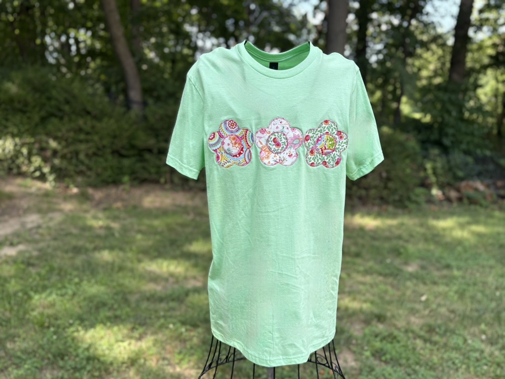 The applique floral shirt is whimsy, colorful, and fun - just like you. The top is a light green Gildan Softstyle tshirt with 3 colorful and playful flowers appliqued to the front. The shirt is roomy and comfortable, and it would be cute dressed up for a fun day out in town, or dressed down for a casual day. The choice is yours! Be sure to also check out the black and white floral design for a different print.