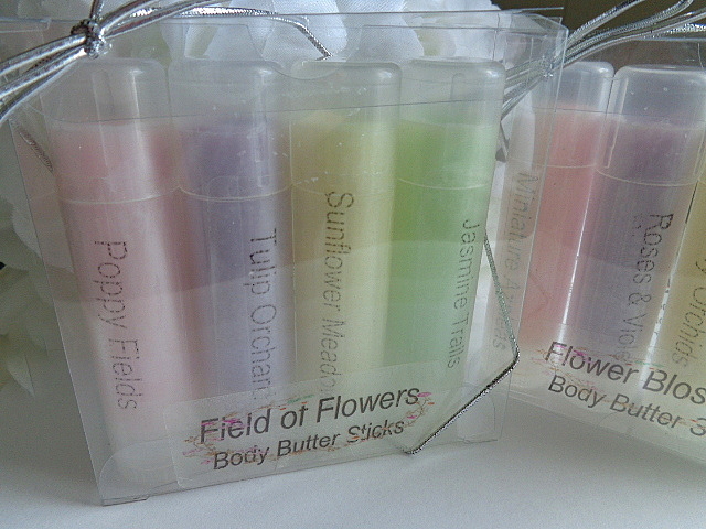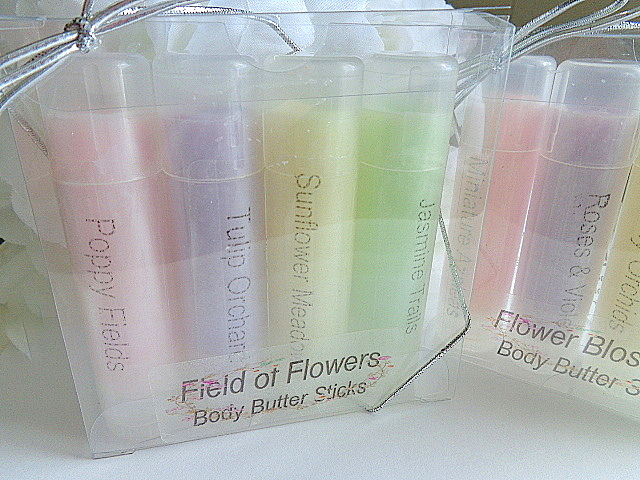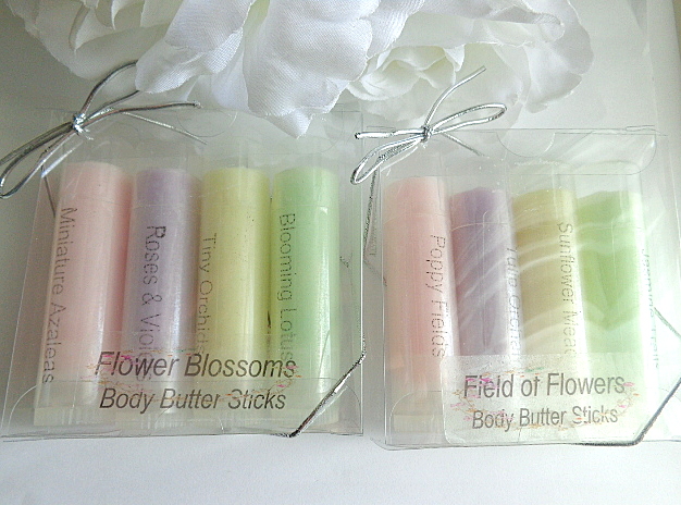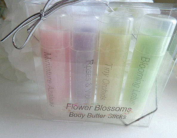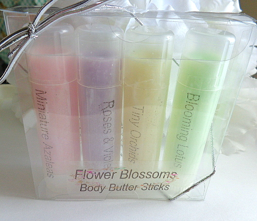 FLOWER GARDEN solid lotion sticks for keeping the skin hydrated with soft natural scents. These moisturizers can be used anywhere on the body, i.e., hands, arms, elbows, feet, heels, knees, etc. These come in 2 different sets (4 tubes per set) and are .50 oz twist tubes. Easy to apply by swiping stick or fingertips for application. These are lightly colored with skin safe mica, and for appearance only; Will not leave color on your skin. Color/Scent Choice (sets) are listed below. Sets may not be broken up or mismatched. Please choose your favorite set(s).
