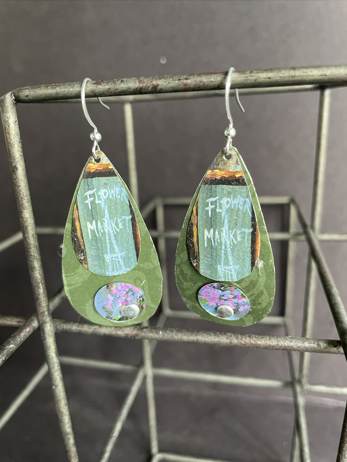 This popcorn tin showcased a quaint cafe and flower market scene in Paris. So quaint I named this collection "Gay Paris" (pronounced 'paree'). I love how the close-ups of so many of these bits create colorful abstract earrings, like these floral market sweeties. These silver plated earrings come with a rubber stopper so they won't fall out of your ears.
