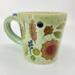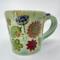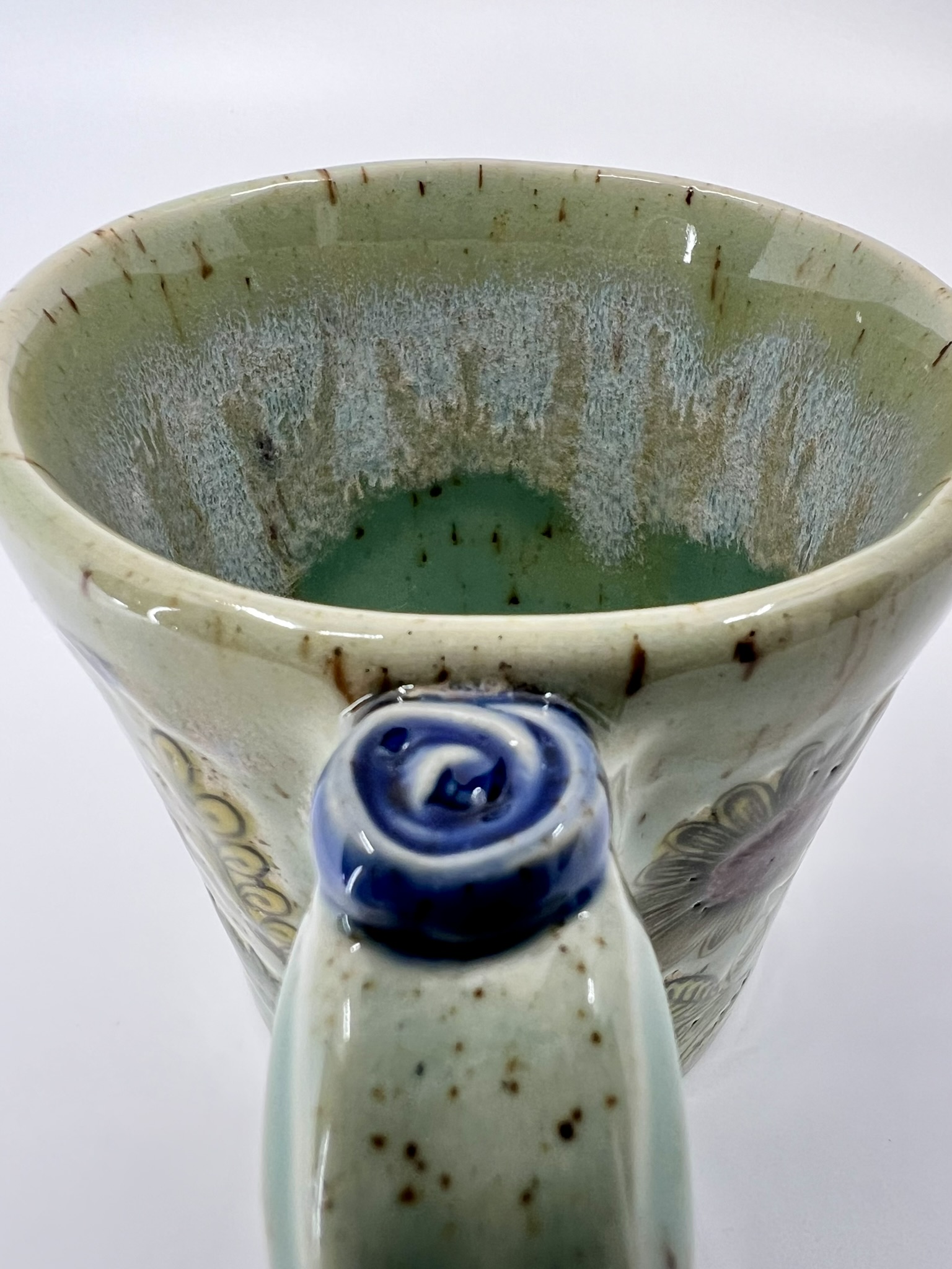 This mug begins as a slab of speckled white clay, hand-built and shaped on a wooden form. Once the surface is prepared, underglaze transfers are applied. The rosette is formed and attached to the handle as a thumb rest before the first firing. After bisque firing, the flowers are individually painted with celadon glazes to bring out their color and detail, and the background is glazed in aqua celadon. A floating pearl white glaze is added along the rim to create a soft color break into aqua and peach for interest on the inside of the cup. During the final firing, the transfers, celadons, and floating glaze settle together into their bright, layered finish.