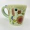 Bright floral underglaze transfers wrap around this hand-built mug, each one painted with soft celadon glazes that bring out warm reds, oranges, greens, and blues. The aqua celadon background gives the whole piece a cheerful, garden-inspired look, with the speckled clay showing through in gentle freckles. A cobalt blue rosette sits at the top of the handle as a comfortable thumb rest. The floating glaze along the rim breaks into aqua and peach, adding a sweet finishing touch. The three-finger handle provides ample support for this hand-built mug.