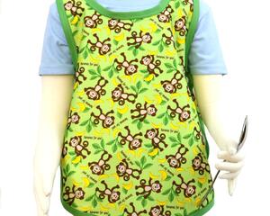 Easy on and off - slips over the child's head and snaps under the arms to fully cover both the front and back of the child.