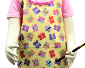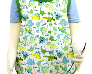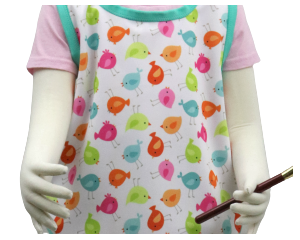 Bibs and play smocks are made from water resistant polyurethane laminated fabric (PUL) by Babyville. The edges are trimmed with a color-coordinated fold-over-elastic (FOE). Plastic snaps are added under the arms to secure it on the child. Shoulder seams are double stitched for durability and clean edges (see pictures below).