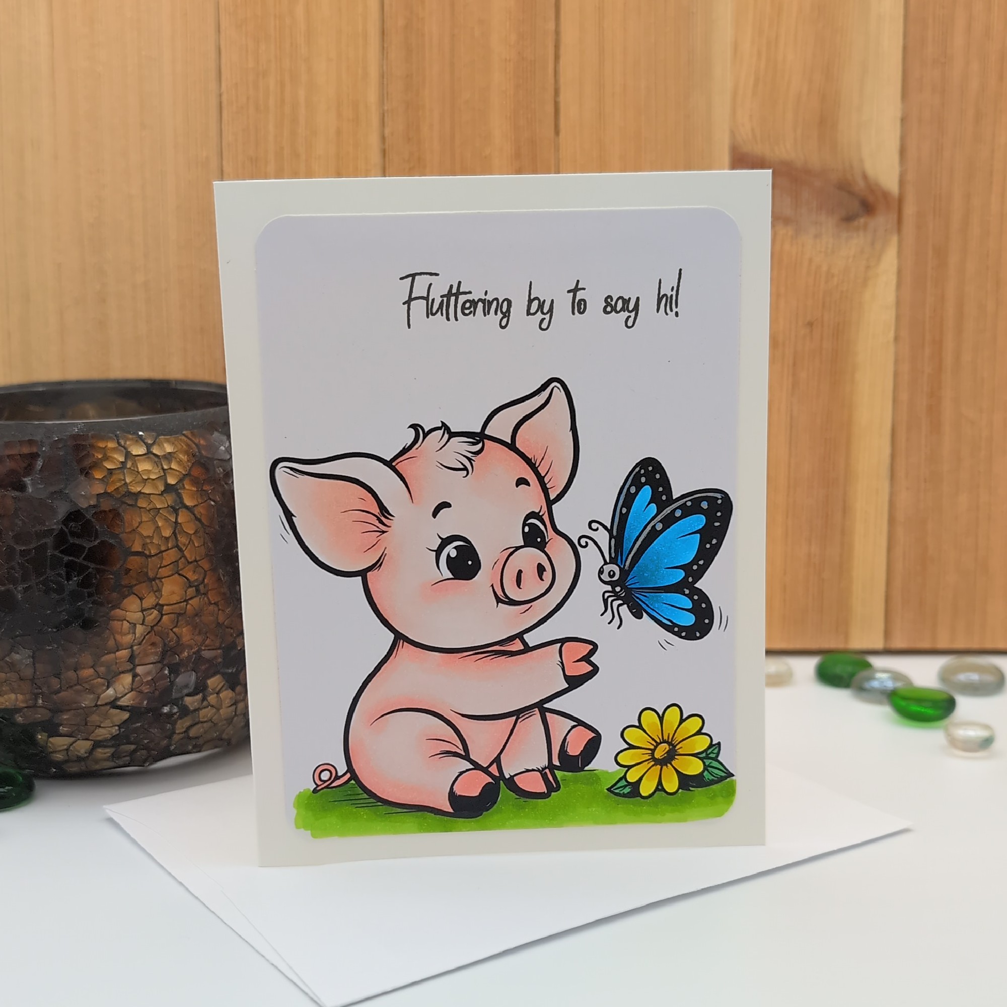 This handmade greeting card captures a tender moment between a pink piglet and a fluttering butterfly, set against grassy greens and a sunny bloom. Colored with alcohol markers for rich, playful detail, the front reads “Fluttering by to say hi!” in friendly script. The inside is blank, giving you space to share a warm hello, a note of encouragement, or a spontaneous smile. Whimsical and versatile, this card is perfect for all seasons of life.