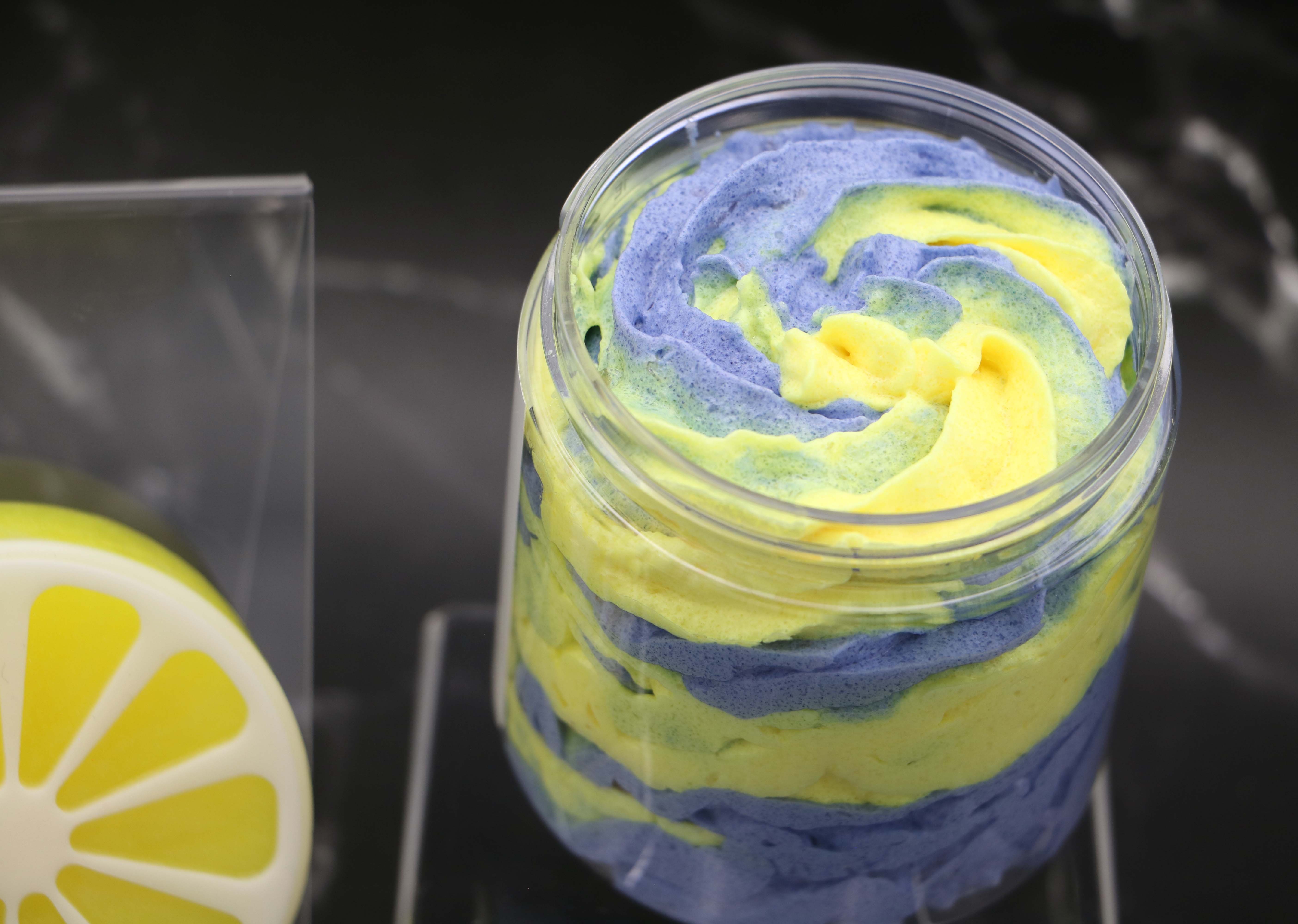 Foaming Soap Sugar Scrubs are made by combining Foaming Bath Whip with sugar & other key ingredients. I prefer to handcraft my own Bath Whip from scratch in an effort to control ingredients and not add unwanted chemicals. I then add my fragrance oils, sugar and mica colorants before piping the scrub into jars.