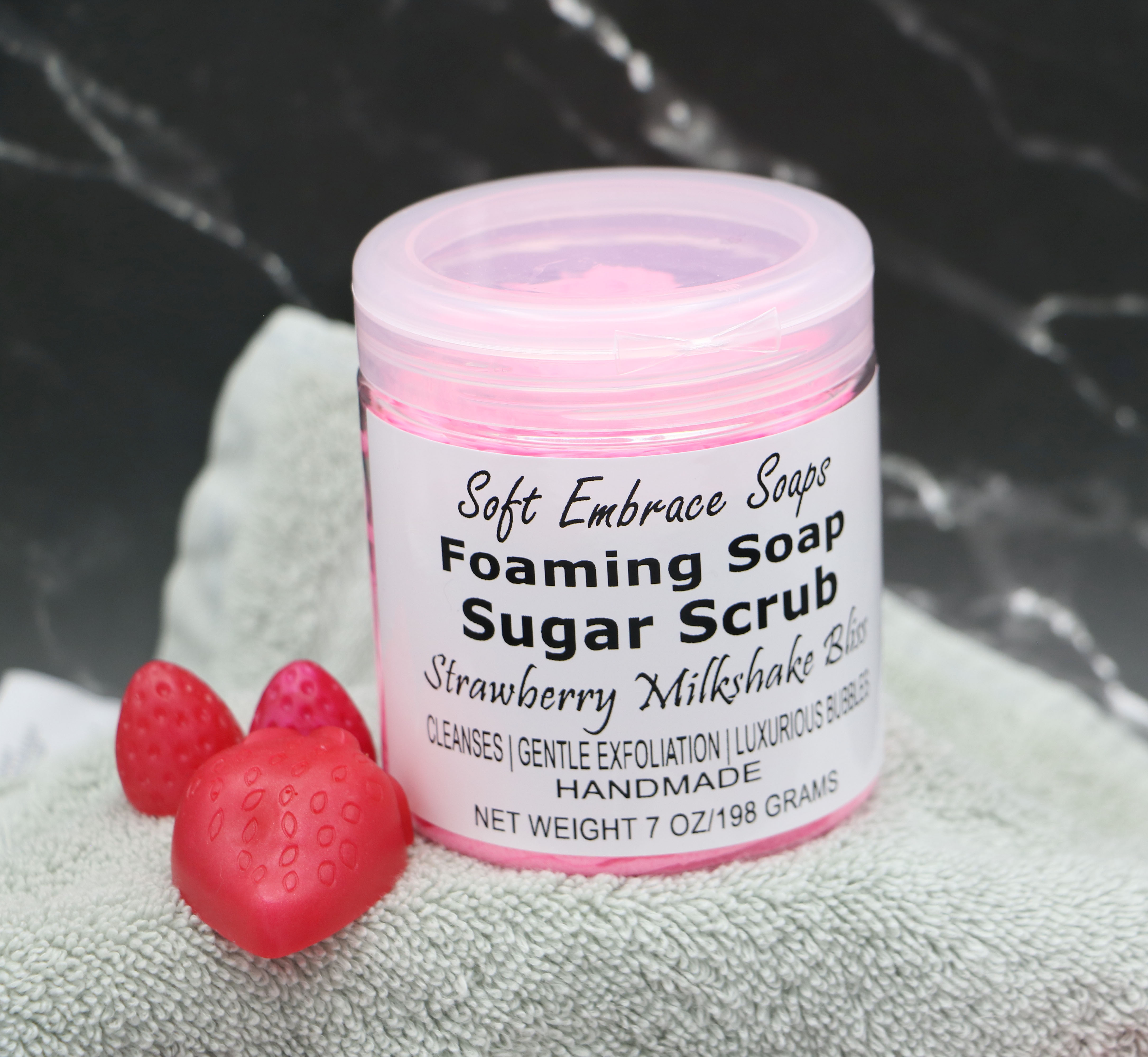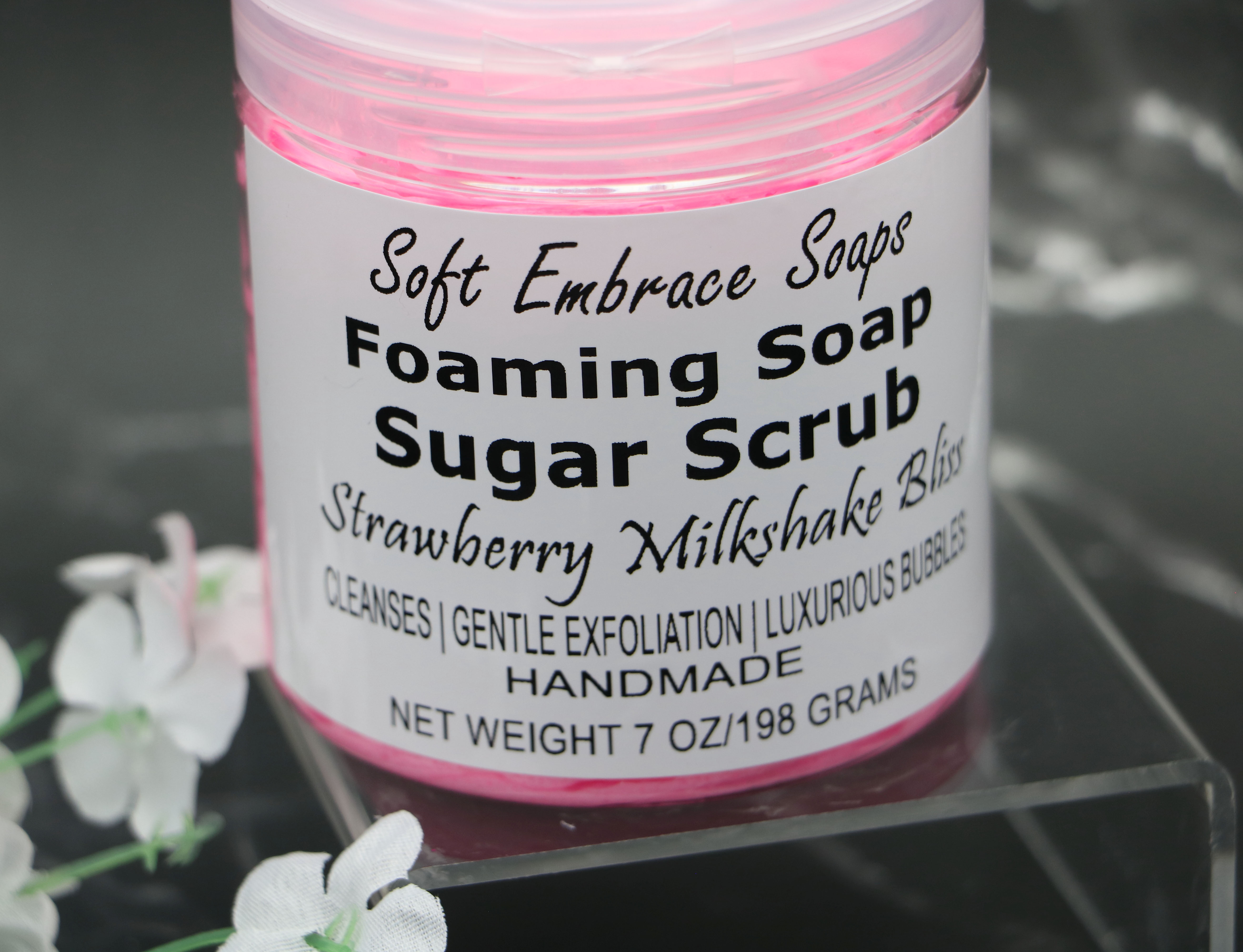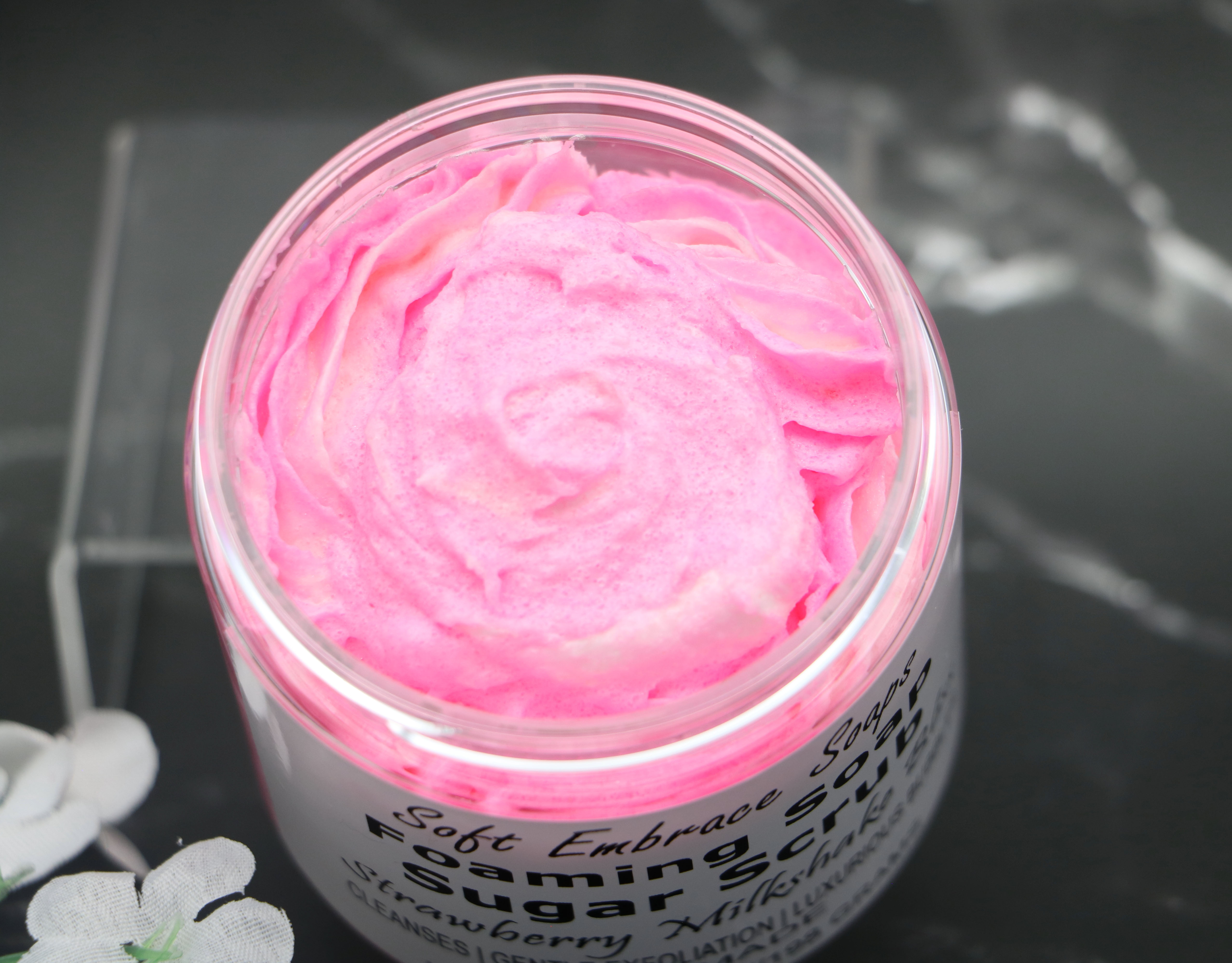 This lovely Pink & White colored scrub is scented with strawberry & vanilla fragrance oil. The two scents blended together are reminiscent of a delicious fresh seasonal strawberry milkshake. The strawberry fragrance oil is so realistic of freshly picked strawberries, that it may actually make your mouth water!
