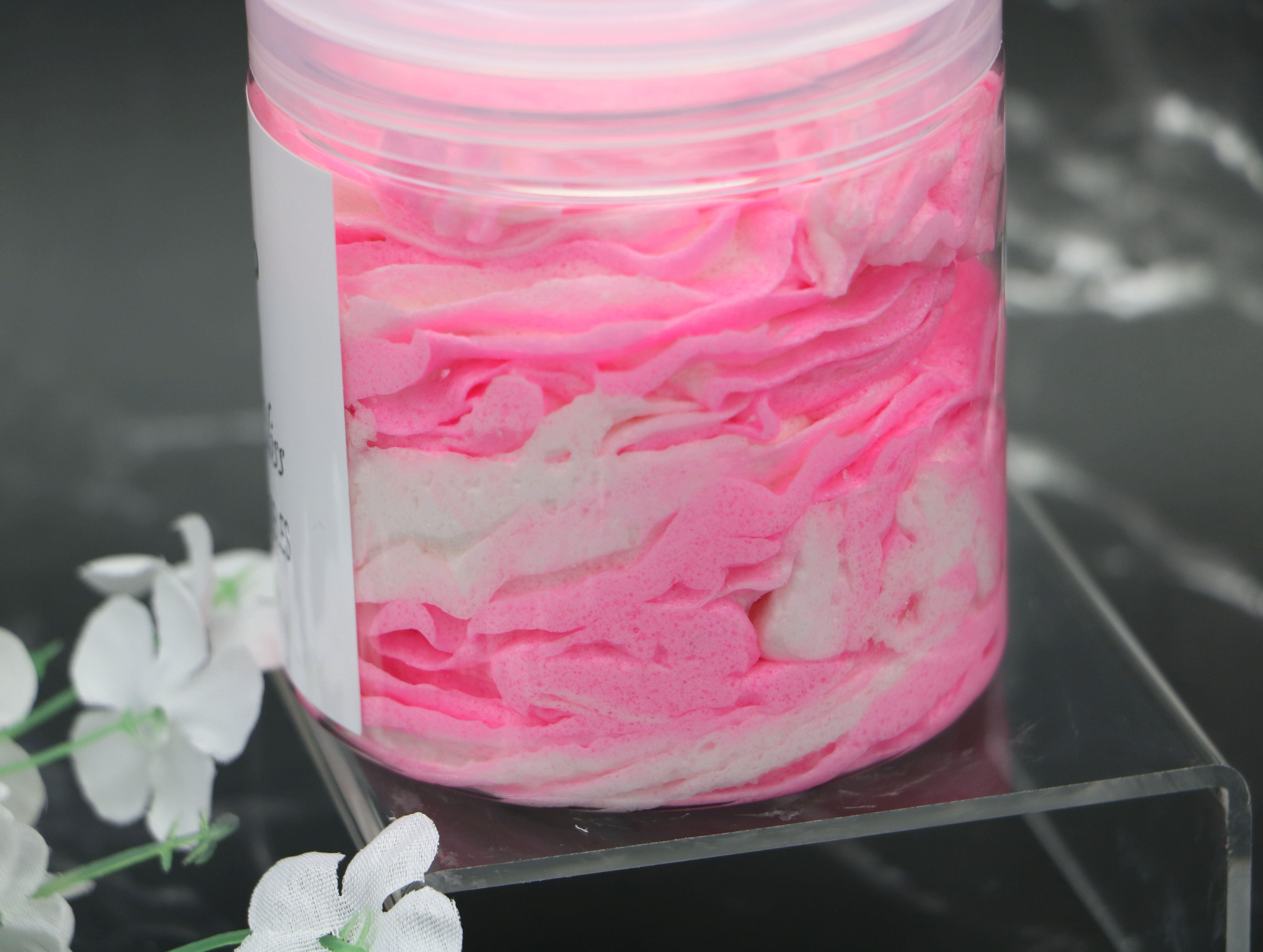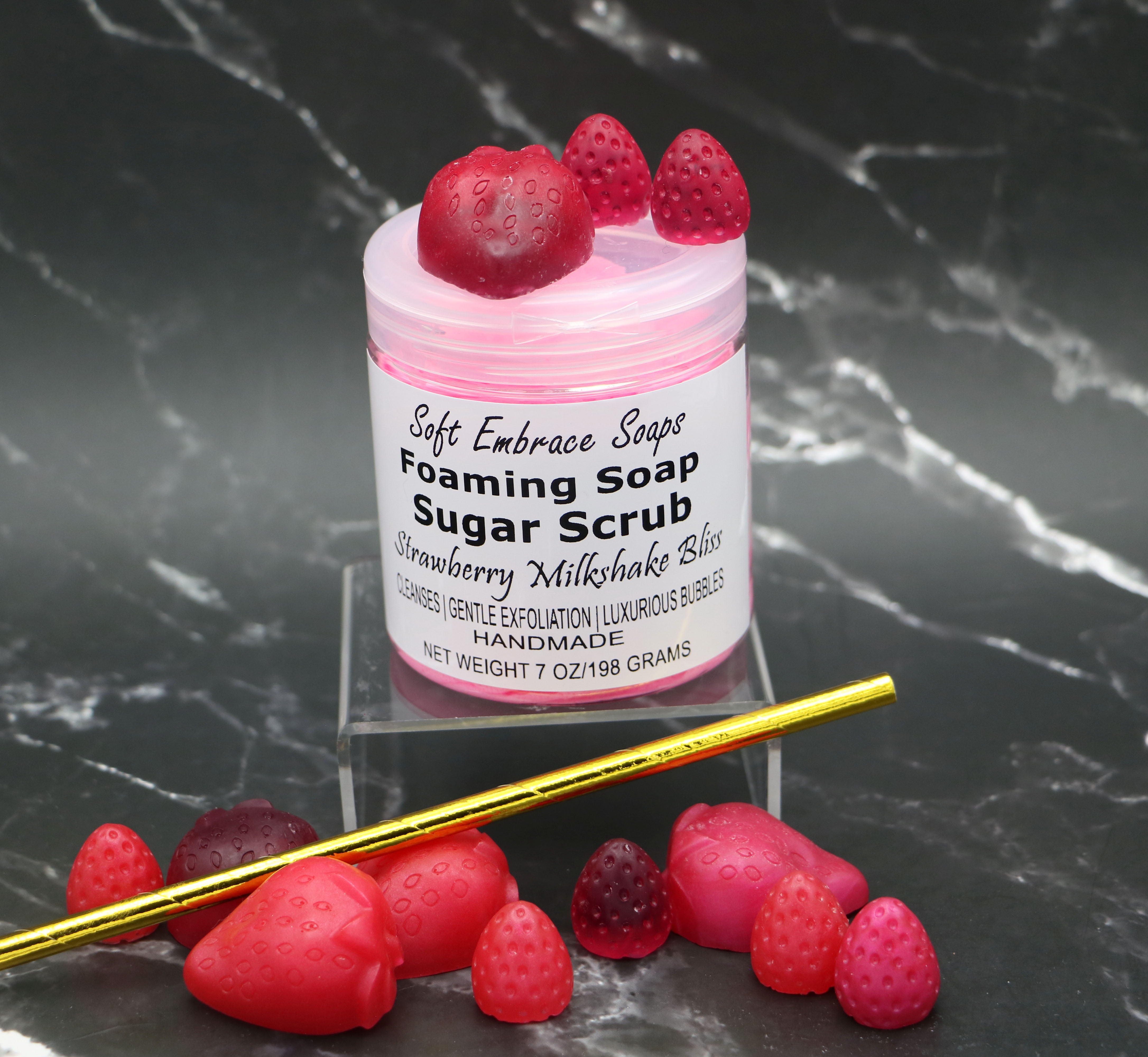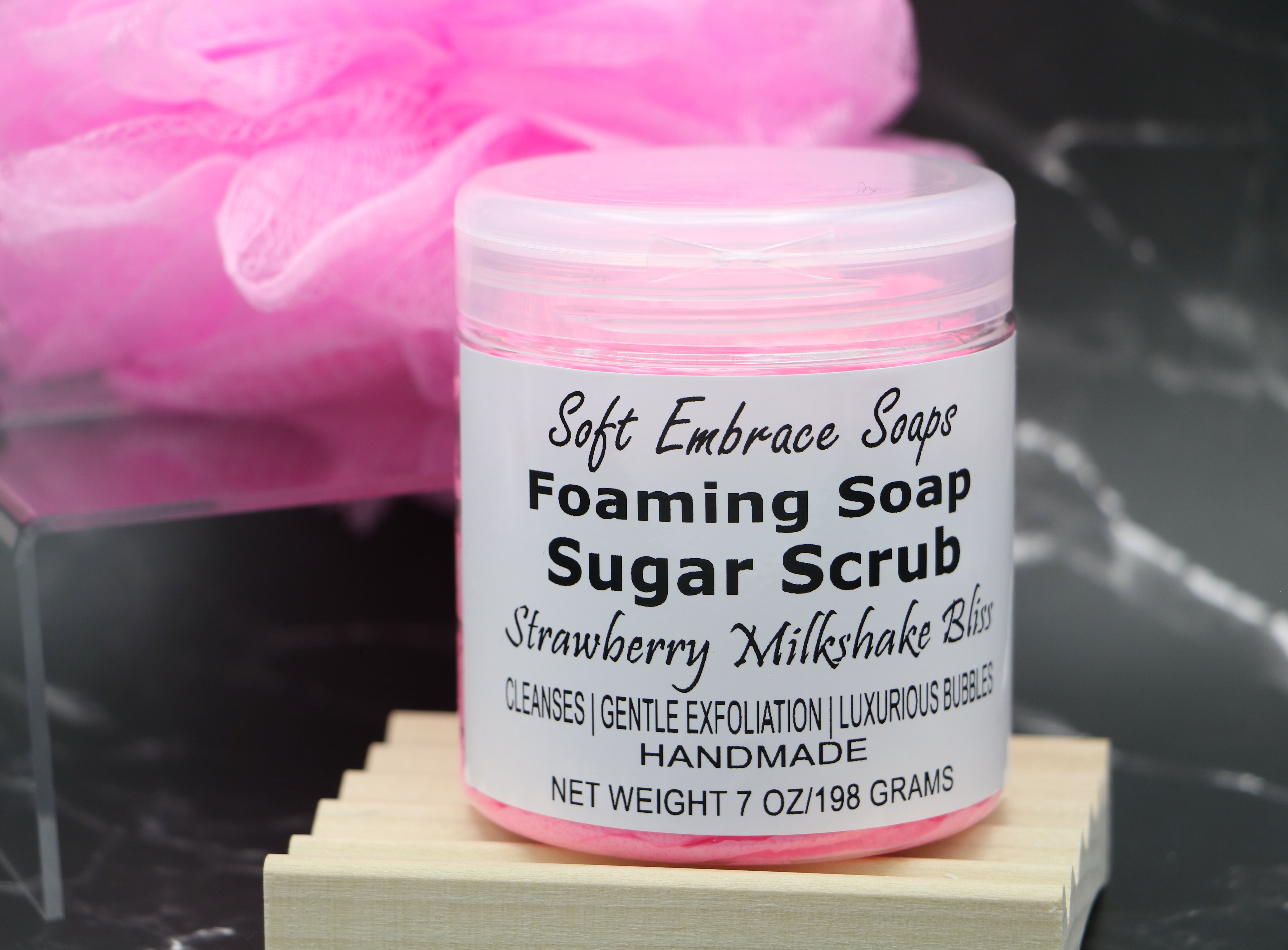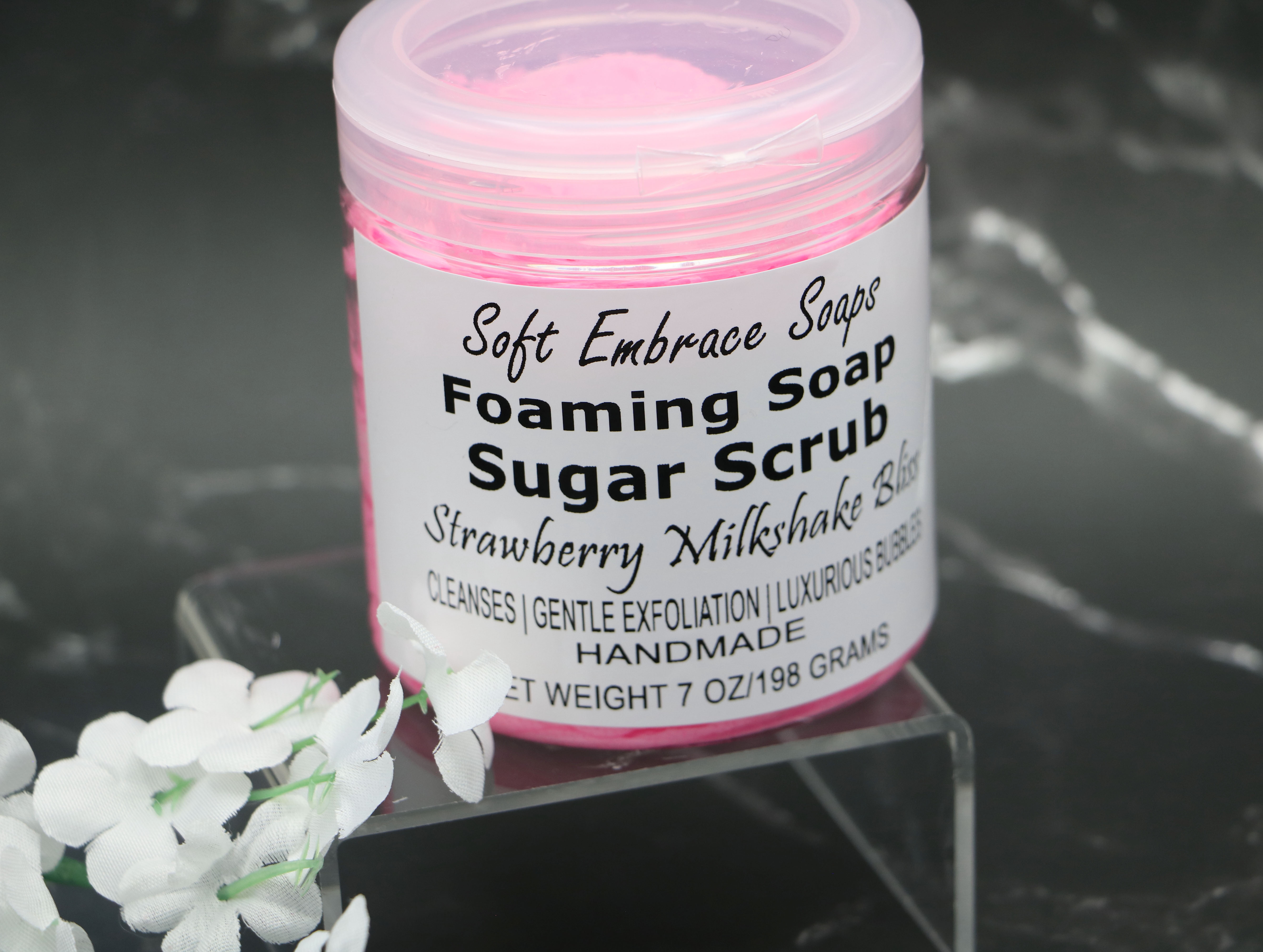 This lovely Pink & White colored scrub is scented with strawberry & vanilla fragrance oil. The two scents blended together are reminiscent of a delicious fresh seasonal strawberry milkshake. The strawberry fragrance oil is so realistic of freshly picked strawberries, that it may actually make your mouth water!