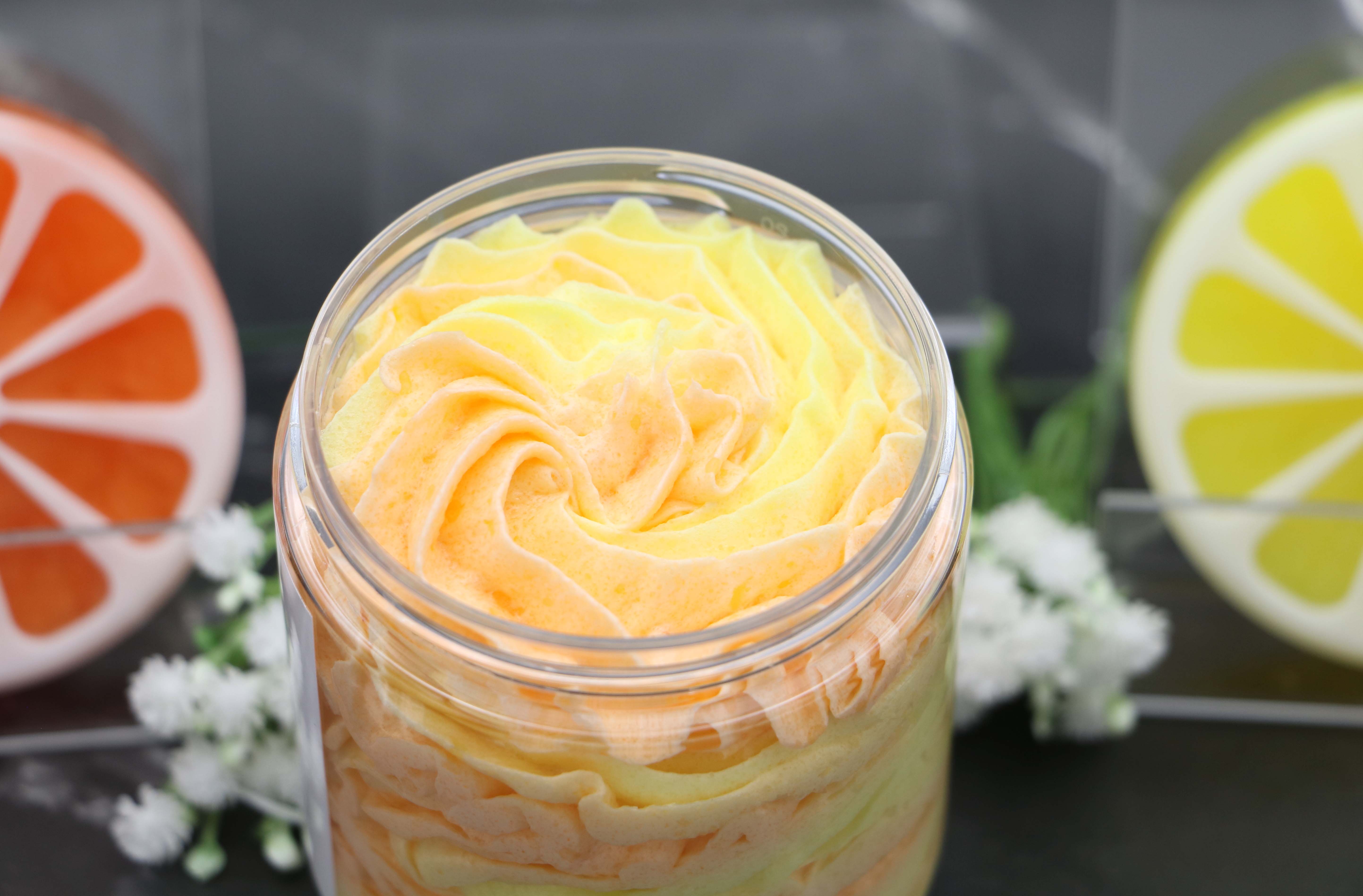 Foaming Soap Sugar Scrubs are made by combining Foaming Bath Whip with sugar & other key ingredients. I prefer to handcraft my own Bath Whip from scratch in an effort to control ingredients and not add unwanted chemicals. I then add my fragrance oils, sugar and mica colorants before piping the scrub into jars.