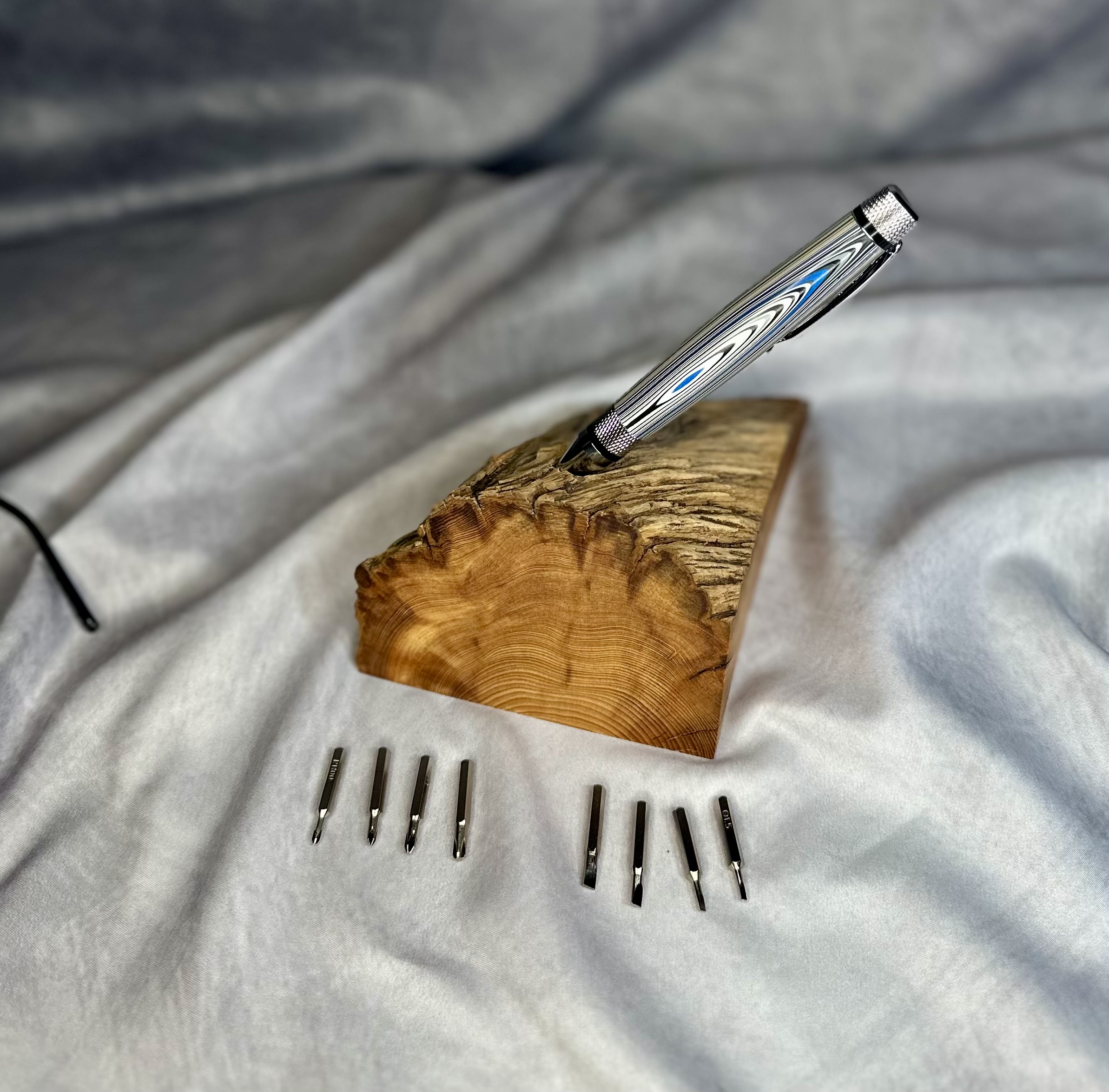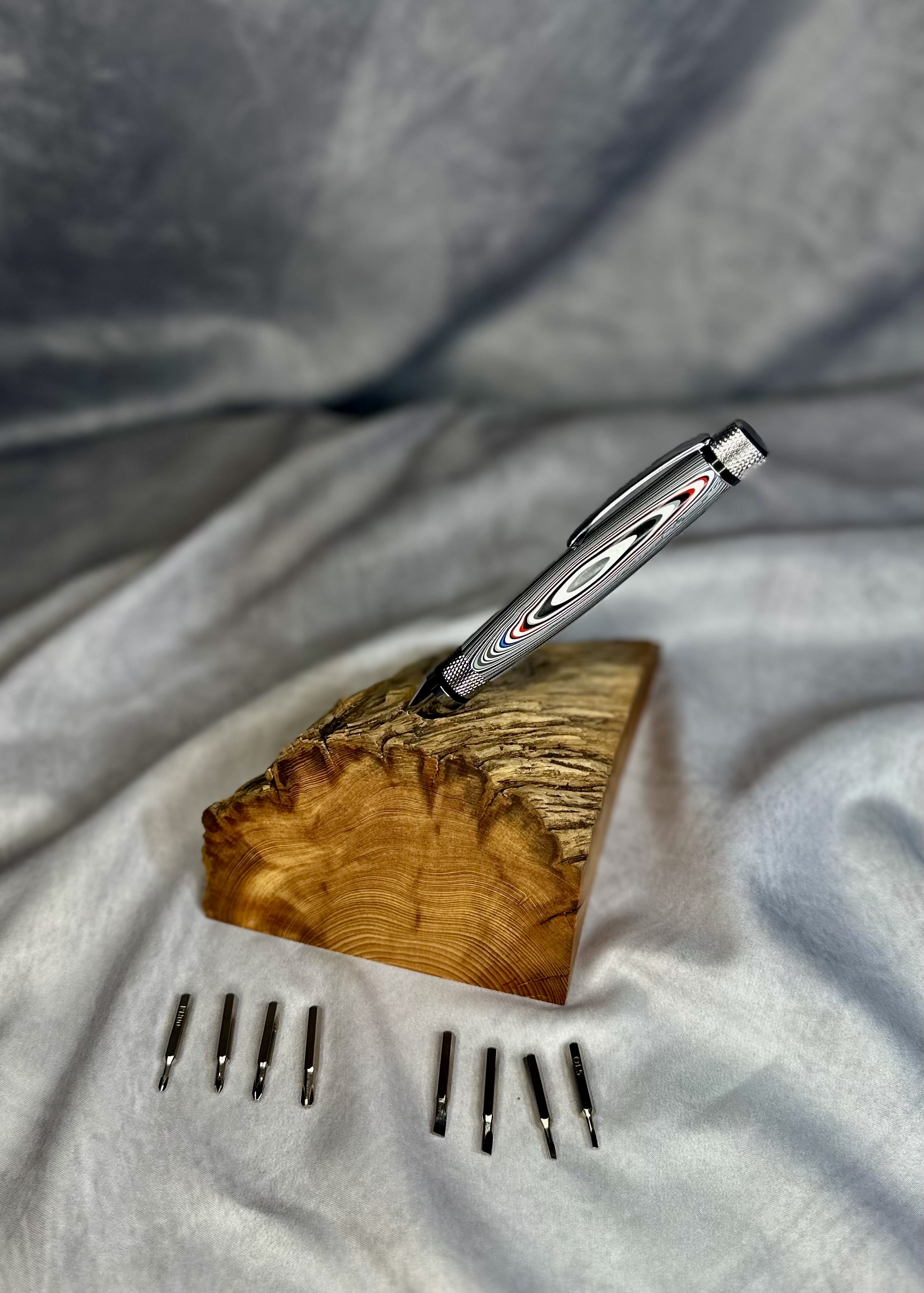 From pens and bowls to holiday décor, kitchen tools, and desk accessories, everything I make starts with one thing: exceptional material. Living in Las Vegas means I have to work hard to source great wood—but I see that as a feature, not a bug. I spend hours tracking down the right pieces, often working with other small makers across the country to find sustainable, unique woods and hybrid materials. I pride myself on pairing each one perfectly with its hardware, so the design feels complete—intentional from start to finish.