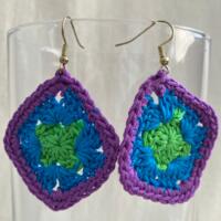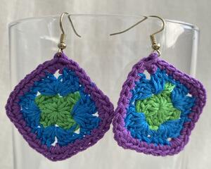 Diamond shaped crocheted earrings using a “granny” square design and cotton embroidery floss. Approximately 1-1/2 inch square.