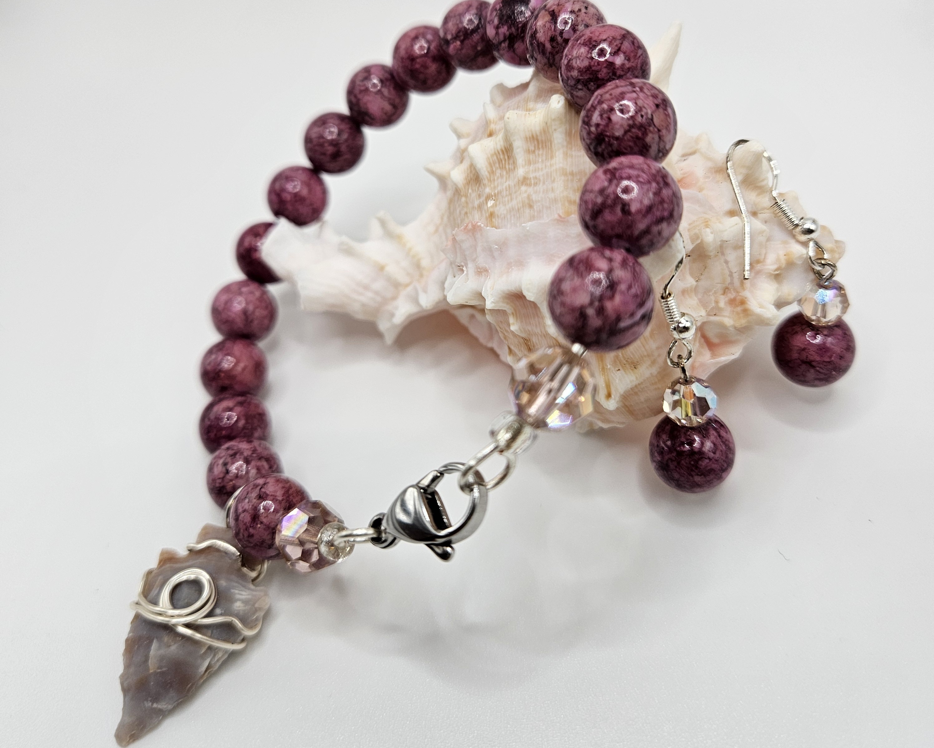 This bracelet is handmade using 10mm Sea Sediment Jasper beads in violet and purple tones