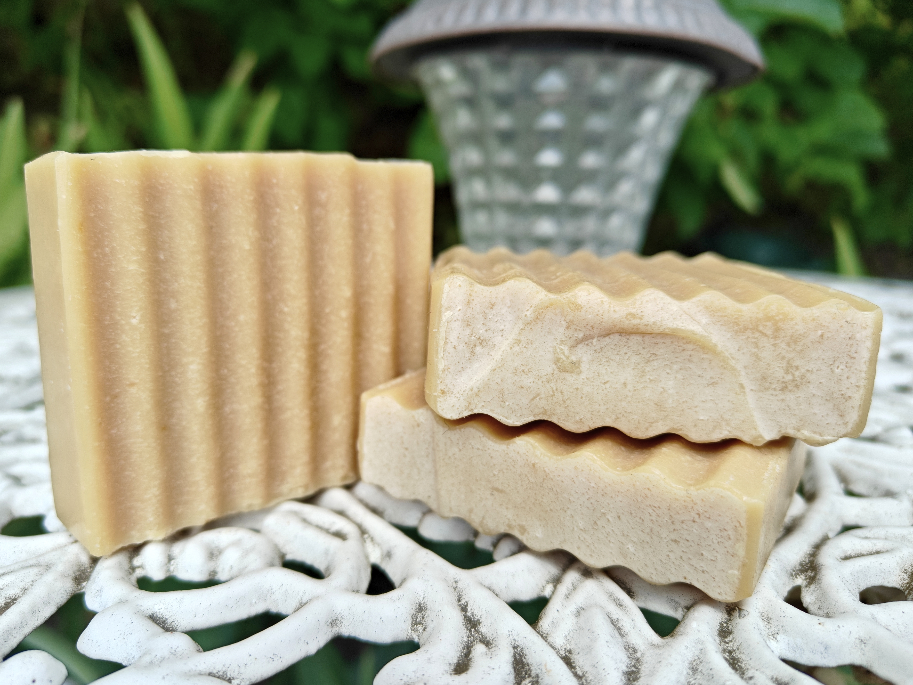 Our soap is made with a traditional "cold process" using coconut oil for lather, olive oil for moisture, sweet almond oil for vitamin E, castor oil for its anti-inflammatory properties, and sheep milk for the benefits listed above.