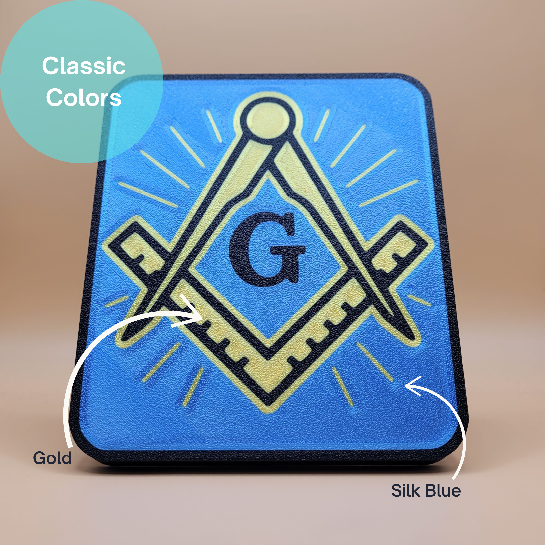 Each piece is professionally 3D printed, featuring the iconic Square & Compass emblem highlighted in classic gold accents and silk blue background. The design is raised for texture, depth, and long-lasting visibility.