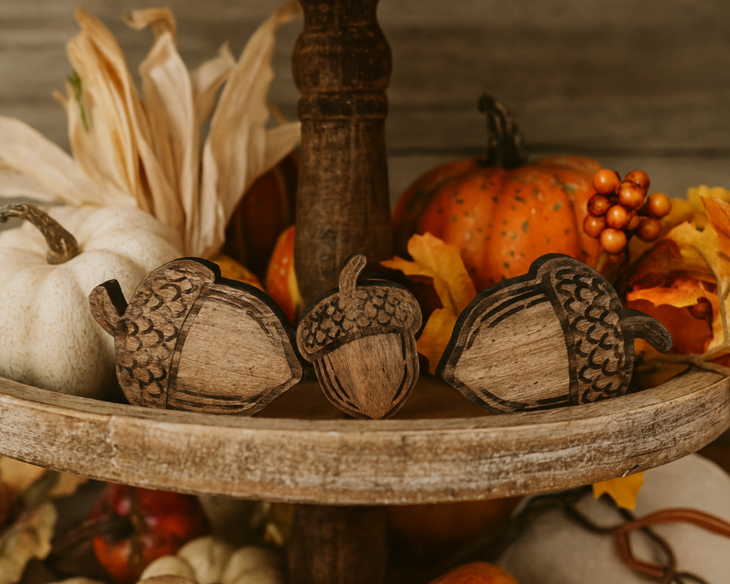 Add a touch of rustic fall charm to your home with these reclaimed wood acorns, thoughtfully crafted with engraved details that showcase their weathered, natural texture. Each piece is left unfinished for an authentic, rough-hewn look, making every acorn truly one of a kind. Perfect for farmhouse or cottage-style decorating, they bring a warm seasonal accent to tiered trays, shelves, mantels, or table displays. Available in multiple sizes and sold individually, these acorns can be styled on their own for a simple statement or grouped together for a cozy, collected look that highlights the timeless character of reclaimed wood.