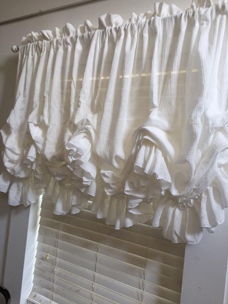 This white gauze balloon valance has a softly ruffled single ruffle. It is unlined so that it has a light and airy look. This will fit a window of up to 45 inches wide and is 32 inches long from the rod down. There is a drop down box to order for a 60 inch window. There are rings and clips on the back to adjust the length.