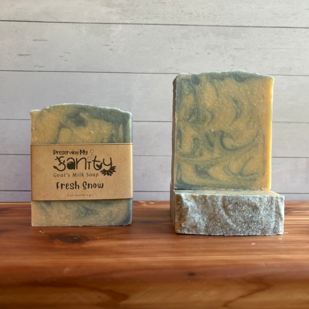 Handmade in small batches in my Minnesota kitchen, this Fresh Snow soap contains Olive Oil, Locally Sourced Minnesota Goat’s Milk, Unrefined Organic Coconut Oil, RSPO Certified Sustainable Palm Oil, Food-Grade Sodium Hydroxide, Castor Oil, Fragrance Oil (Paraben & Phthalate Free), Sunflower Oil, Mica, Biodegradable Eco-Glitter.