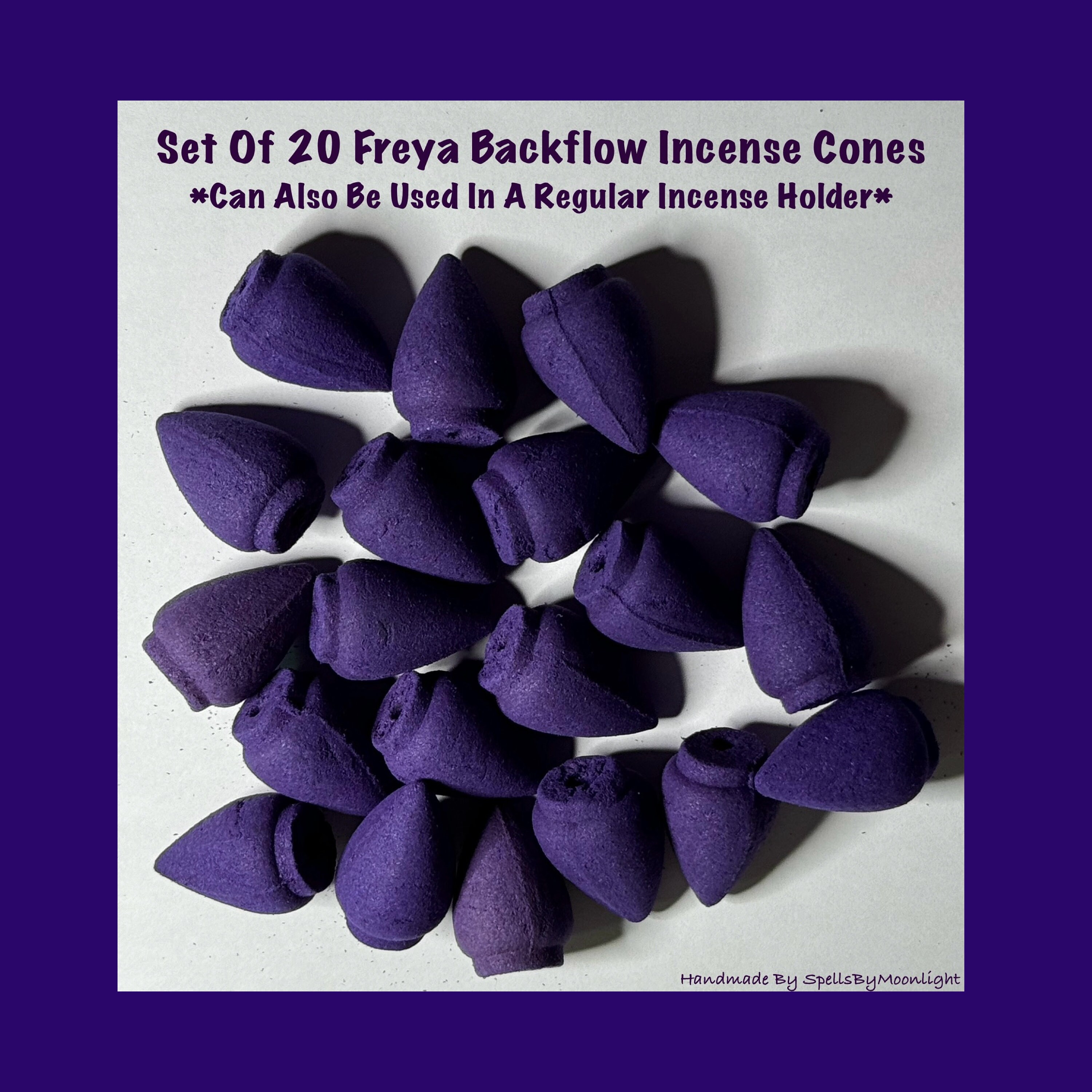 This is a Listing for 20 Freya Backflow Incense Cones. They can be used in a regular Incense Holder too, but they will burn a little faster and you wont get the backflow effect! Use these Incense Cones to honor The Goddess Freya/Freyja. You can use them to invoke Freya for her help with spells. They can be used as an offering for Freya as well.
