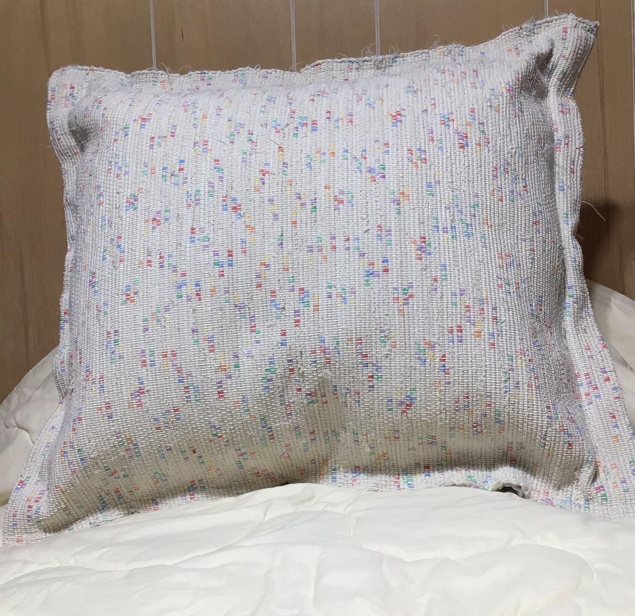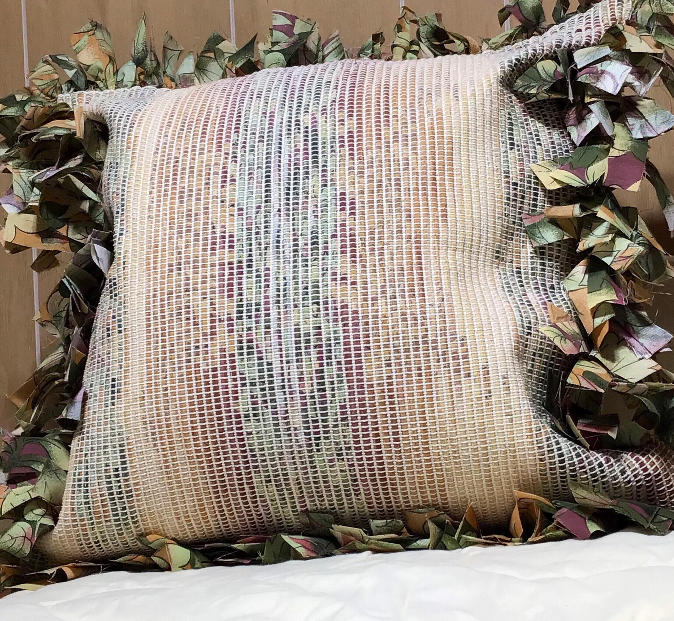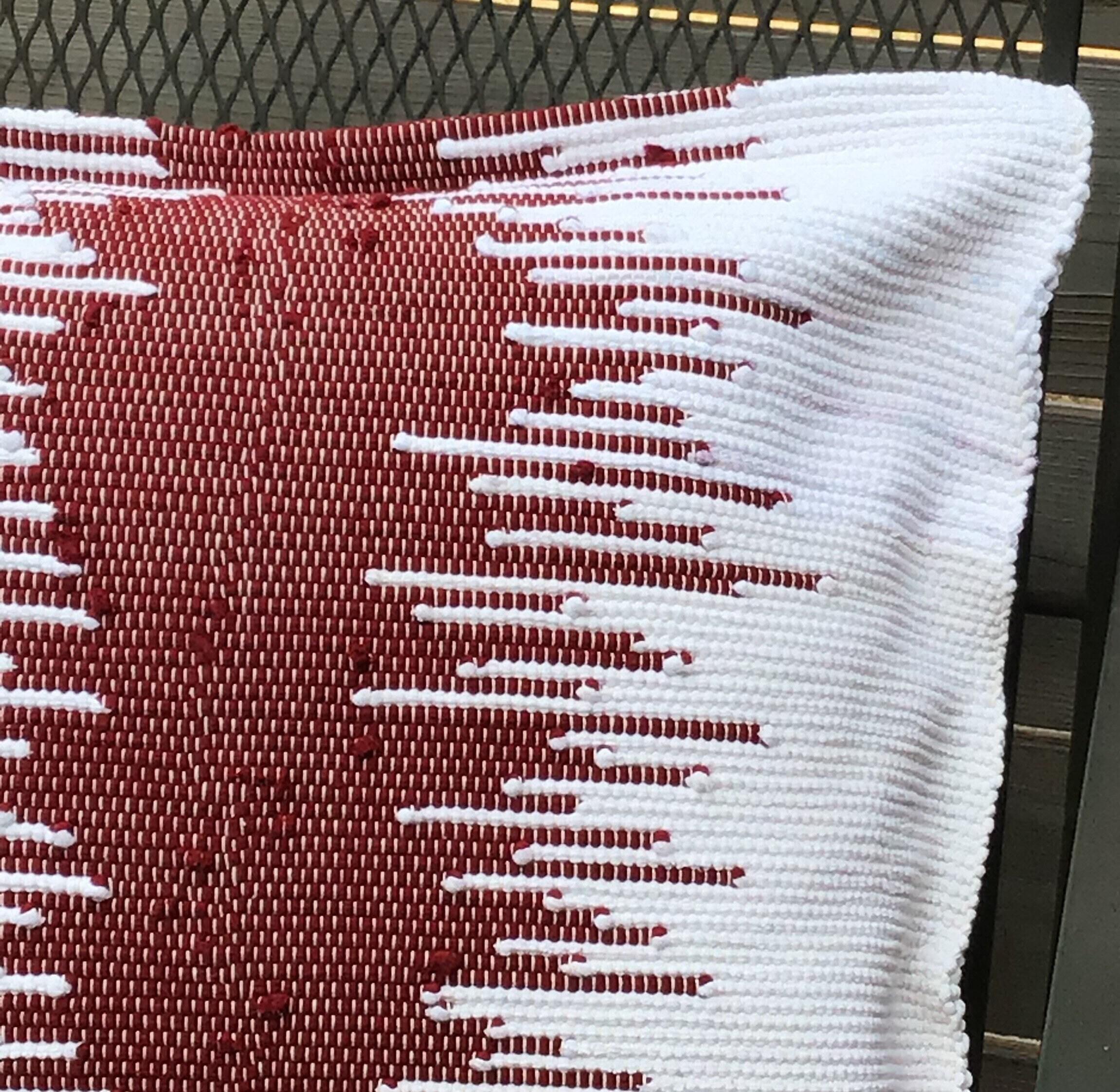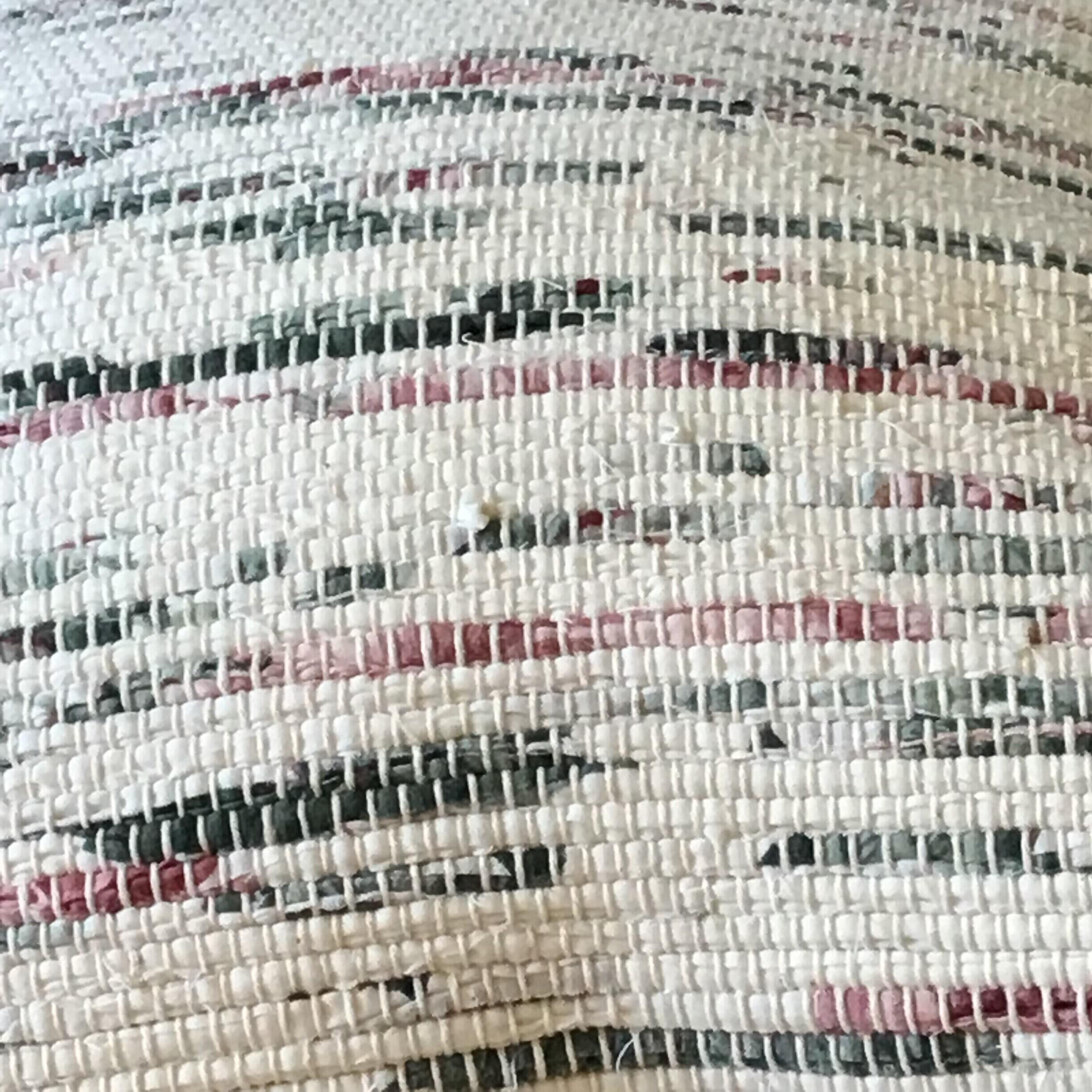 Woven on my 1930’s Union rug loom, this pillow is constructed using the same poly-cotton warp thread I use for rag rugs. The poly-cotton blend is more durable than all cotton. The weft consists of a rescued remnant of fabric from an estate sale. Photo #6 shows this fabric.